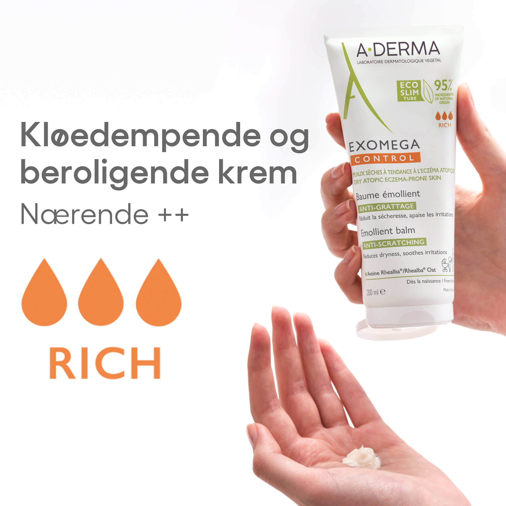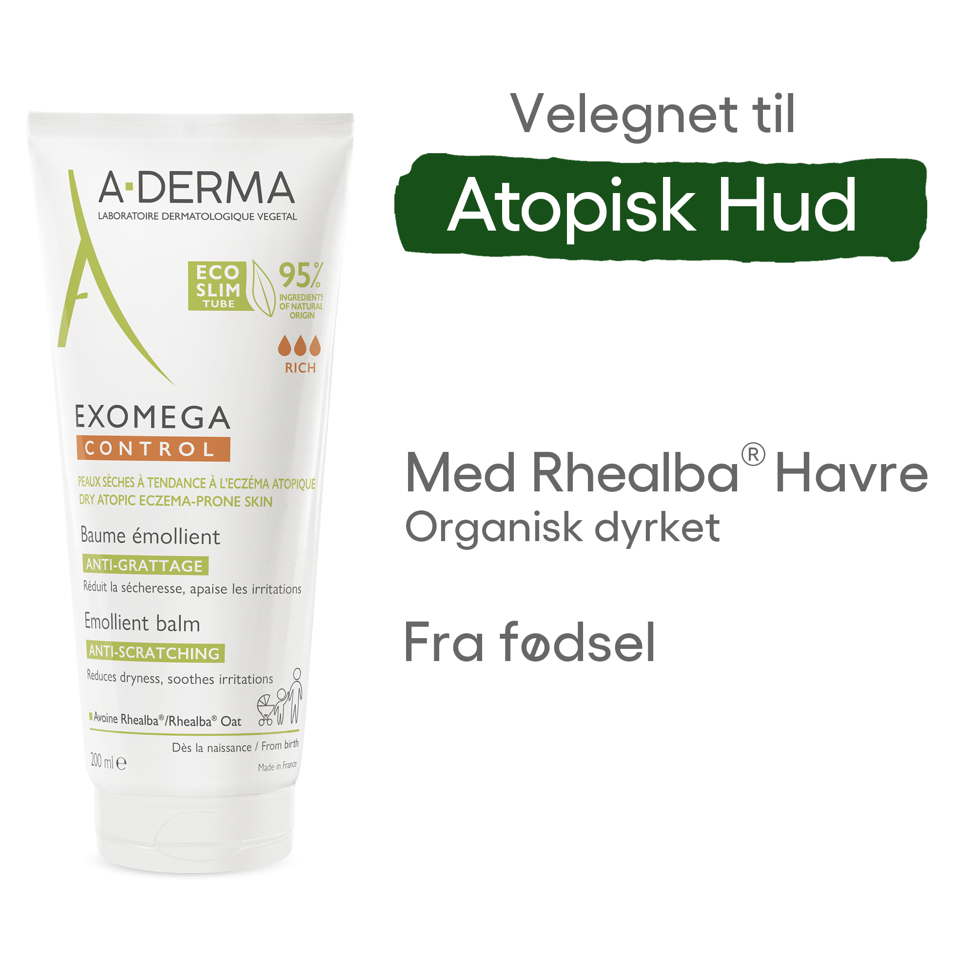 A-Derma Exomega Control Balm er en fet fuktighetskrem med en myk og meget nærende formulering som fukter, styrker og mykgjør ekstra tørr hud. Formulert med 95 % naturlige ingredienser, deriblant Rhealba® havreekstrakt som har en spesielt gunstig effekt på tørr og irritert hud samt eksem. Kremen virker umiddelbart beroligende og kløedempende på huden og reduserer rødhet og irritasjon forårsaket av tørrhet, med kun én påføring om dagen. Den rike konsistensen bidrar til å gjenoppbygge og styrke hudbarrieren, øker hudens fuktighets- og fettstoffbalanse og etterlater huden myk og behagelig. Hudkremen har høy toleranse, virkning og sikkerhet, og kan brukes til hele familien fra fire dager etter fødsel. Kremen anbefales for daglig pleie til ansikt, bøyeledd, kropp og hender, både ved eksemutbrudd og som fuktighetspleie i «hvileperioder».