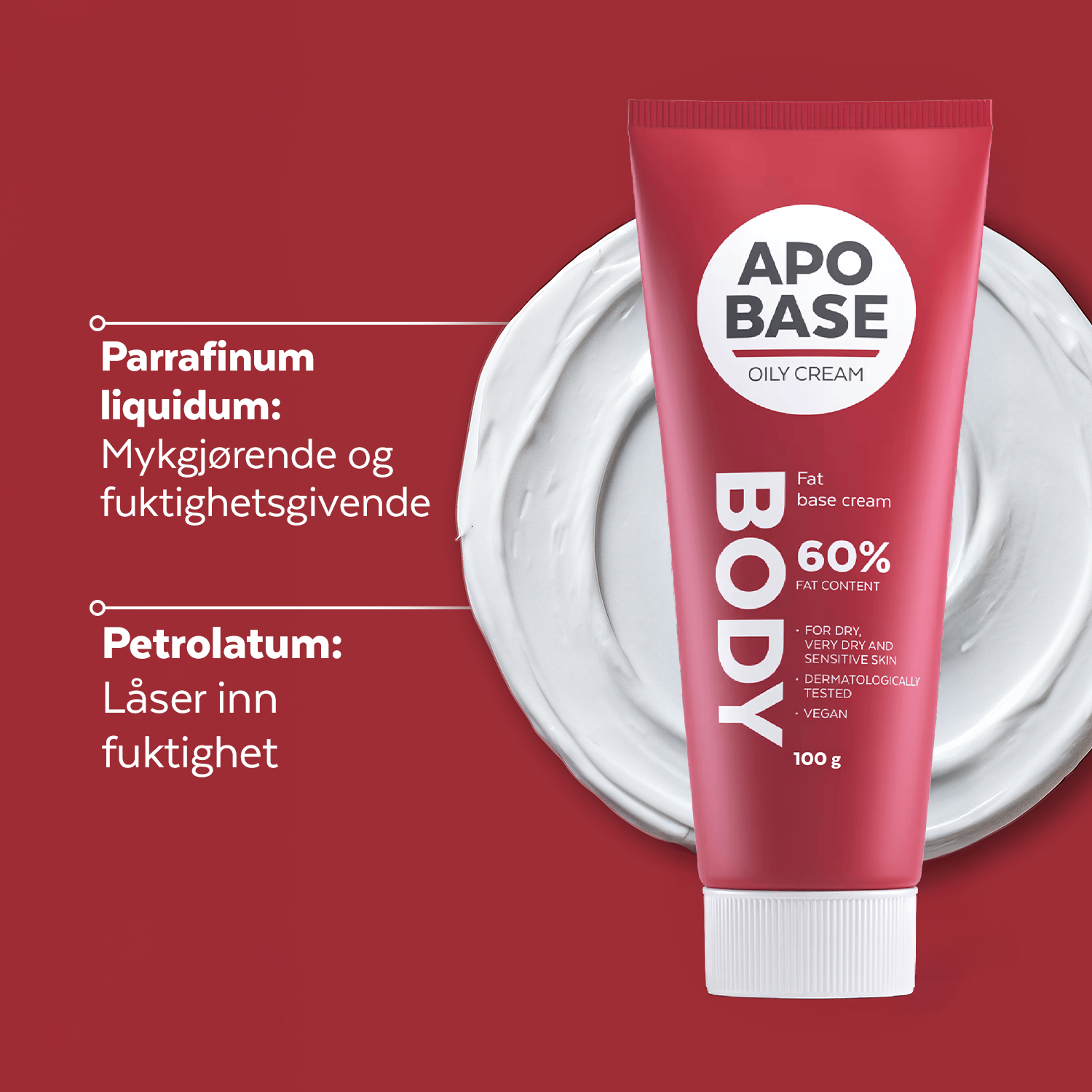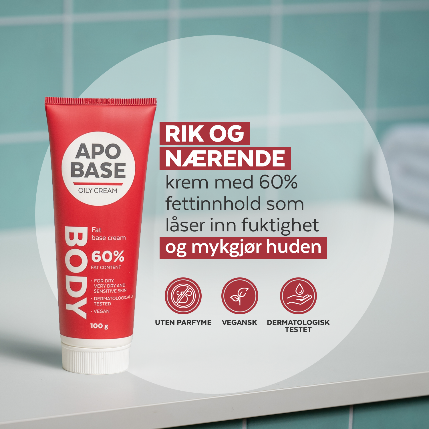 Apobase fet krem (rød) er en mild fuktighetskrem med høyt fettinnhold beregnet ved lett eksem.