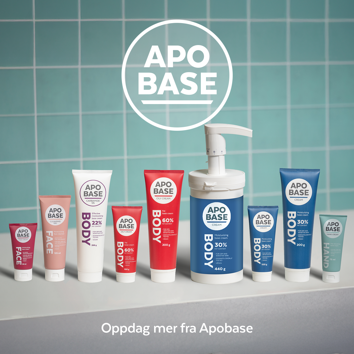 Apobase er utviklet i samarbeid med nordiske dermatologer og har pleiet huden i over 40 år. Apobase brukes forebyggende og pleiende til problematisk, tørr og sensitiv hud, eller til hud som har bruk for ekstra pleie f.eks. i vinterhalvåret. Alle produktene er uten parfyme og kan brukes av hele familien.