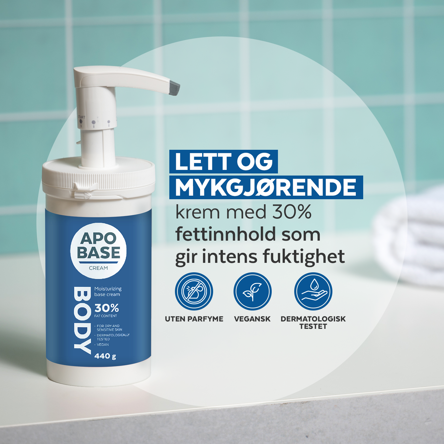 Apobase er en fuktighetsbevarende og mykgjørende krem for hele kroppen. Velegnet for tørr og sensitiv hud, samt eksemhud. Fettprosent: 30 %.