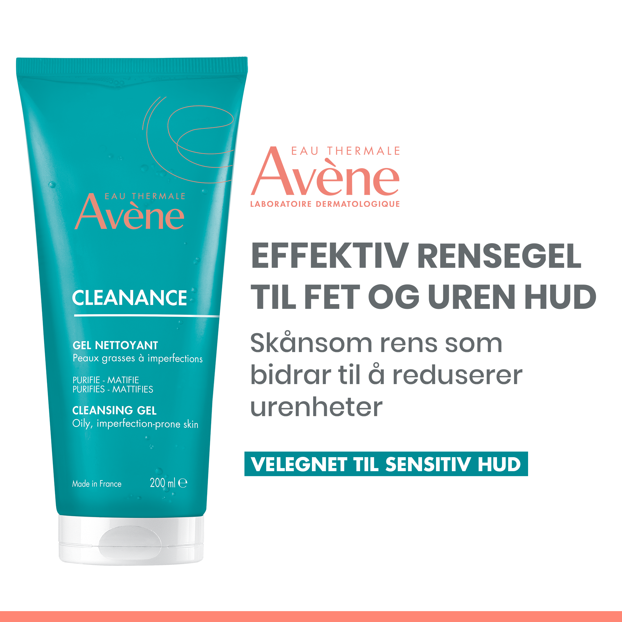 Avène Cleanance Cleansing Gel er en skånsom rensegel for daglig vask av ansiktet. Den løser opp smuss, overskuddstalg og lett makeup, og etterlater huden ren og mindre blank. Formelen inneholder Comedoclastin og sink som bidrar til å redusere olje og holde urenheter i sjakk. Avènes termalkildevann virker beroligende og mykgjørende. Konsistensen skummer lett, skylles av uten å føles stram, og passer fint som første steg i hudpleierutinen. Bruk morgen og kveld: massér inn på fuktet hud, skum opp og skyll grundig. Mild duft. Dette er en enkel og effektiv ansiktsrens for deg som ønsker en ren og matt følelse gjennom dagen.