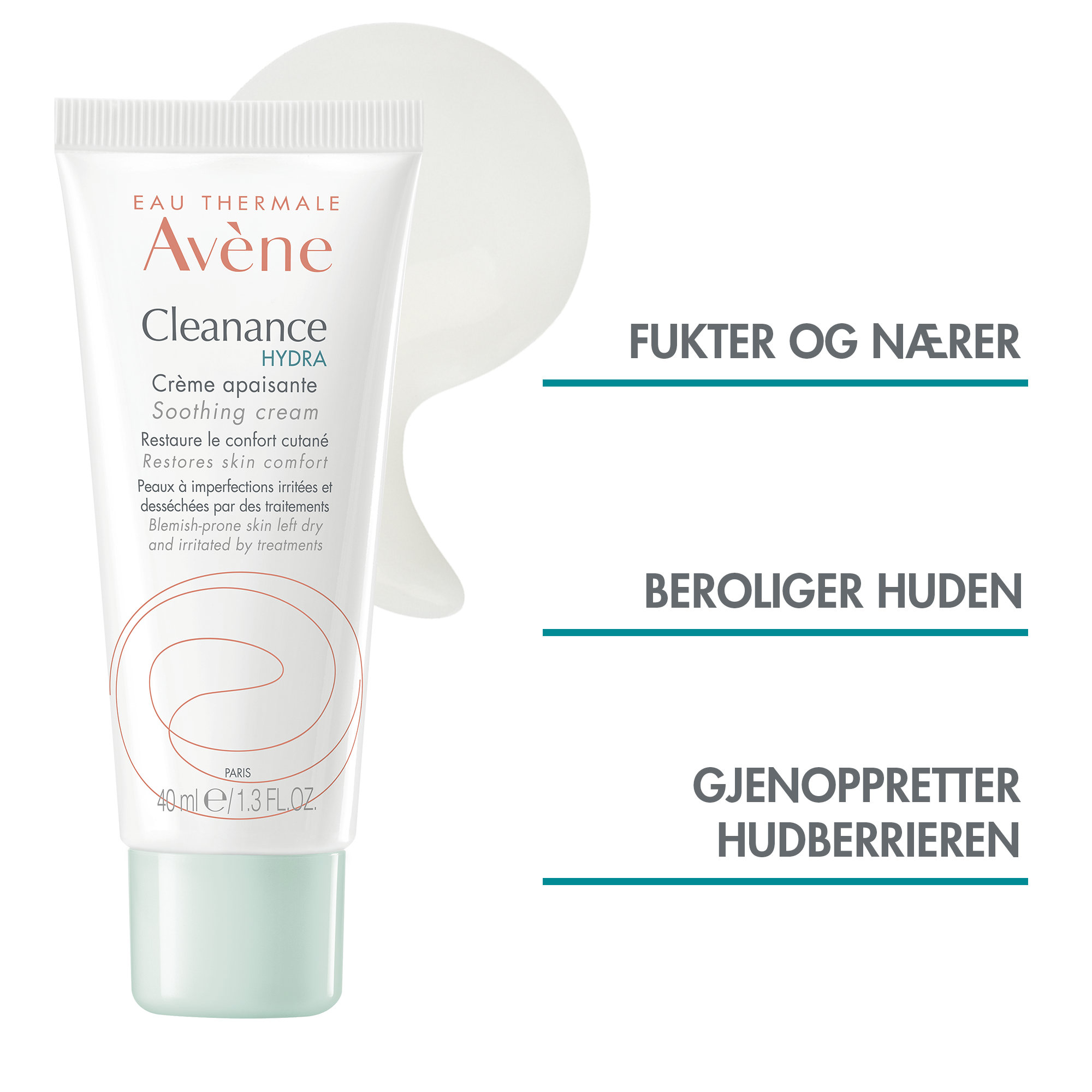 Avène Cleanance Hydra dagkrem gir rikelig fukt, roer ned og styrker hudbarrieren når huden er tørr og sår under aknebehandling.