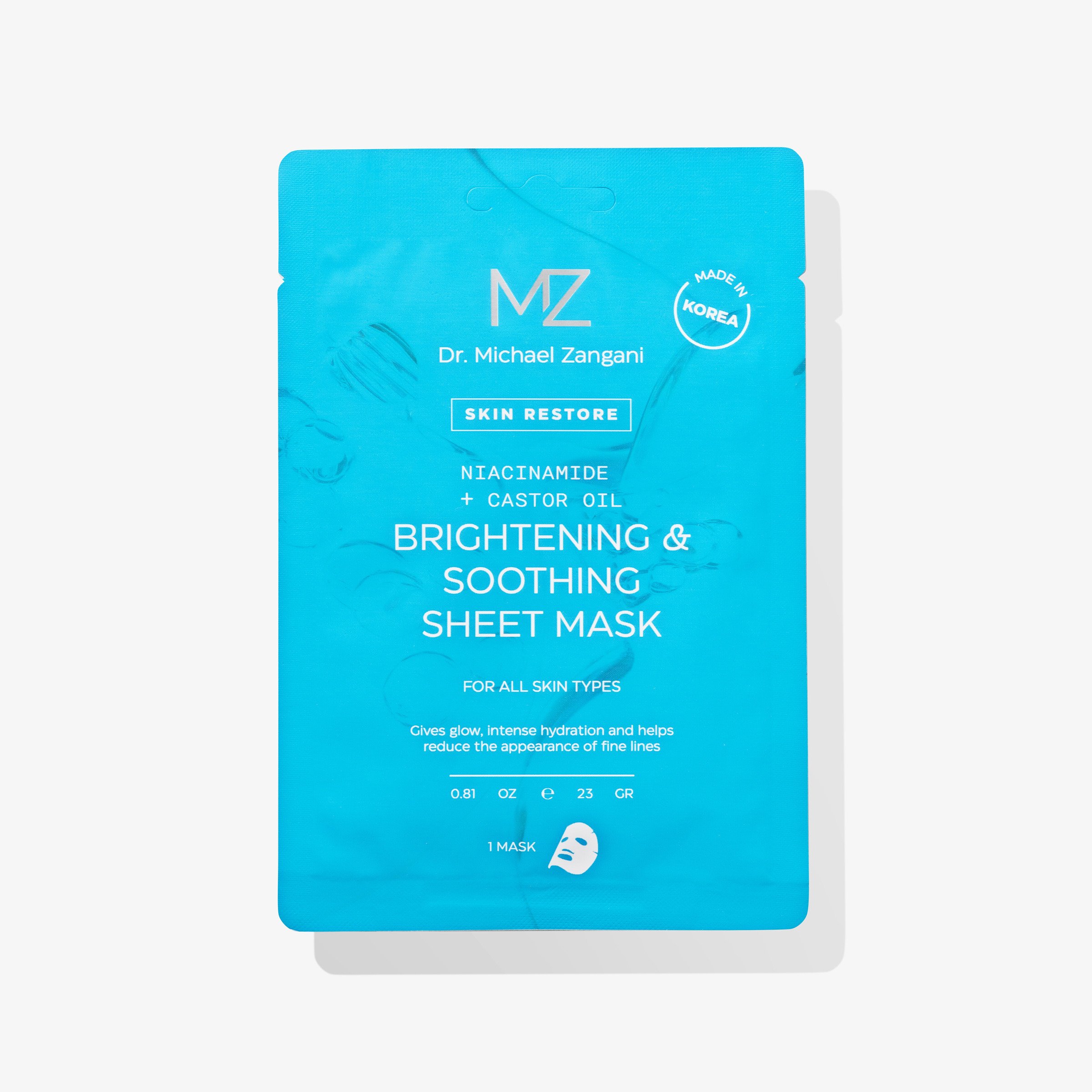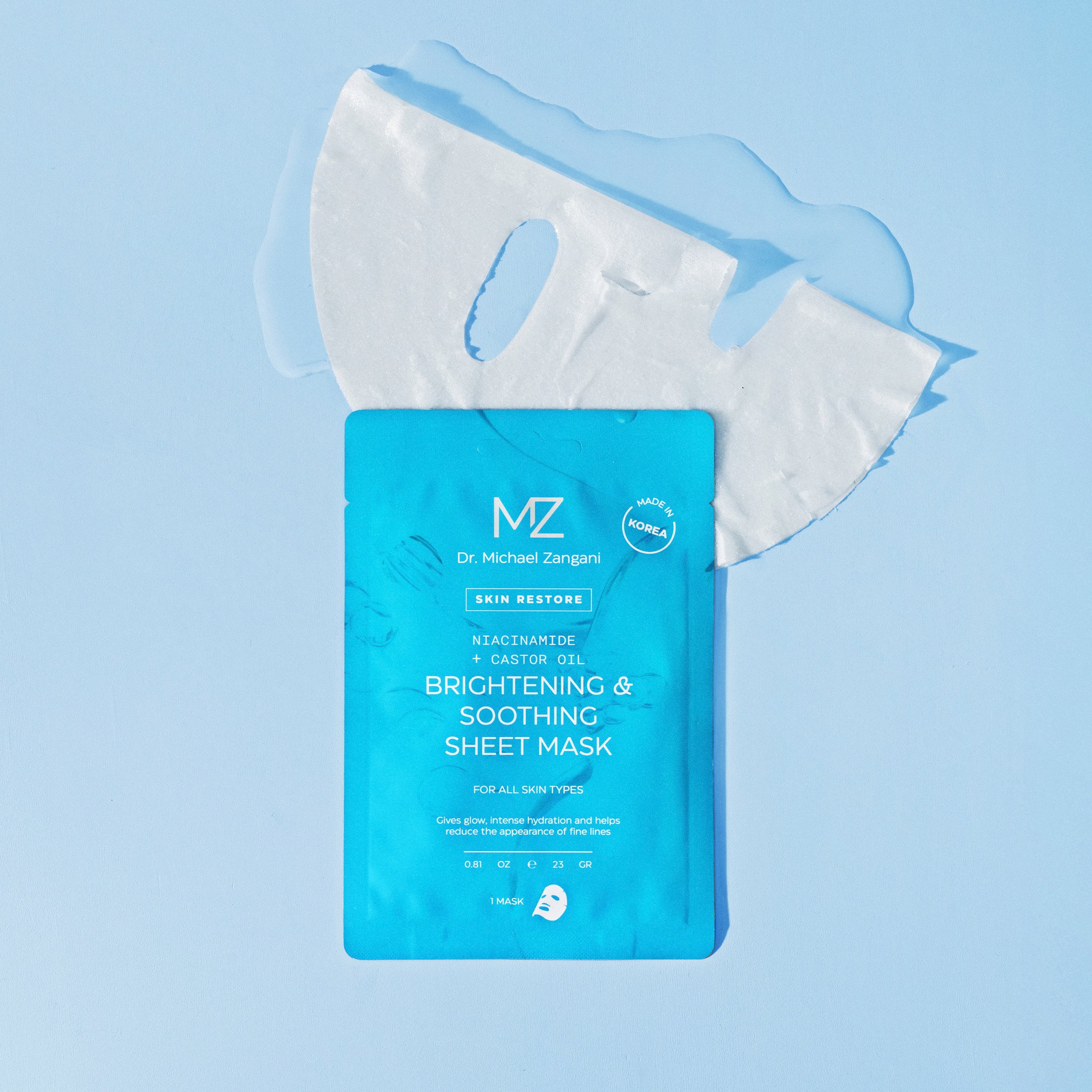 Dr. Michael Zangani Brightening & Soothing Sheet Mask gir intensiv fuktighet og bidrar til at huden føles fresh, rolig og balansert. Ansiktsmasken legger seg enkelt på huden og er perfekt å bruke når huden trenger litt ekstra pleie. Formulert med niacinamid som bidrar til en jevnere hudtone og styrker hudbarrieren, samt vitamin C som gir glød og vitalitet. Aloe vera og centella asiatica virker lindrende og bidrar til å roe ned sensitiv hud, mens castor oil bidrar til å låse inn fukt og etterlater huden myk og smidig.