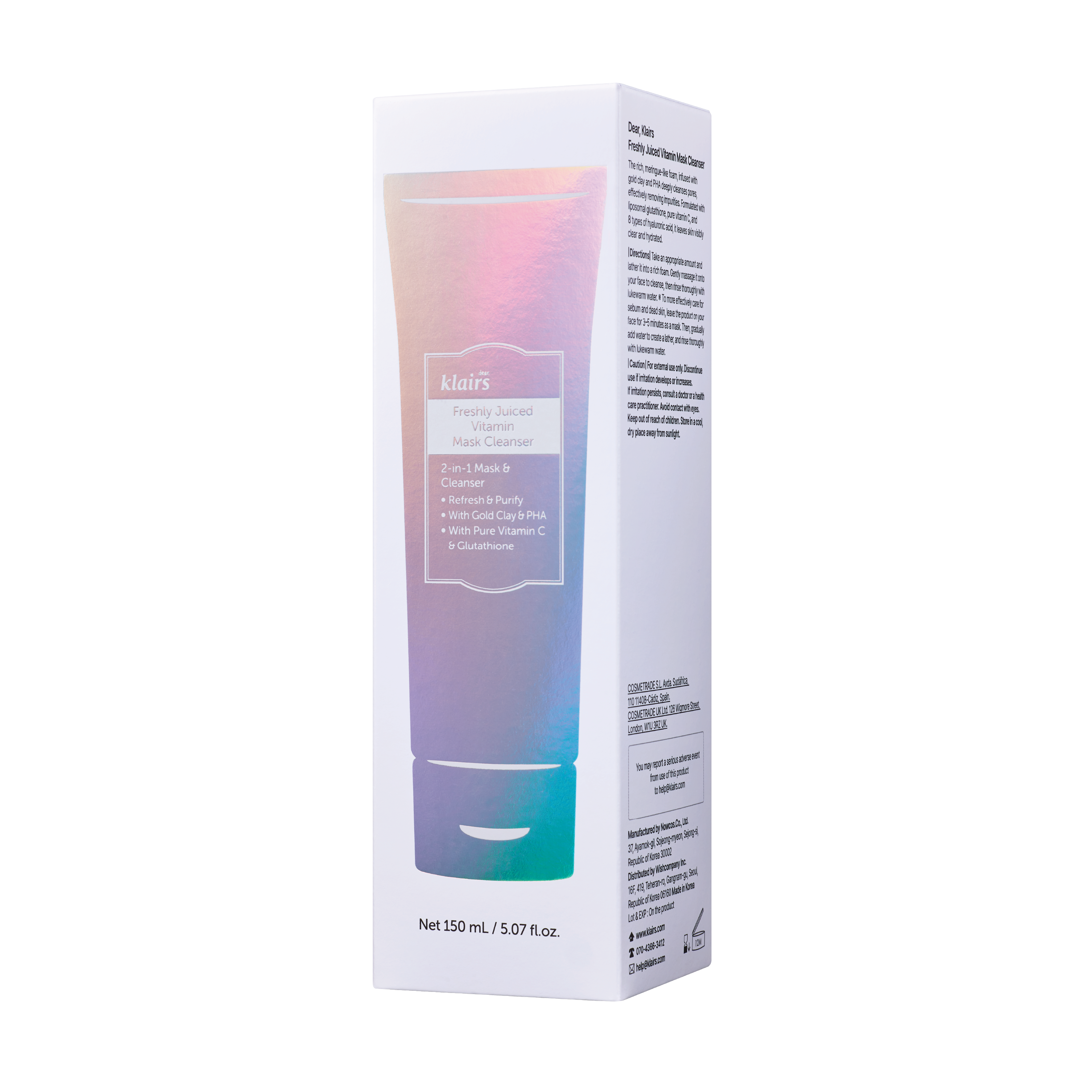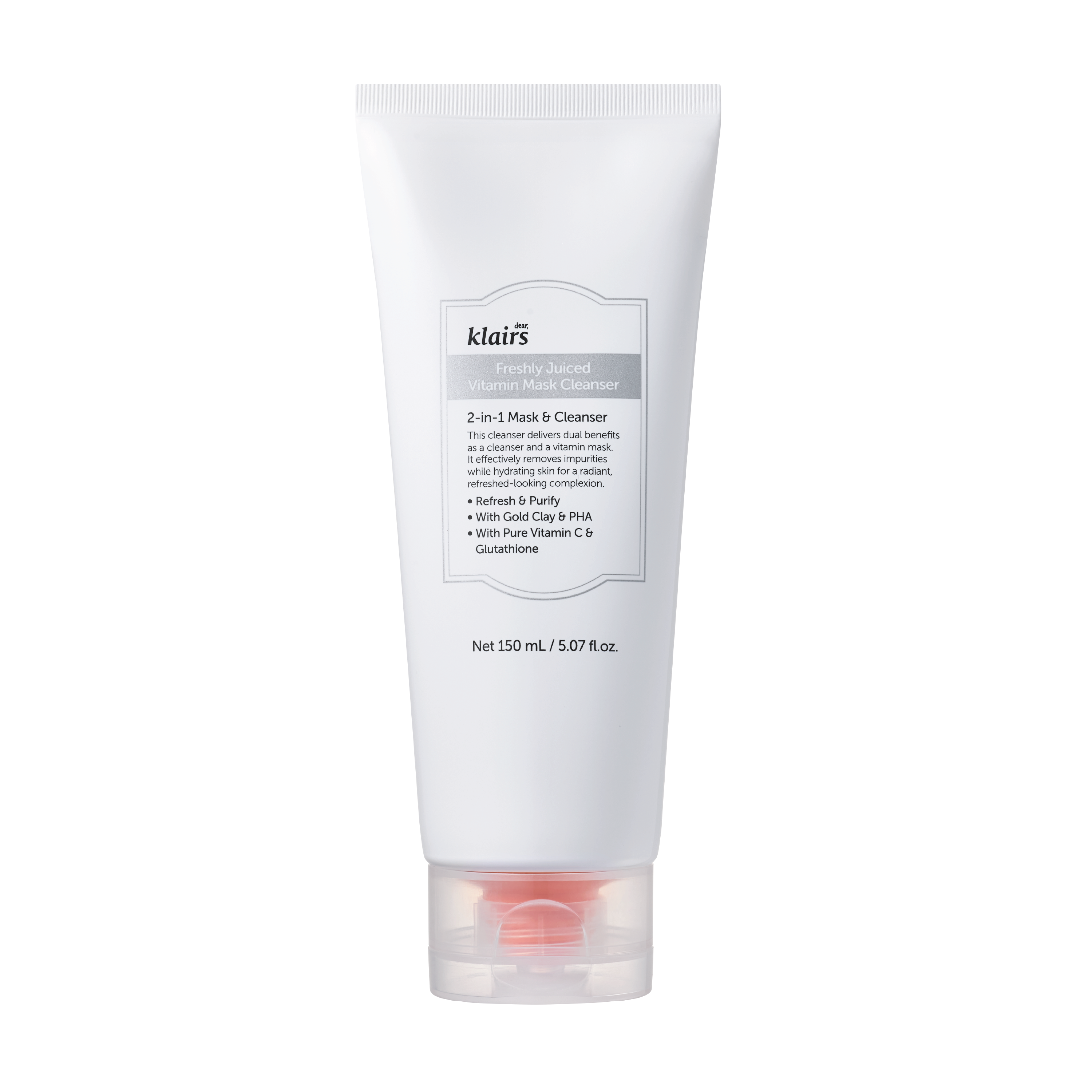 Klairs Freshly Juiced Vitamin Mask Cleanser kombinerer en fyldig, marengslignende formel med effektiv rens og pleie. Ansiktsmasken skummer opp til et rikt skum som fjerner smuss, talg og sminke, samtidig som huden etterlates hydrert og klar. Den kan brukes som en ansiktsrens eller som en dyptrensende maske som løser opp tette porer før skummet aktiveres. Formelen er beriket med vitamin C, glutation og niacinamid, som fremmer en naturlig glød og en jevnere og klarere hudtone. Kaolin-leire absorberer overflødig talg og renser porene uten å tørke ut huden, mens glukonolakton (PHA) eksfolierer huden mildt og bidrar til en forbedret hudtekstur. Åtte typer hyaluronsyre tilfører fuktighet på flere nivåer og bidrar til økt smidighet og komfort. Botaniske ekstrakter som neem, tulsi, gurkemeie og rødalger virker beroligende og støtter hudbarrieren. Ansiktsmasken er dermatologisk testet for sensitiv hud og dokumentert ikke-irriterende, med klinisk dokumentert effekt på dyprens av porer og synlig forbedring av porenes overflate, dybde og volum.