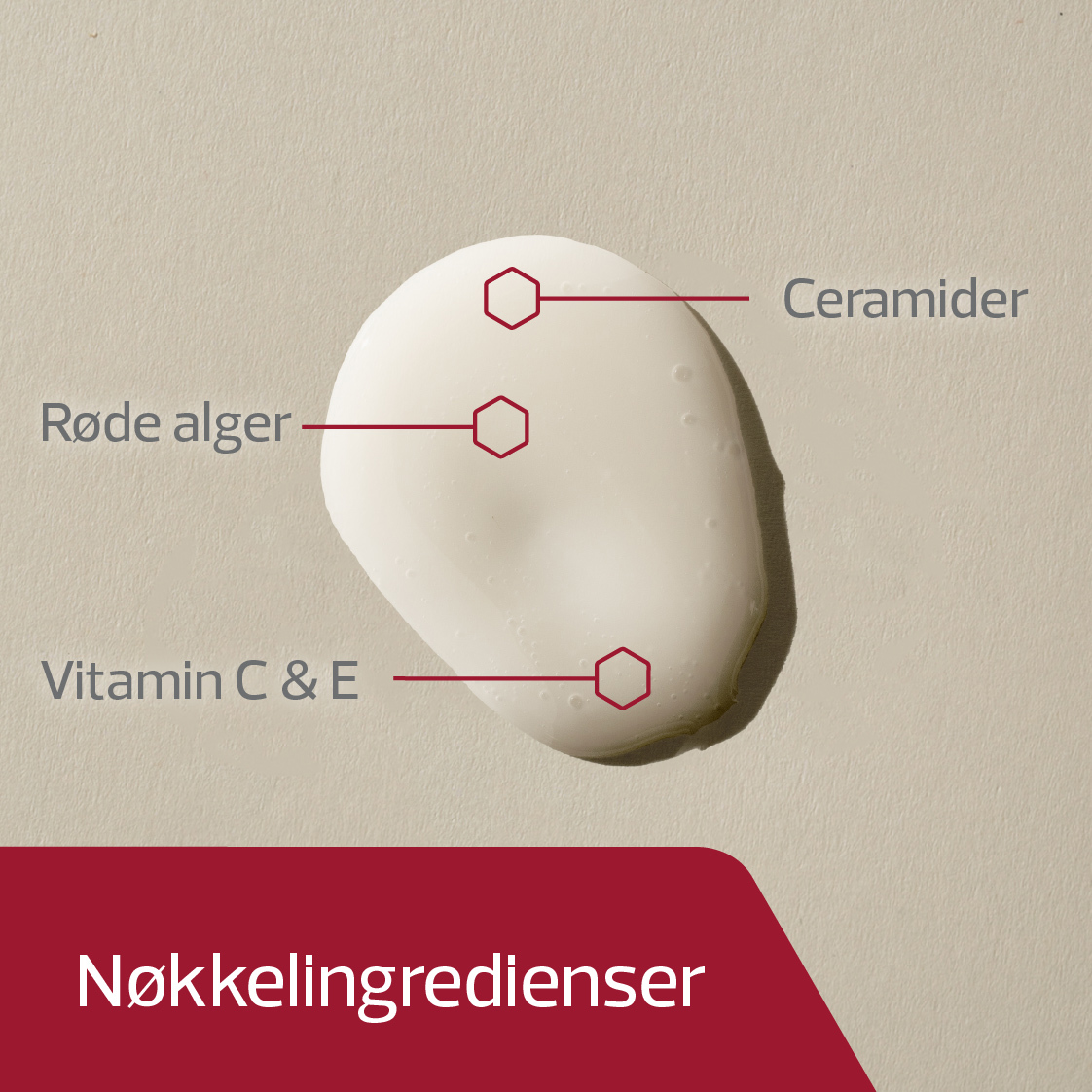 - Inneholder ceramider, vitamin E, vitamin C og røde alger.