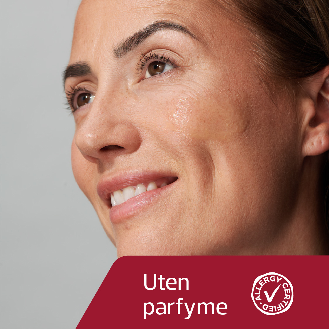 Passer best til tørr og sensitiv hud. Uten parfyme. Hypoallergen. Testet under dermatologisk kontroll. Allergisertifisert med Allergy Certified.