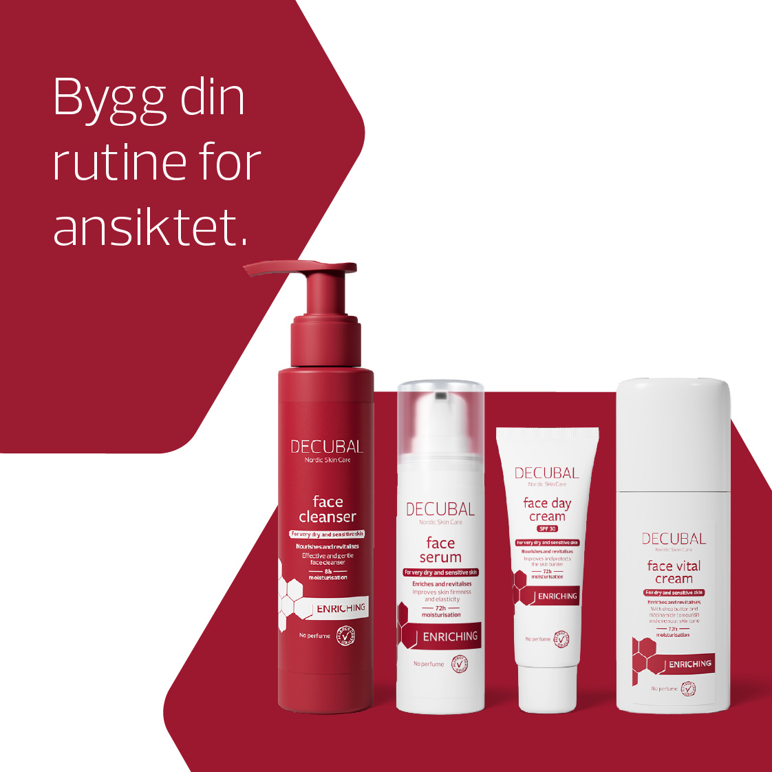 Decubal Enriching Face Cleanser er formulert for å gi en mild, men effektiv rens, og er spesielt utviklet for hud som trenger ekstra pleie. Ansiktsrensen er beriket med ceramider, vitamin E og vitamin C, samt røde alger som bidrar til en sunnere hud. Rensen er klinisk bevist å styrke hudbarrieren og gi en fuktighetsgivende effekt i opptil 8 timer. Formelen er ikke-komedogen og egnet for daglig bruk. Kommer i en praktisk pumpeflaske som gir en ekstra enkel påføring.