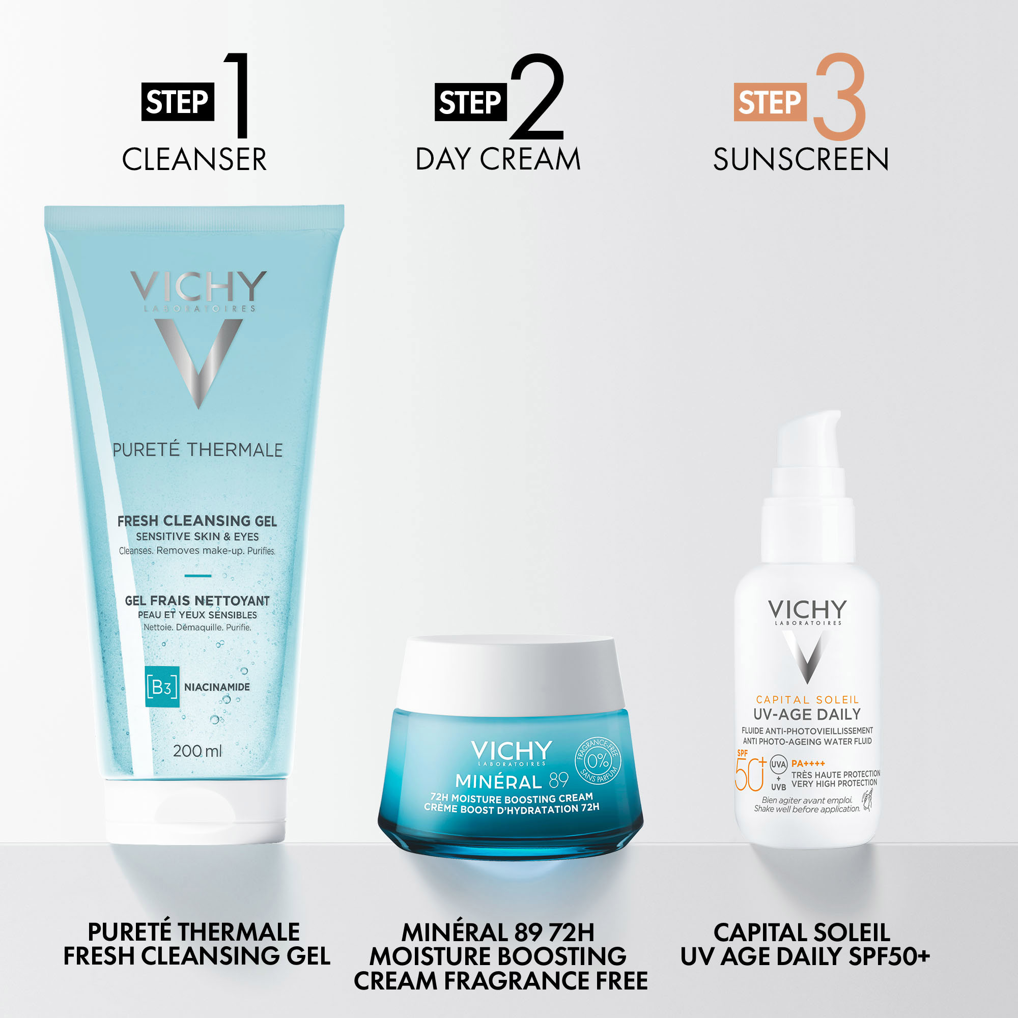 Vichy Pureté Thermale Fresh Cleansing Gel er en mild ansiktsrens som effektivt fjerner sminke, smuss og daglige urenheter. Gelen kombinerer Vichys vulkanske vann, som bidrar til å berolige og styrke hudbarrieren, med niacinamid som bidrar til å redusere porer og urenheter og jevne hudtonen. Salisylsyre gir en lett eksfoliering som hjelper til med å forebygge tilstoppede porer og etterlater huden ren og klar. Konsistensen skummer lett og skylles av uten å stramme. Rensen er hypoallergen og dermatologisk testet, med parfyme. Brukes morgen og/eller kveld som første trinn i rutinen, før serum og fuktighetskrem. Som ansiktsrens passer den godt for deg som ønsker en enkel hverdagsrens som både rengjør og samtidig bidrar til å holde huden i balanse.