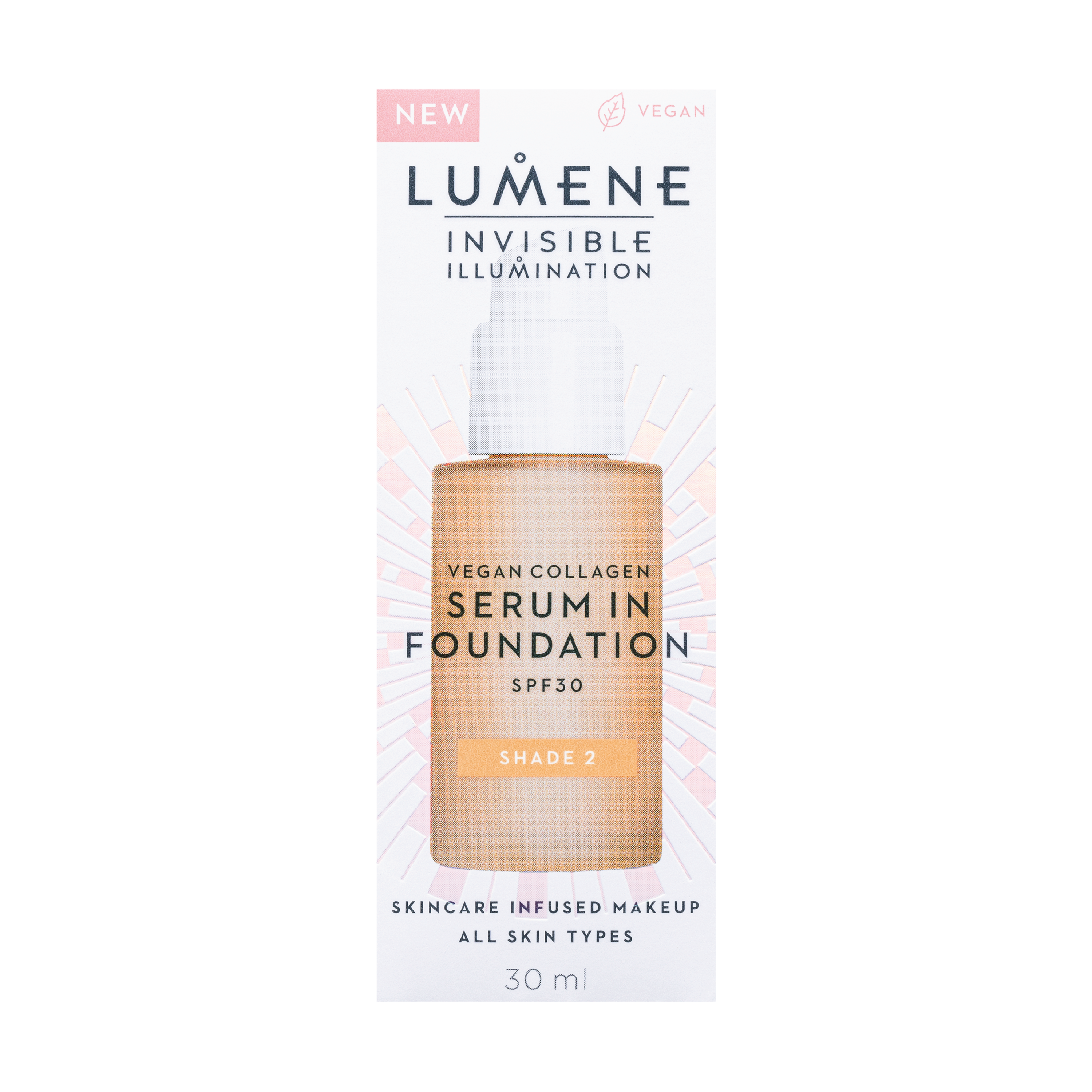 Lumene Invisible Illumination Serum In Foundation SPF30 kombinerer hudpleie og makeup i én lett formel. Den pleiende formelen inneholder vegansk kollagen, fuktighetsgivende trippel hyaluronsyre og pleiende nordiske ingredienser som bidrar til å glatte ut og fukte huden hver gang du bruker den. Inneholder i tillegg UVA- og UVB-filter med solfaktor 30.