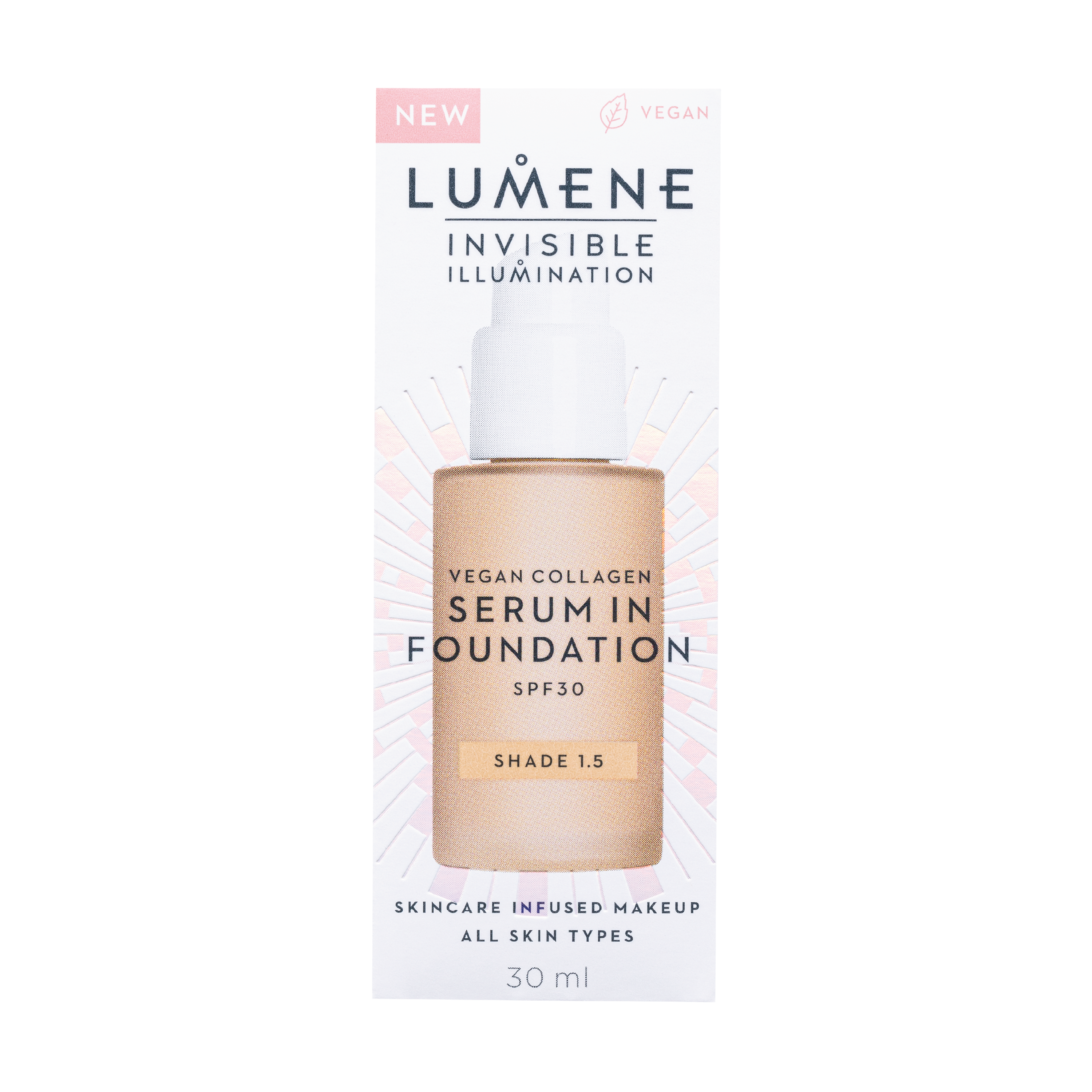 Lumene Invisible Illumination Serum In Foundation SPF30 kombinerer hudpleie og makeup i én lett formel. Den pleiende formelen inneholder vegansk kollagen, fuktighetsgivende trippel hyaluronsyre og pleiende nordiske ingredienser som bidrar til å glatte ut og fukte huden hver gang du bruker den. Inneholder i tillegg UVA- og UVB-filter med solfaktor 30.