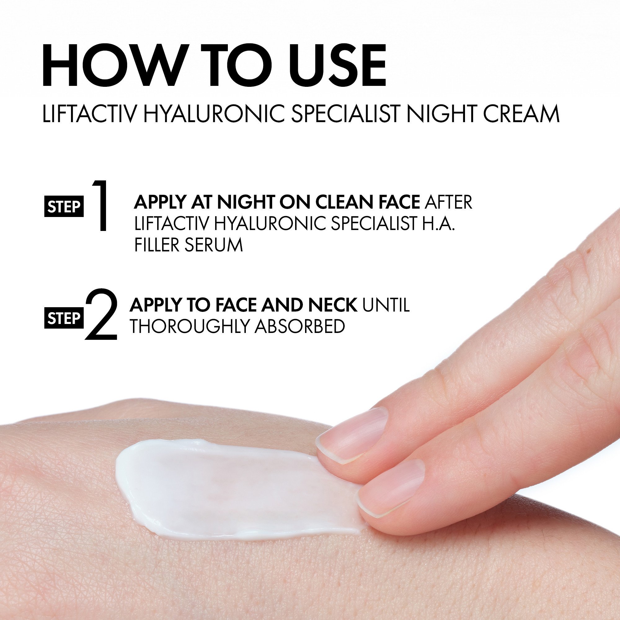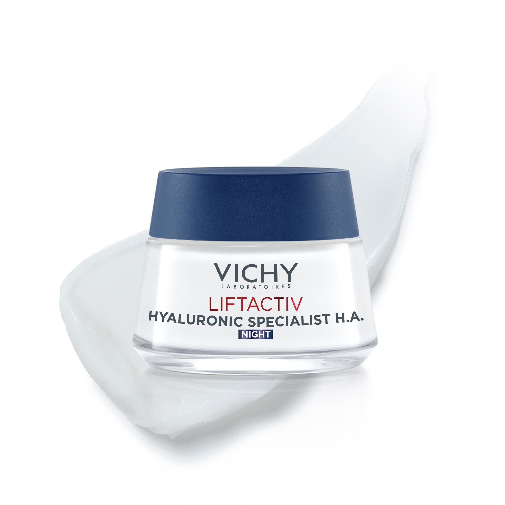Vichy Liftactiv Hyaluron Specialist H.A. Night Cream er spesielt utviklet for kvinner mellom 35 og 50 år som ønsker å redusere utseendet til dype rynker og forbedre manglende fasthet i huden. Ansiktskremen bidrar til at huden føles glattere og mykere, og har en delikat konsistens med en mild duft.