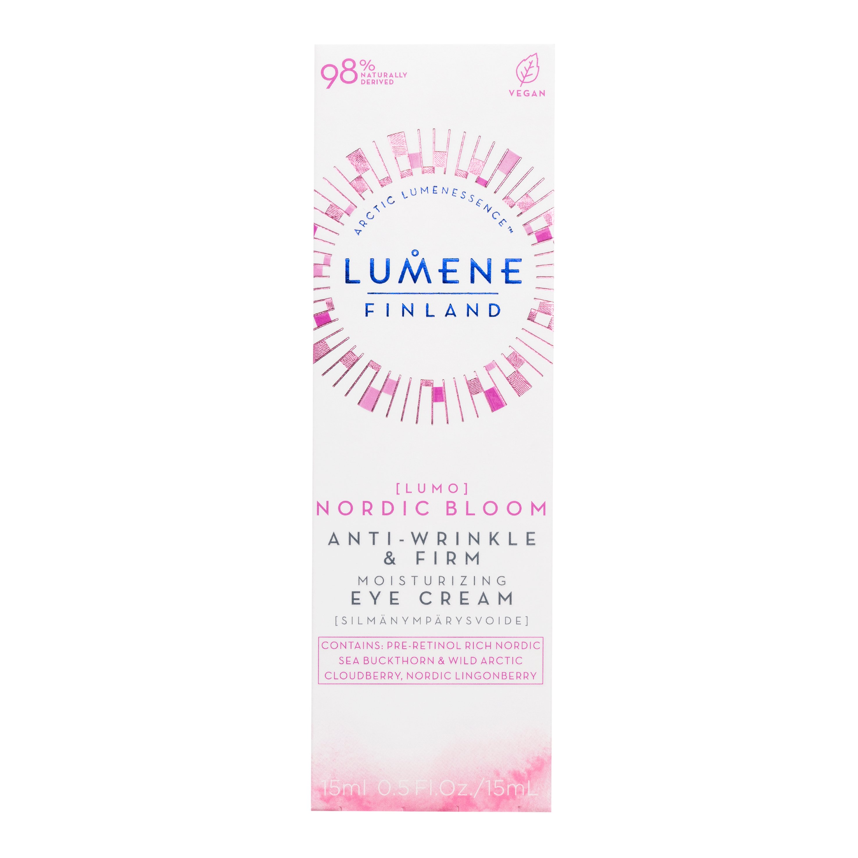 Lumene Nordic Bloom Anti-Wrinkle & Firm Moisturizing Eye Cream bidrar til å redusere poser og mørke ringer under øynene, fukte og stramme opp øyeområdet, samt redusere synligheten av smilerynker rundt øynene. Øyekremen har en lett konsistens som trekker raskt inn i huden. Øyekremen kan også brukes rundt leppene, dersom du opplever fine linjer og rynker der.