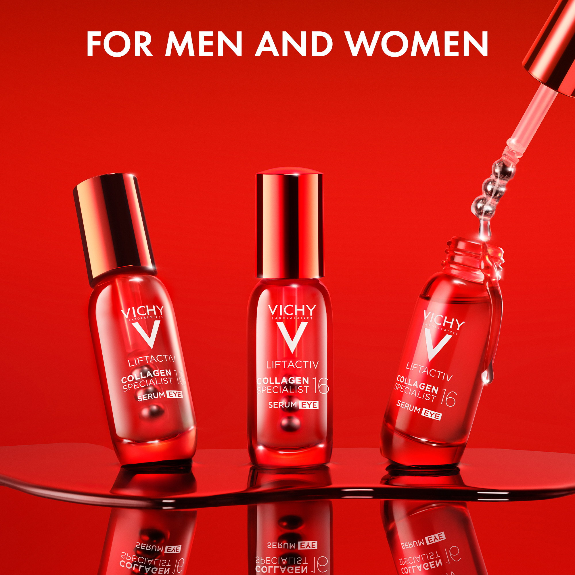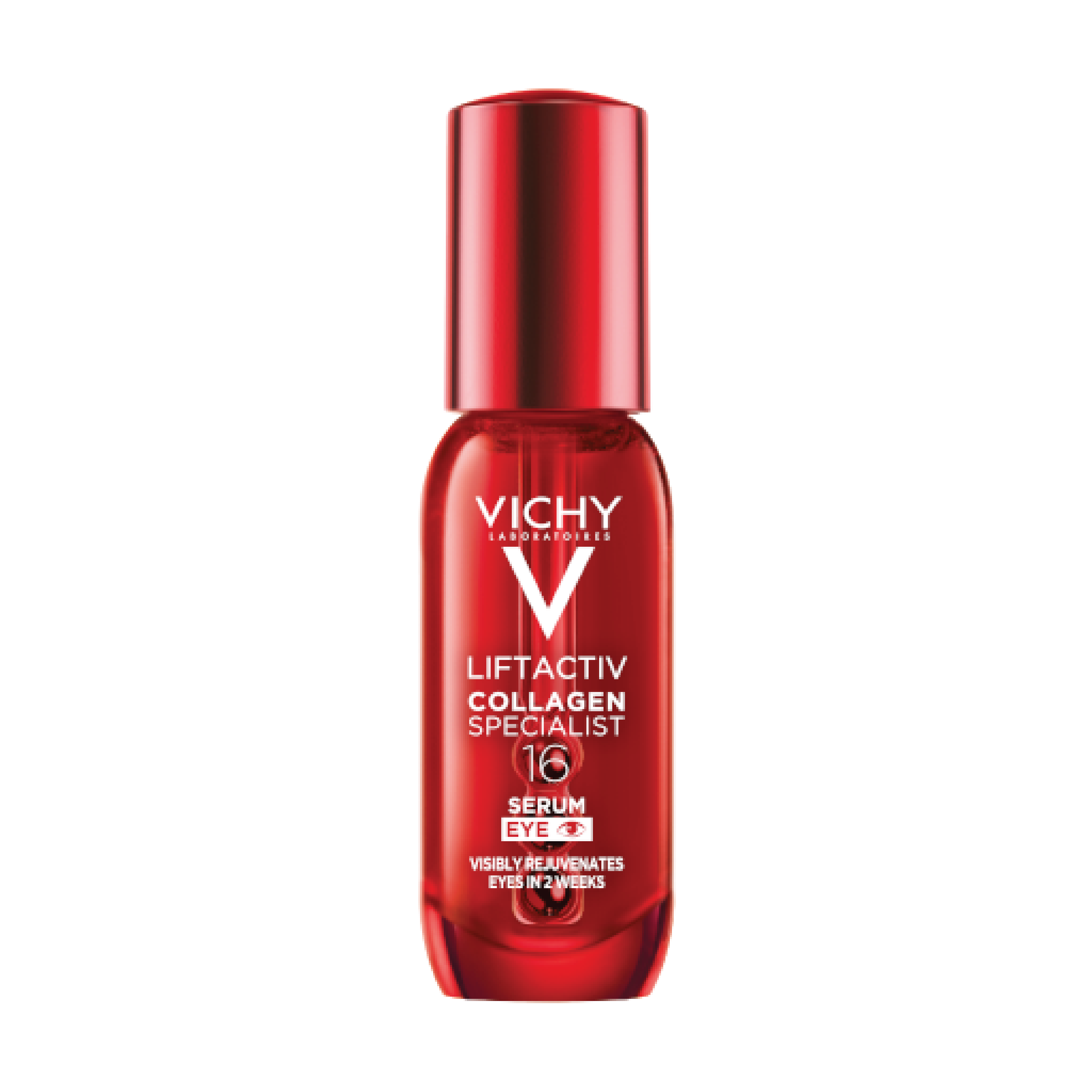 Vichy Liftactiv Collagen Specialist 16 Eye Serum bidrar til å forbedre flere tegn på aldring rundt øynene, som synlige poser, mørke ringer, rynker, kråketær og fine linjer. Serumet bidrar også til å støtte hudens fasthet, glatthet, smidighet, glød og fukt, samt gi et jevnere og mer uthvilt utseende. Formelen er utviklet med Co-bonding technology og har en massasjeapplikator for presis påføring. Testet under dermatologisk og oftalmologisk kontroll.