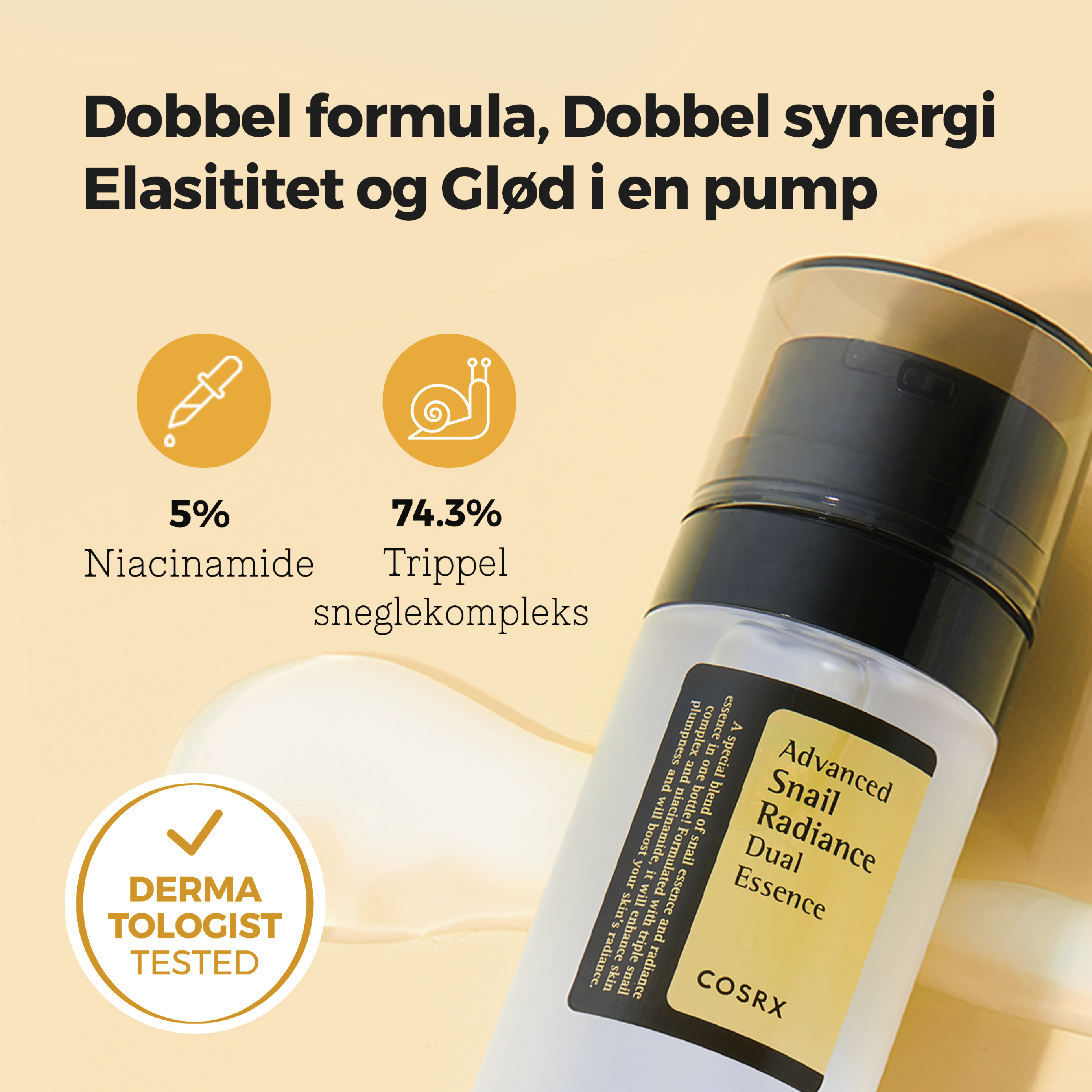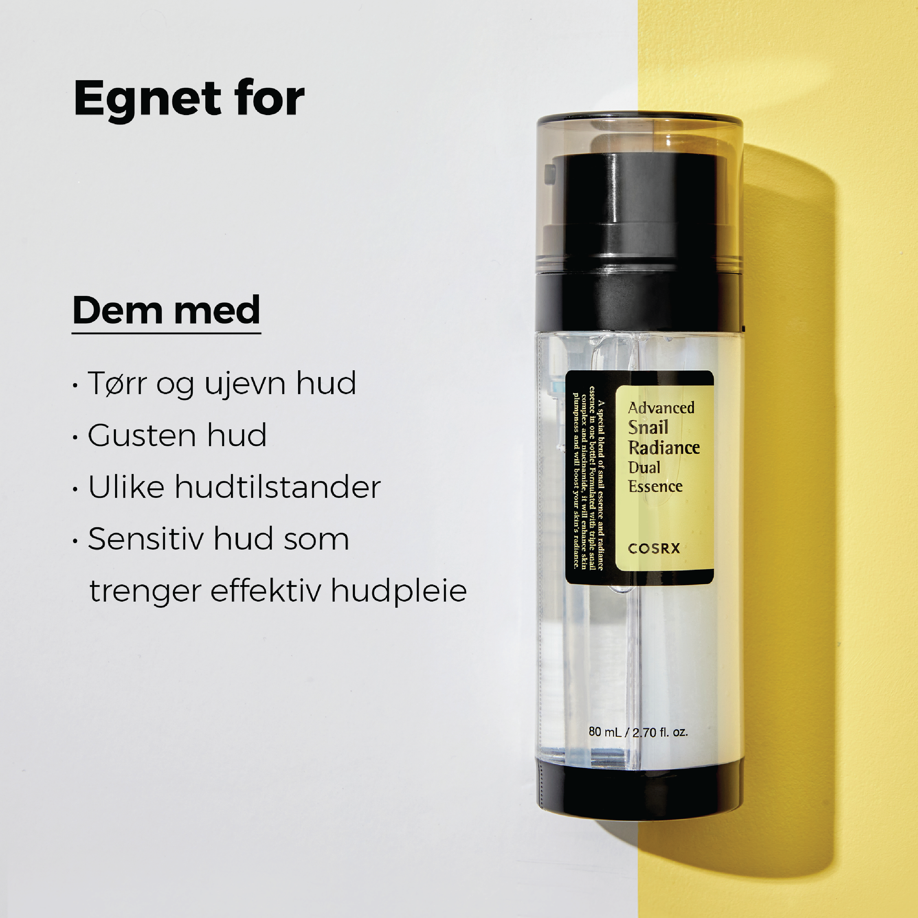 COSRX Advanced Snail Radiance Dual Essence er en blanding av COSRX sin populære snegleessens og niacinamide, som sammen bidrar til å øke hudens elastisitet og tilfører glød og næring.