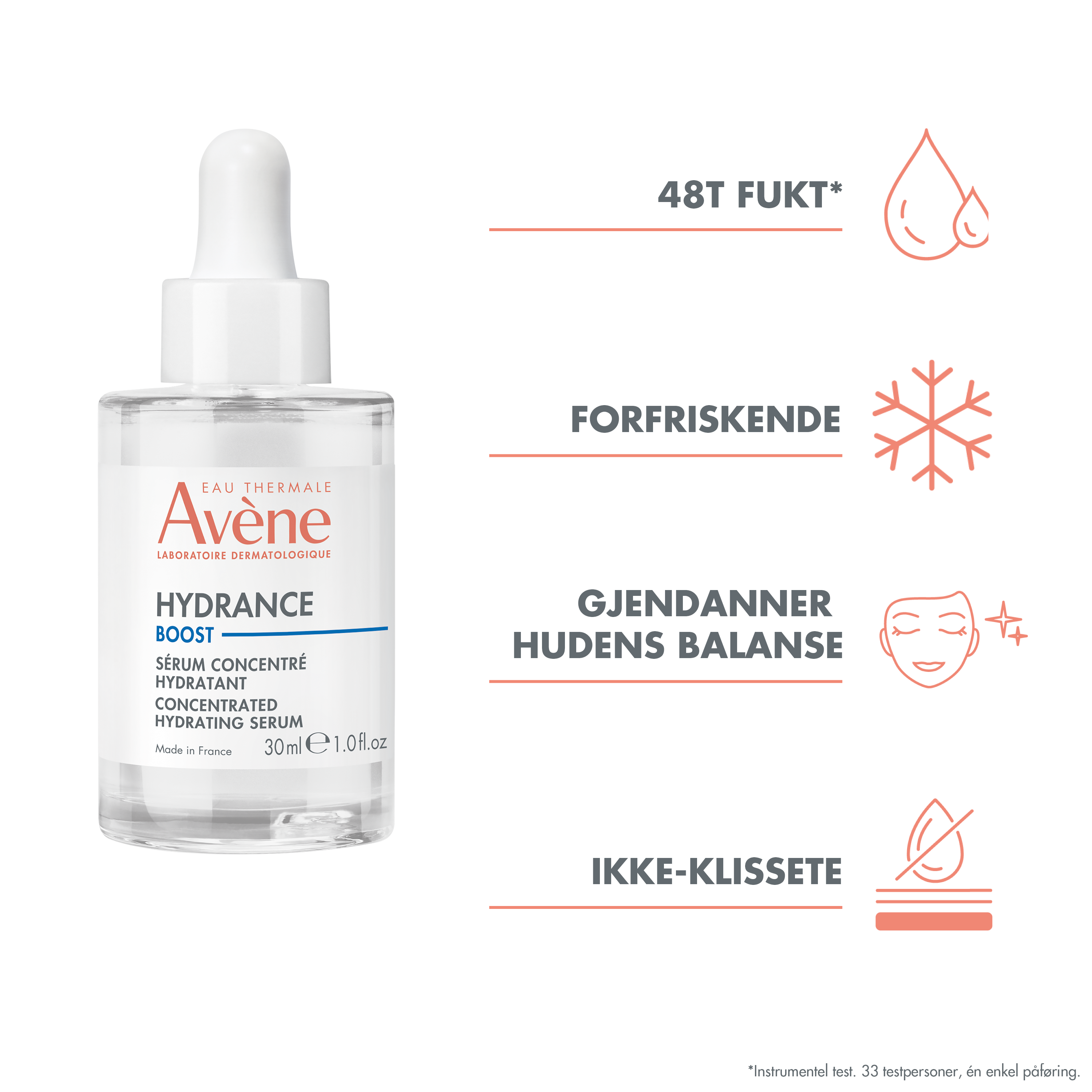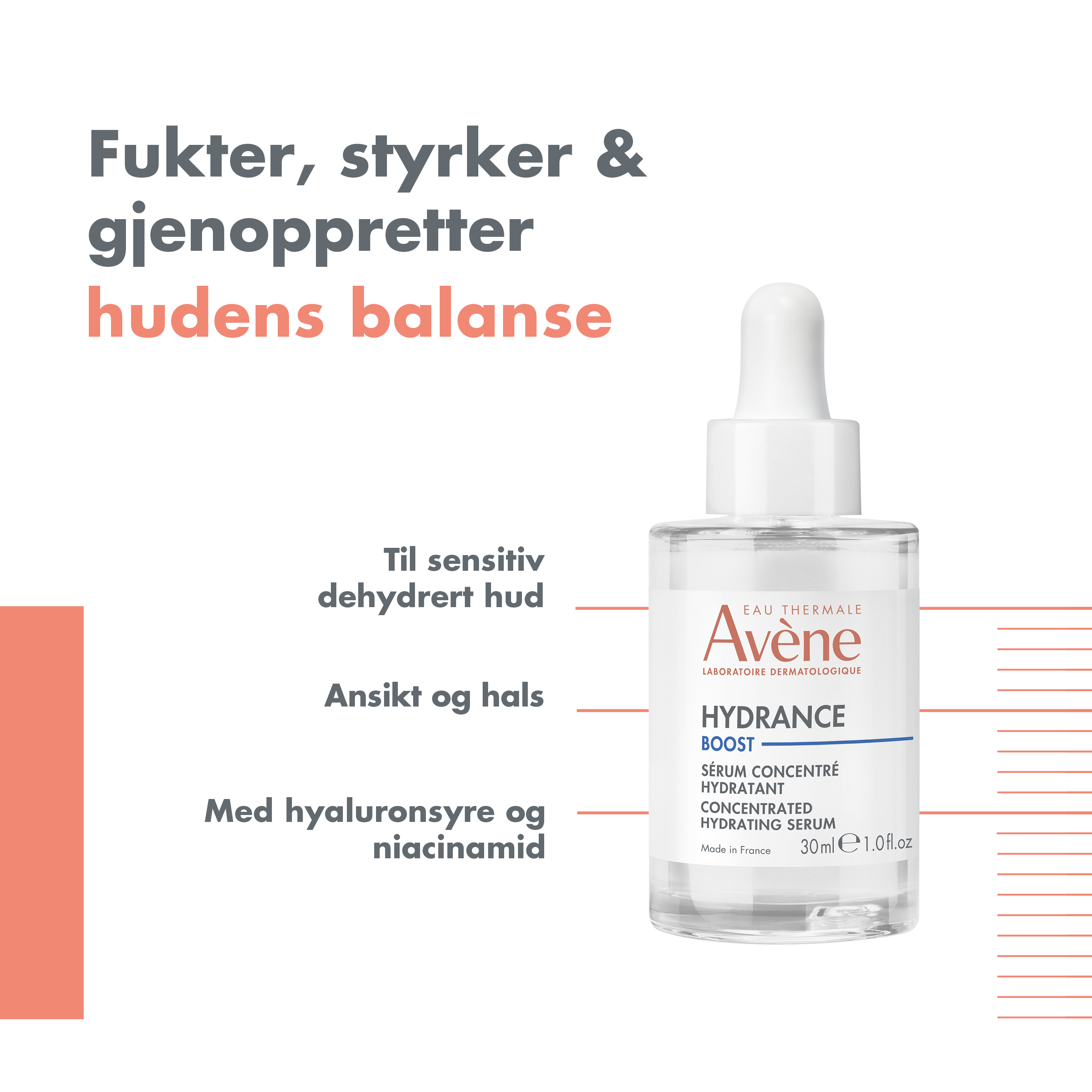 Avène Hydrance Boost Serum vil gi huden en øyeblikkelig fuktighetsboost, takket være de aktive ingrediensene hyaluronsyre og NMF. Serumet inneholder også niacinamid som styrker hudbarrieren og balanserer talgproduksjonen. Den lette og friske konsistensen til serumet føles mykt på huden og trekker raskt inn. Serumet er formulert med 96 % naturlige ingredienser og er i en resirkulerbar glassflaske.