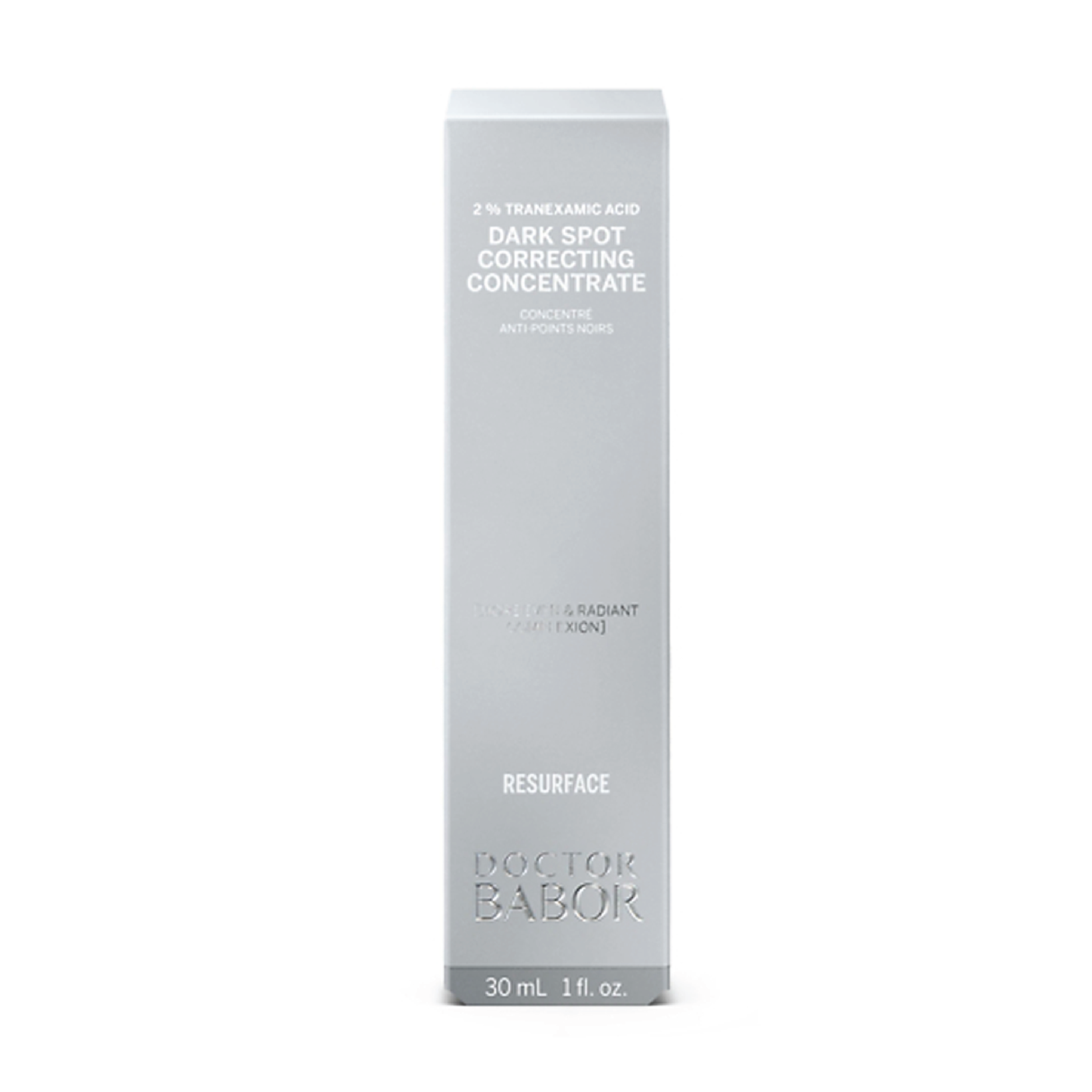 BABOR Doctor Babor Resurface Dark Spot Correcting Concentrate inneholder blant annet 2 % tranexaminsyre og 2 % beta-alanin som bidrar til å redusere uønsket hyperpigmentering eller melasma, dette ved å hemme hudens egen overdrevne pigmentsyntese. Tranexaminsyre bidrar også til å redusere synligheten av aknearr. Allantoin og panthenol tilfører fuktighet og virker beroligende på huden. Serumet inneholder i tillegg vitamin C som bidrar til en jevnere hud og en fin glød. Ved regelmessig bruk vil serumet bidra til å gi en jevnere hudtone med mindre synlige pigmentflekker.