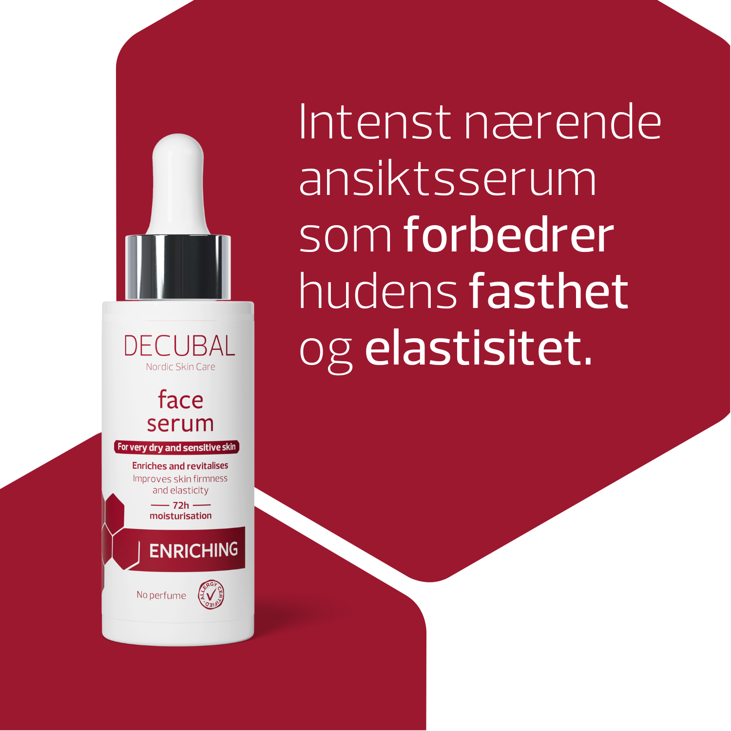 Decubal Enriching Face Serum inneholder ceramider, kollagen, vitamin E, vitamin C og rød alge. Serumet bidrar til å beskytte og revitalisere huden, samt gjenoppbygge en svekket hudbarriere. Klinisk bevist å gi langvarig fuktighet og reparere hudbarrieren, uten å tette porene.