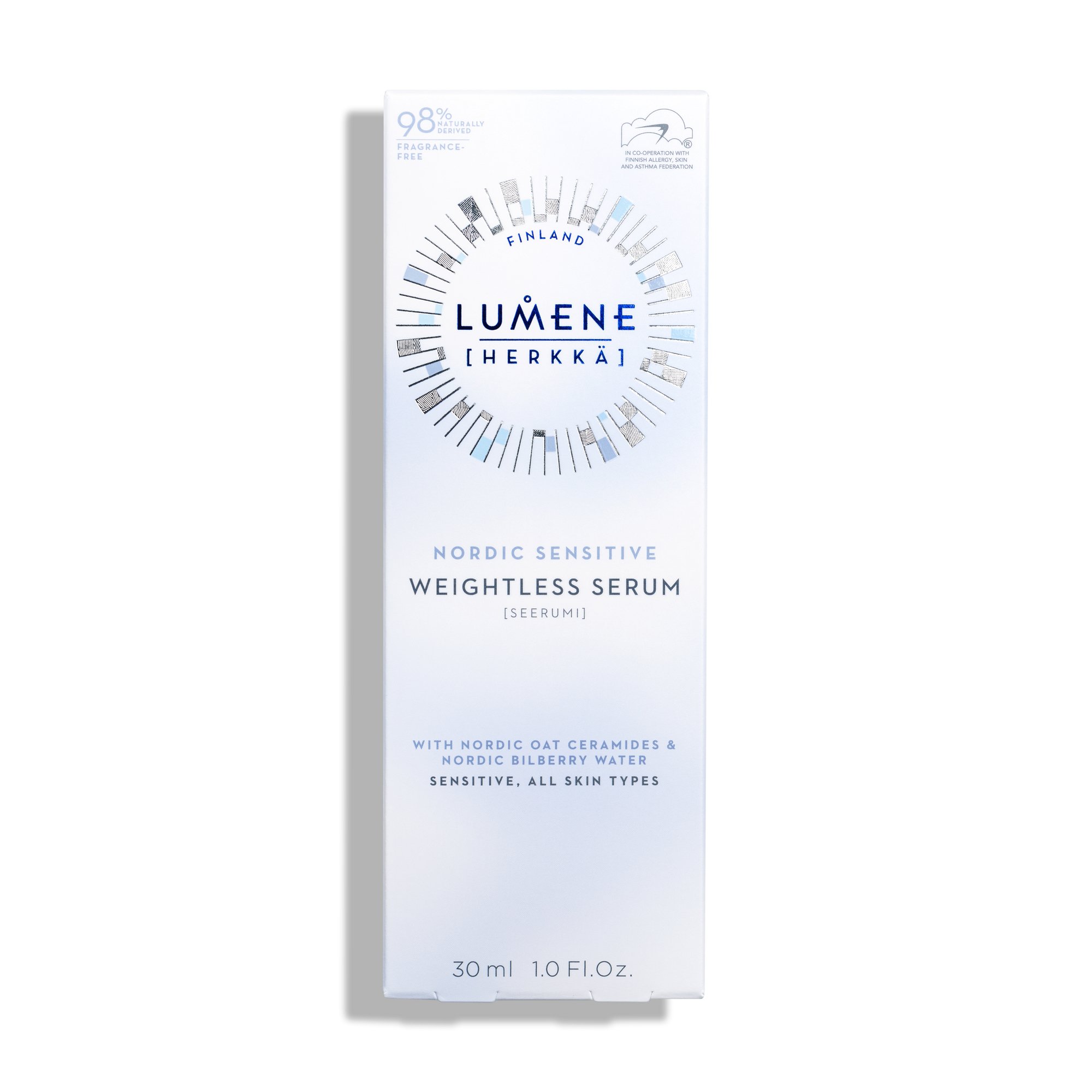 Lumene Nordic Sensitive Weightless Serum er beriket med ceramider fra nordisk havre som bidrar til å styrke hudbarrieren, samt fuktighetsgivende blåbærvann som bidrar til å redusere rødhet i huden. Serumet bidrar til å umiddelbart lindre huden og styrke hudbarrieren, samtidig som det tilfører godt med fuktighet og pleie til huden. Serumet trekker raskt inn og kjennes ikke klissete ut på huden. Serumet er klinisk testet på sensitiv hud og utviklet i samarbeid med det finske allergi-, hud- og astmaforbundet.