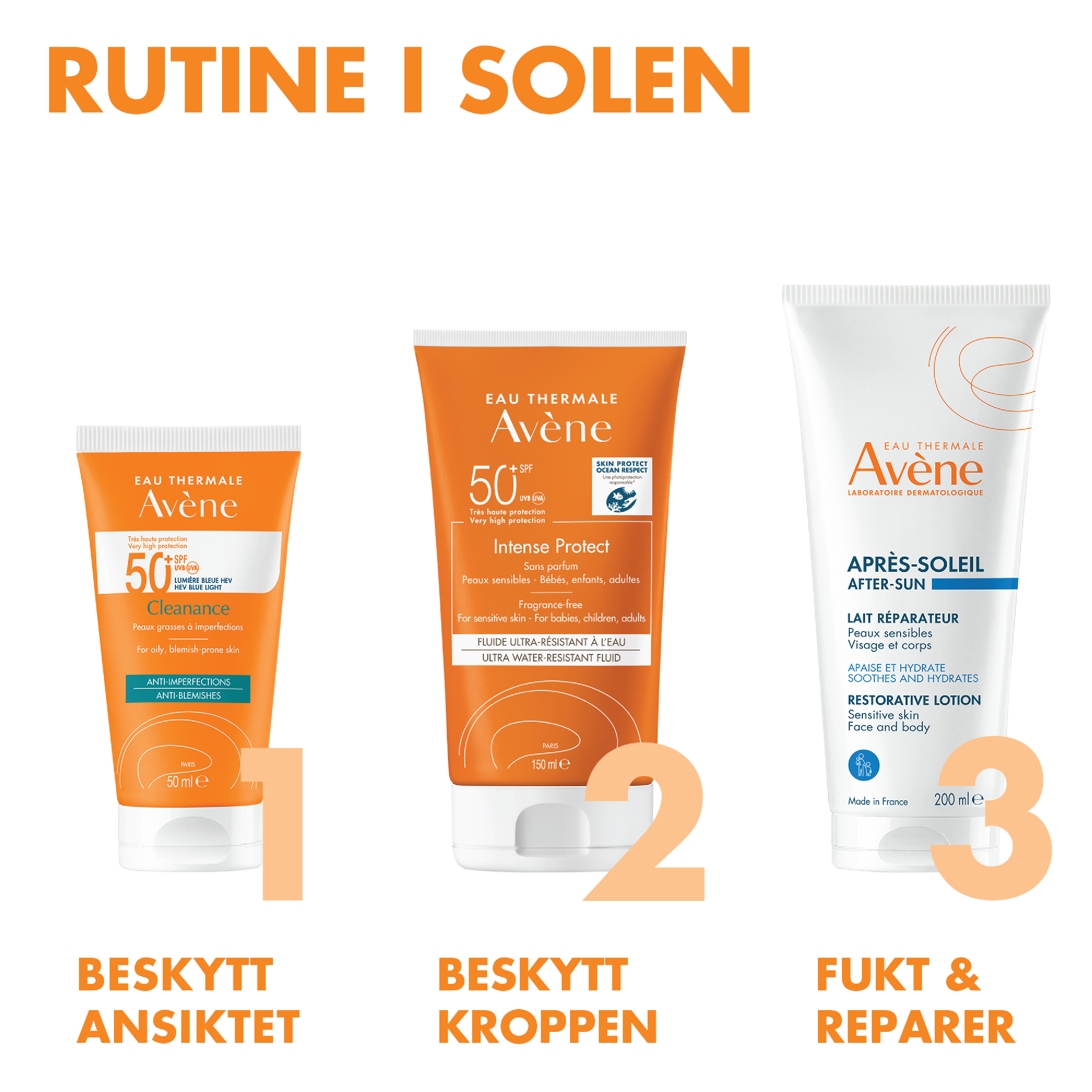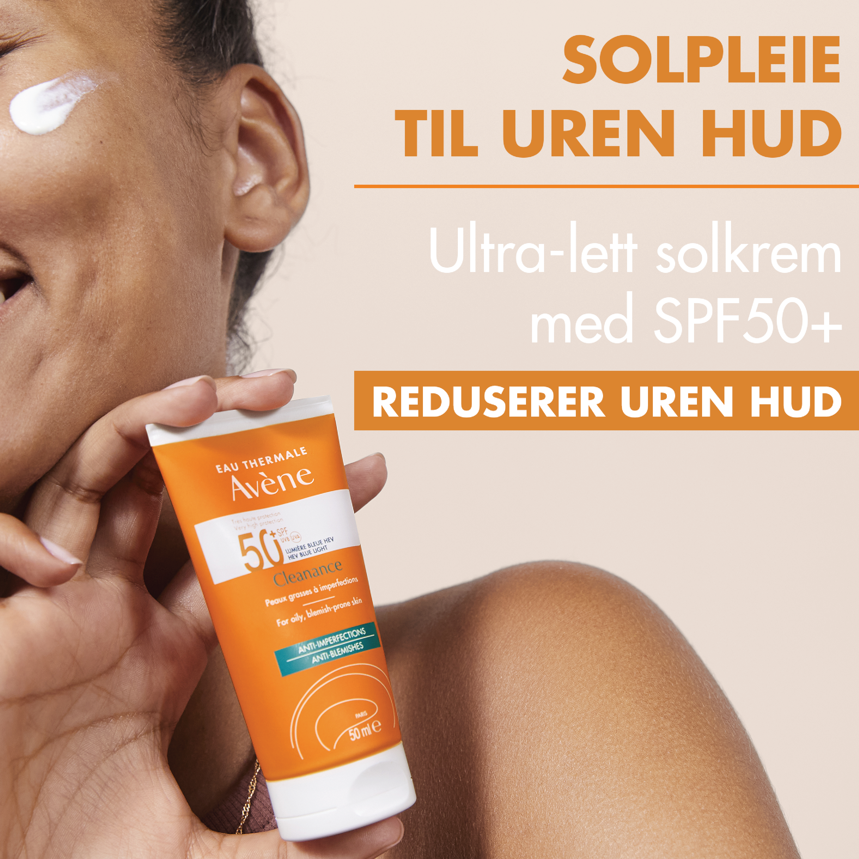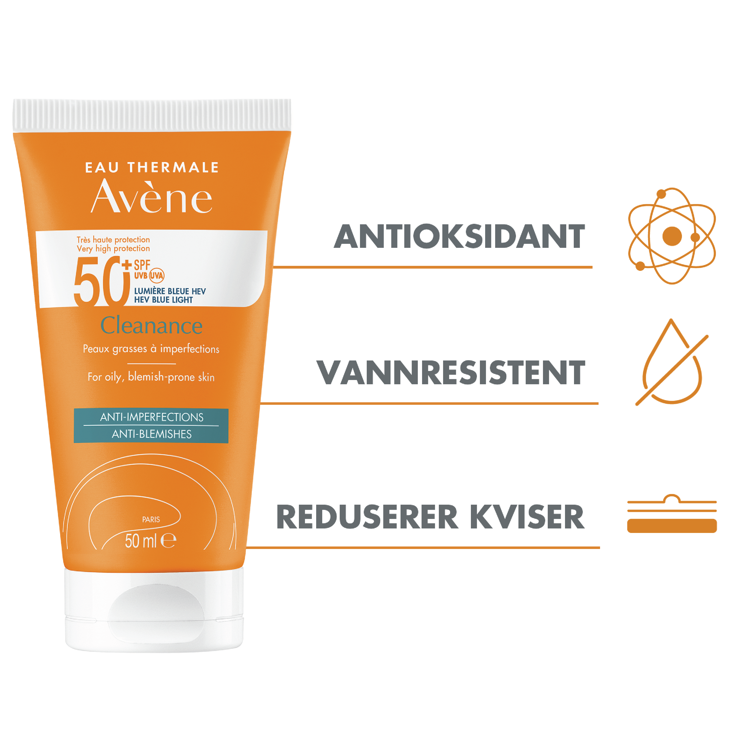 Avène Sun Cleanance SPF50+ bidrar til å redusere forekomsten av kviser og motvirker samtidig arrdannelse som følge av soleksponering. Solkremen er vannresistent og har en ultralett konsistens som raskt absorberes i huden og etterlater en matt finish. Kremen er formulert med en meget effektiv sammensetning av solfiltre som i tillegg til bredspektret UVA- og UVB-beskyttelse, også beskytter mot blått lys. Filtersystemet er også utviklet med tanke på å minimere innvirkningen på havmiljøet.