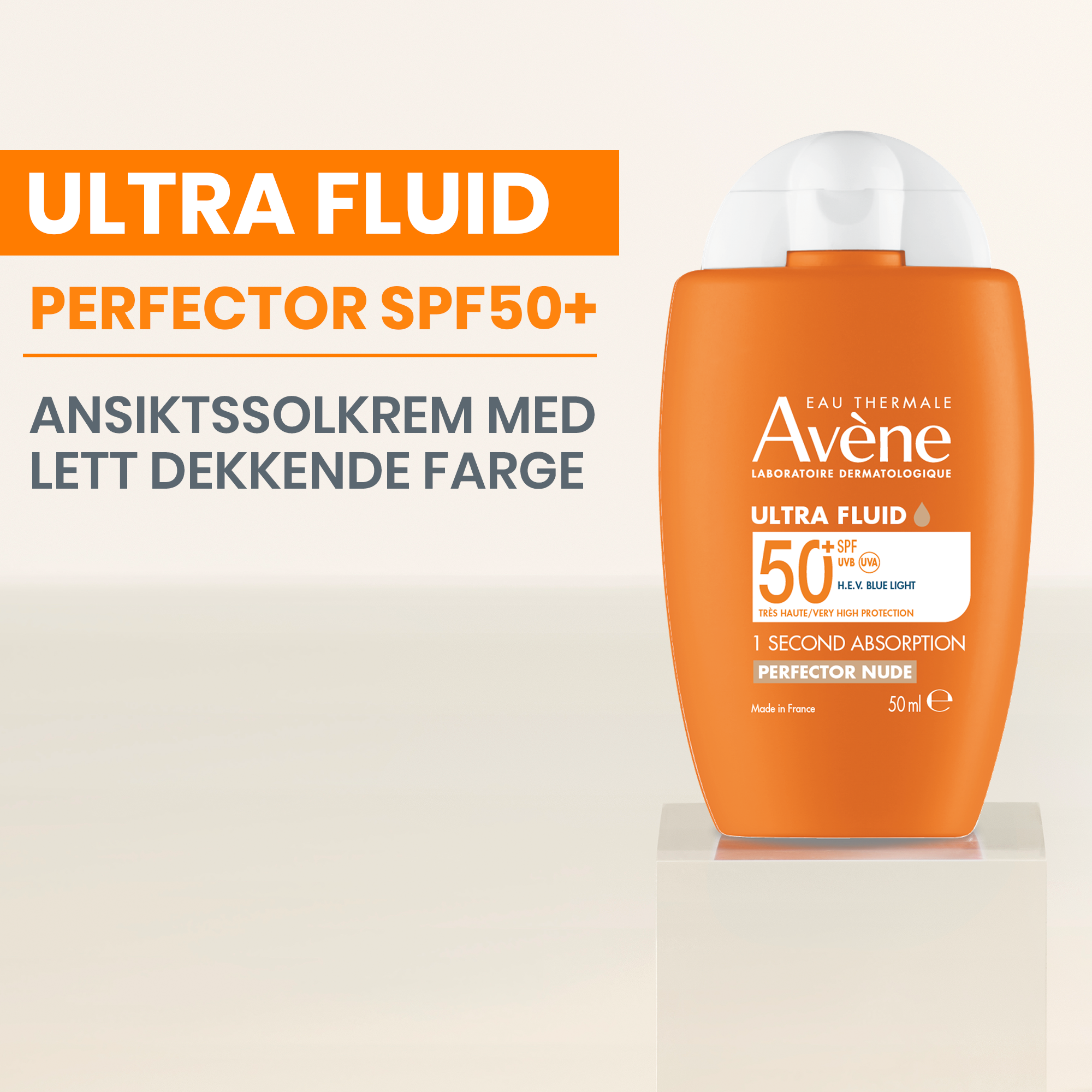 Avène Ultra Fluid Perfector SPF50+ er en ansiktssolkrem med lett farge som gir høy beskyttelse, jevner hudtonen og gir en naturlig glød.
