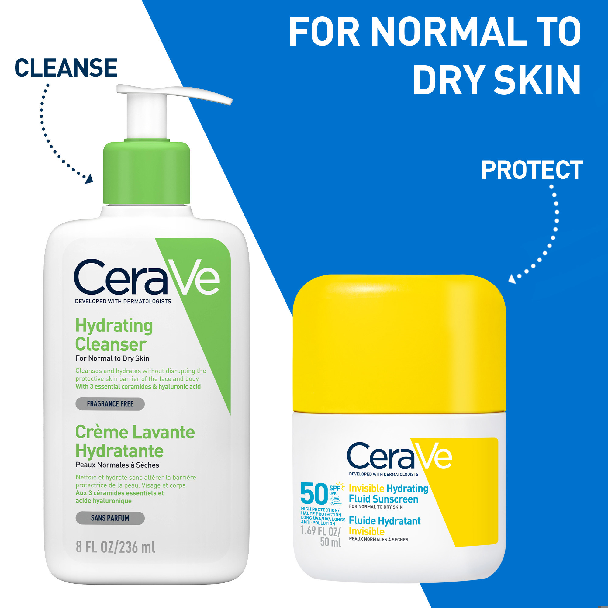 CeraVe Invisible Hydrating Fluid Sunscreen SPF50 gir høy beskyttelse med SPF50 mot både UVB-, UVA-stråler. Solkremen bidrar til å opprettholde hudbarrieren og har en lett, fuktgivende formulering som ikke etterlater hvite merker på huden. Den inneholder 3 essensielle ceramider og MVE-teknologi, som bidrar til langvarig fukt. Solkremen er velegnet til sensitiv hud.