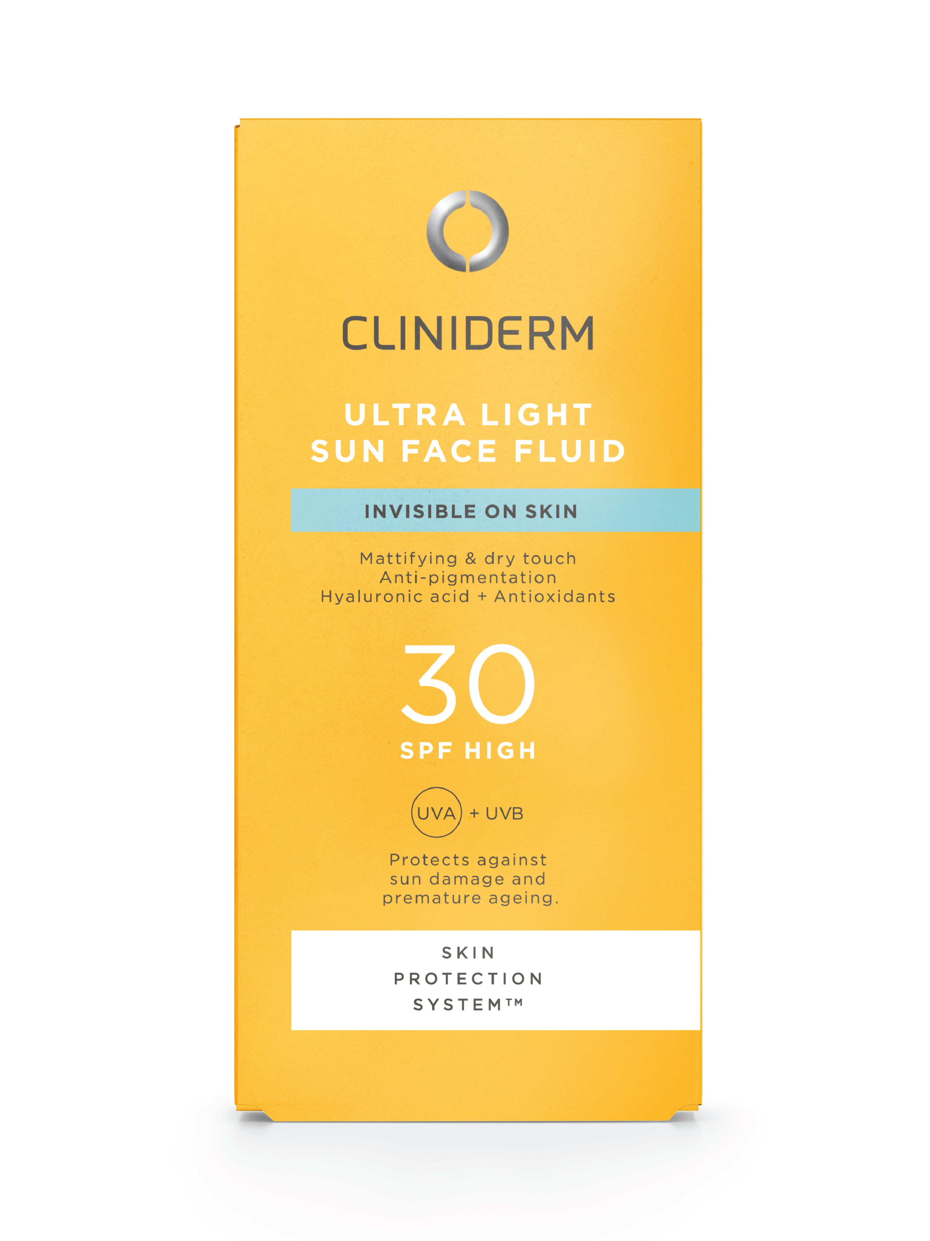 Cliniderm Sun Ultra Light Sun Face Fluid SPF30 er spesielt utviklet for sensitiv hud, og tolereres også godt av den ekstra sensitive huden rundt øynene. Med bredspektret beskyttelse og fotostabile UVA- og UVB-filter som beskytter mot pigmentering. Beskytter også mot HEV/blått lys. Solkremen inneholder også antioksidanter som beskytter mot forurensning. Den ultralette gelkremen etterlater ingen hvite streker, tetter ikke porene (ikke-komedogen) og gir en matt og silkemyk hud med en behagelig dry touch-følelse.