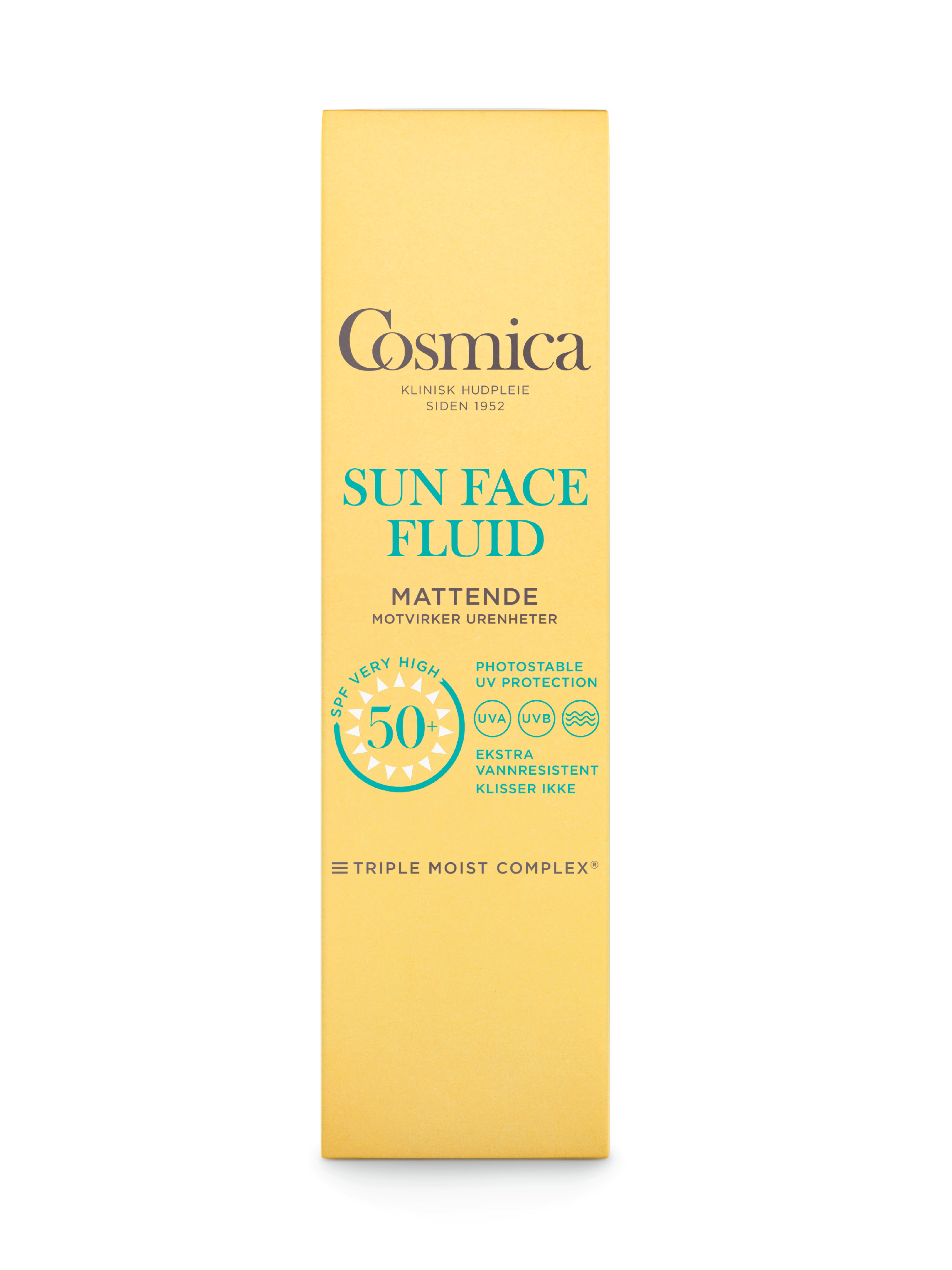 Cosmica Sun Face Fluid SPF50+ u/p er en lett solkrem til ansikt med solfaktor 50+, som bidrar til å forhindre blank hud.