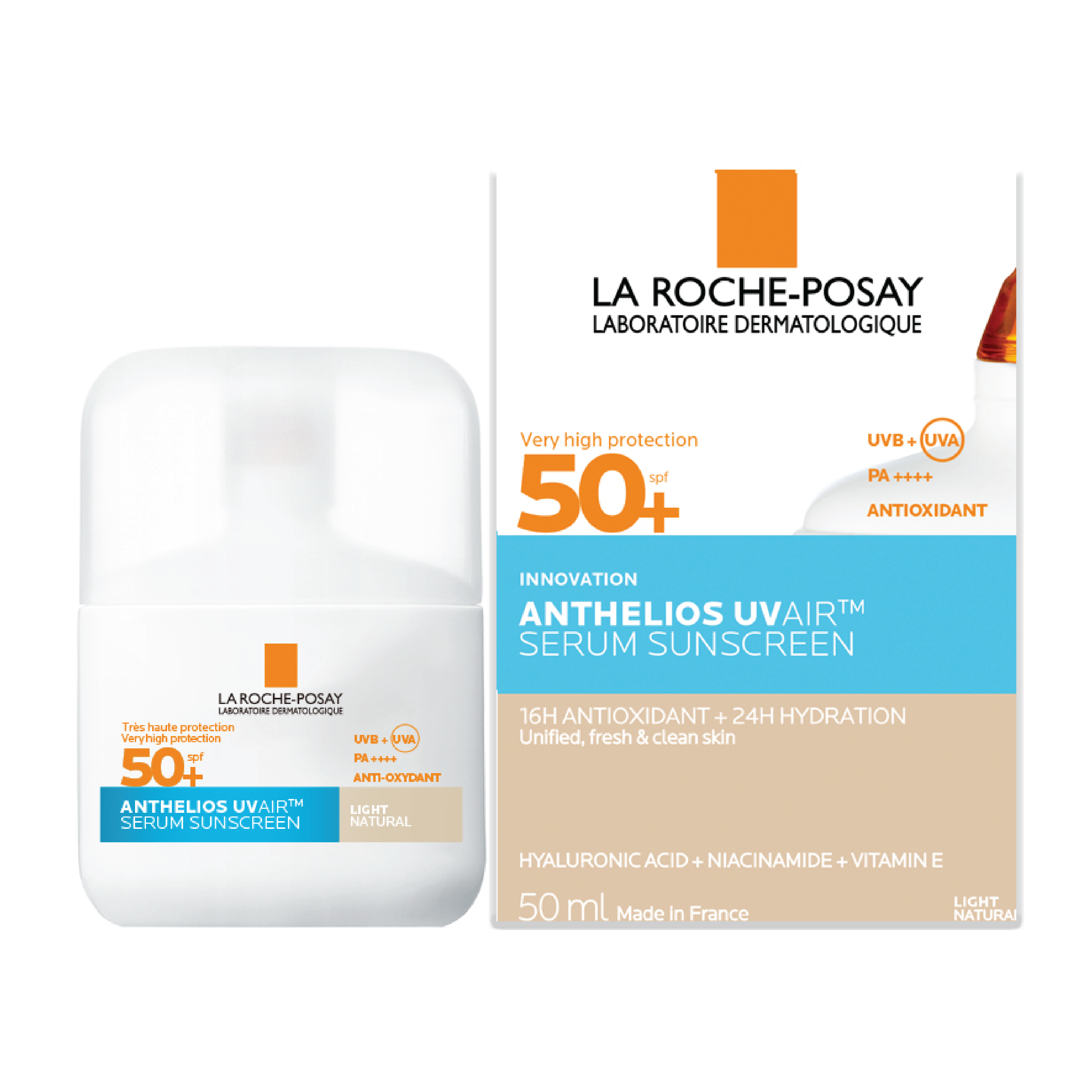 La Roche-Posay Anthelios UVAir Serum Sunscreen Tinted Light SPF50+ er velegnet til ansiktet og gir svært høy beskyttelse mot både UVA- og UVB-stråler. Solkremen bidrar også til beskyttelse mot luftforurensning og oksidasjon av huden. Den er utviklet med UVAIR™-teknologi og har en ultralett og pustende konsistens som trekker raskt inn i huden. Den gir en lys, naturlig dekning som bidrar til en jevnere hudtone, samt en umiddelbar og langvarig mattende effekt. Solkremen tilfører fukt i opptil 24 timer og etterlater huden frisk. Produktet er fremstilt for å minimere svie i øynene og passer godt til bruk under makeup. Formelen er beriket med hyaluronsyre og niacinamid.