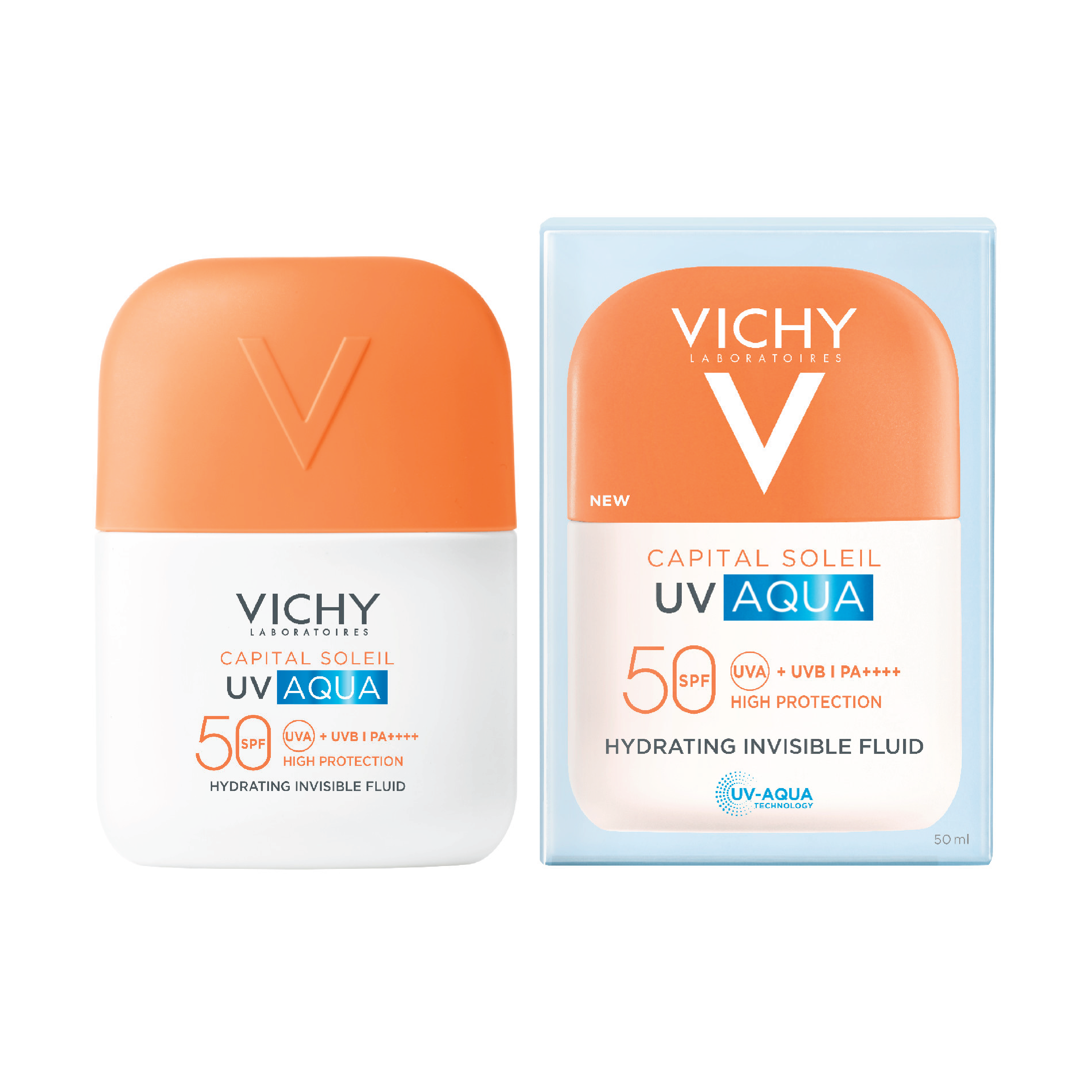 Vichy Capital Soleil UV-Aqua Hydrating Fluid SPF50 er en lett og fuktighetsgivende ansiktssolkrem som gir høy UV-beskyttelse.