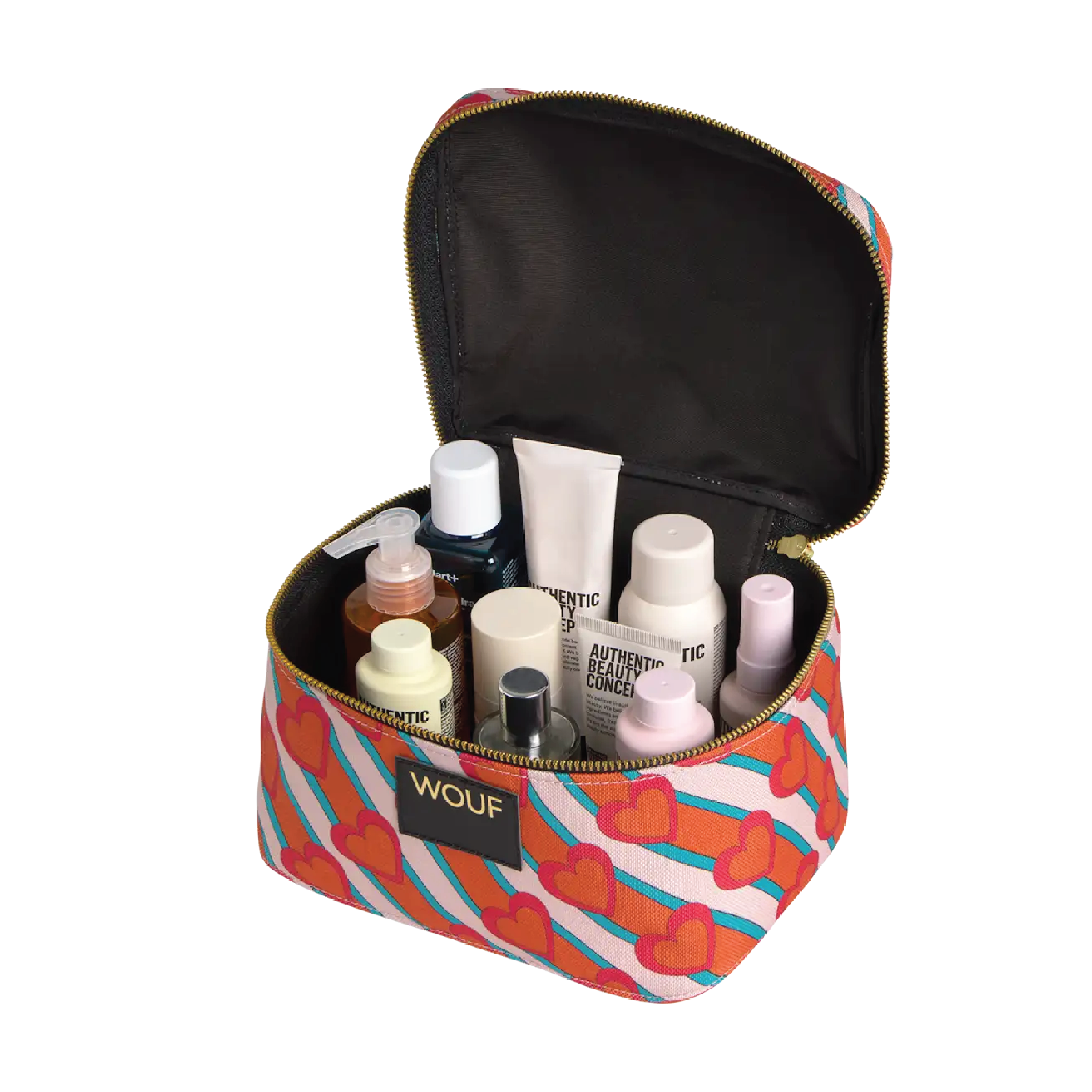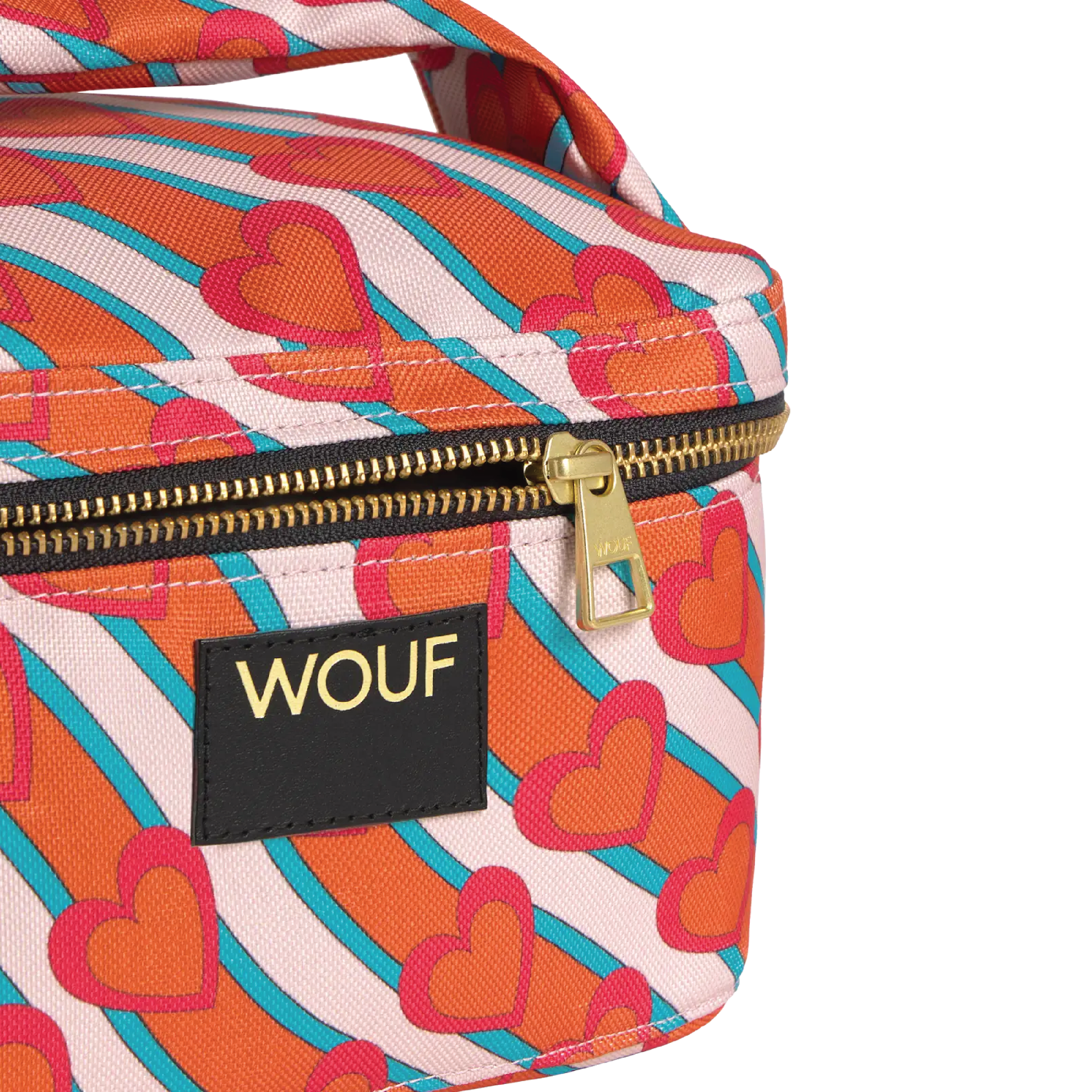WOUF Heartbeat Vanity Bag er en romslig og praktisk toalettmappe med håndtak, med motiv av hjerter.