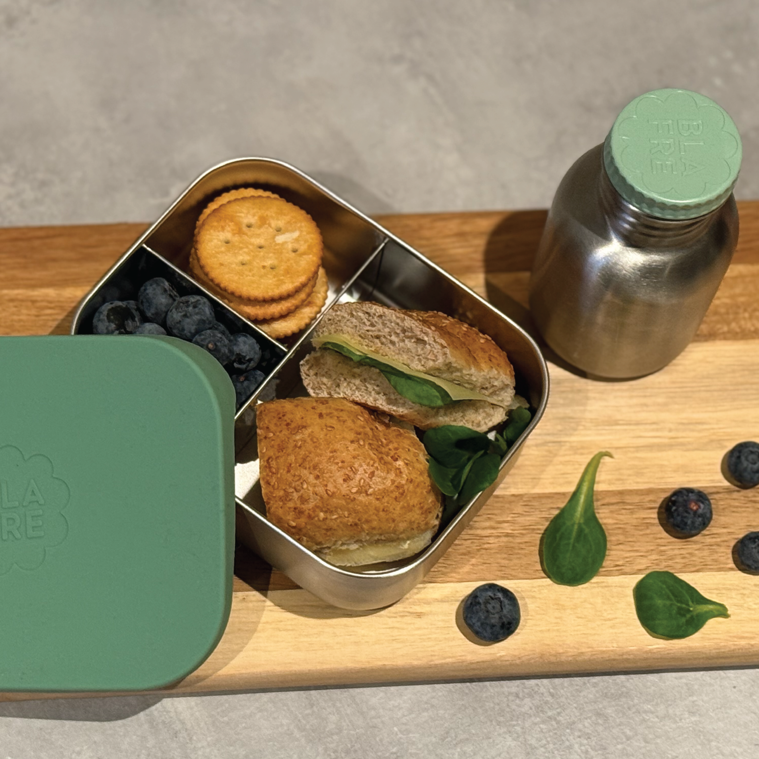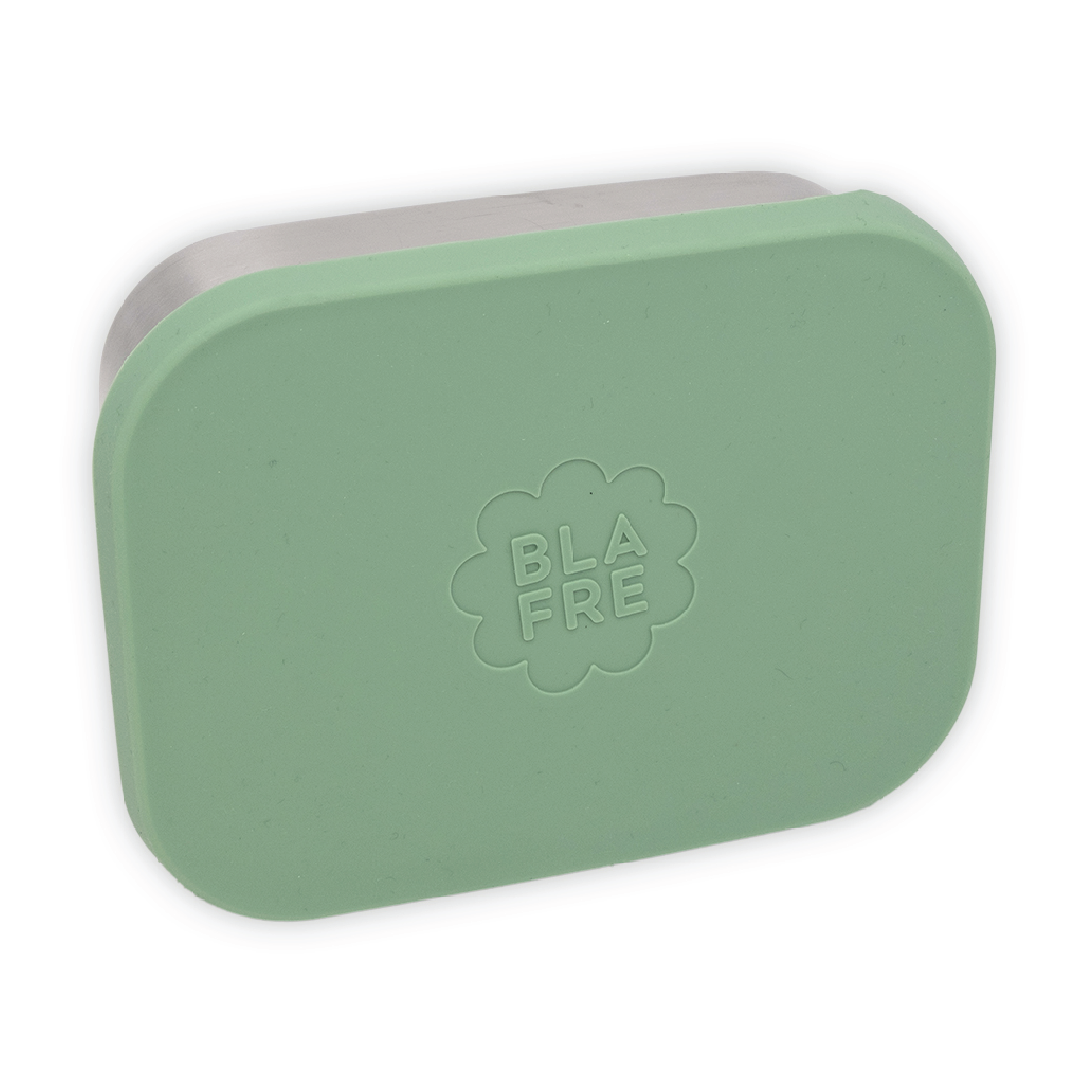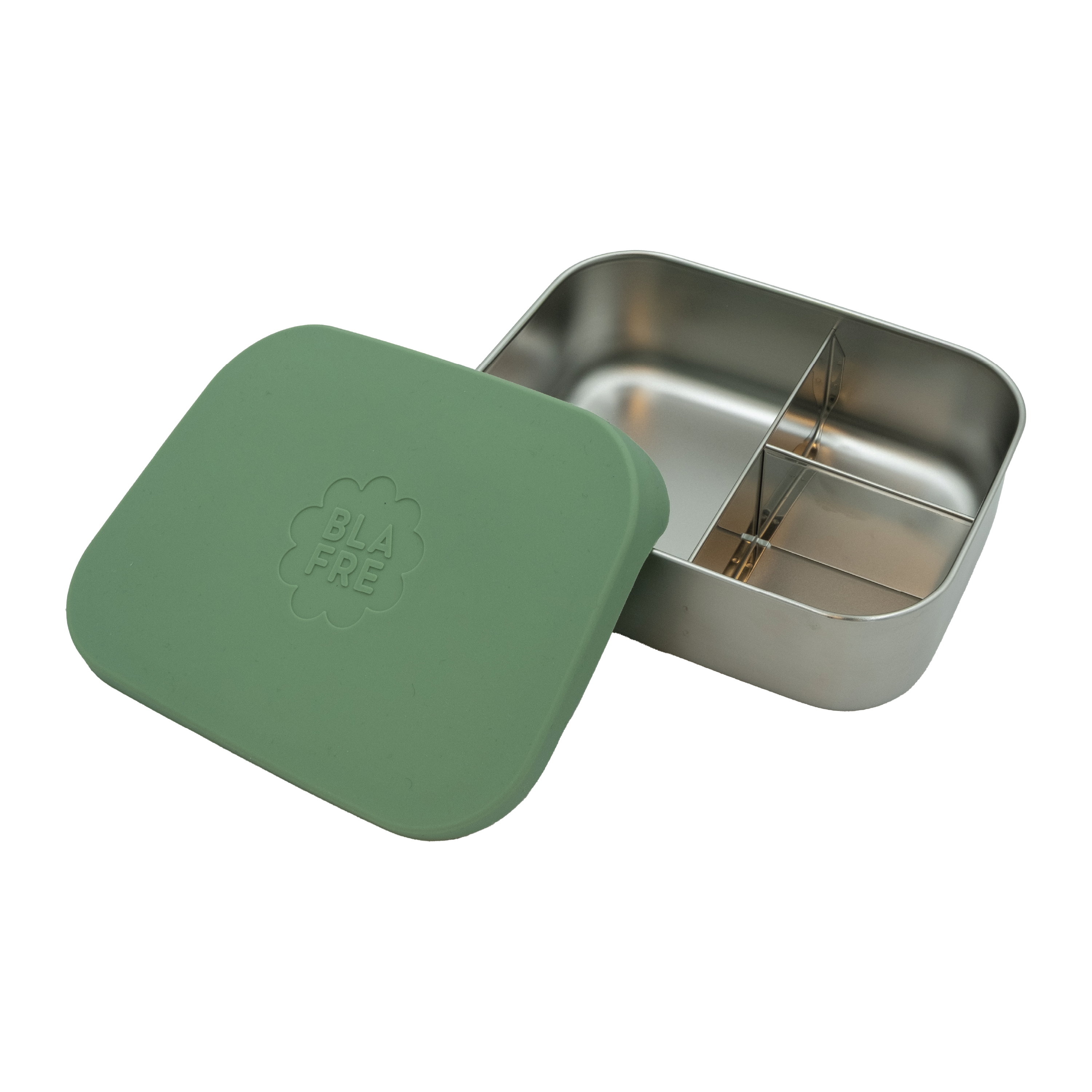 Blafre Stålmatboks tre rom er en slitesterk og bærekraftig matboks i rustfritt stål med tre praktiske rom og silikonlokk, i fargen lys grønn.