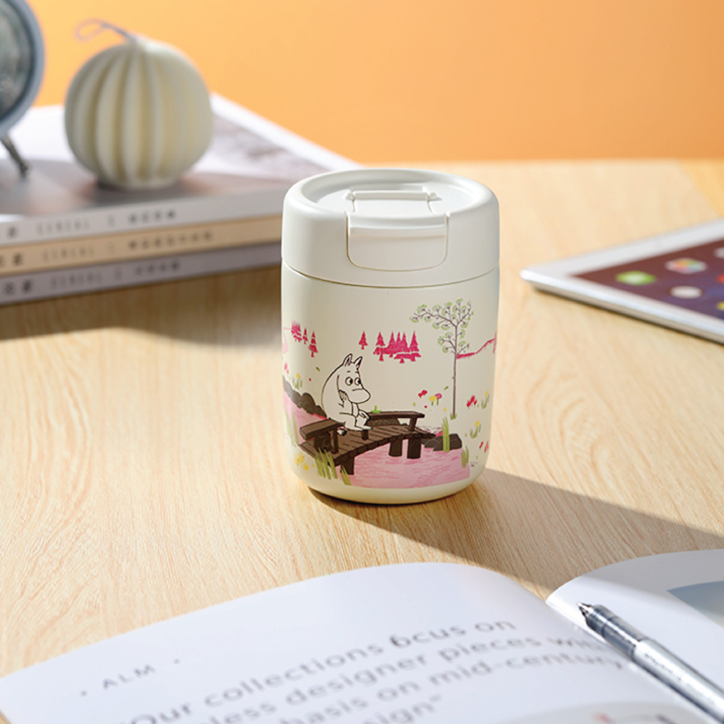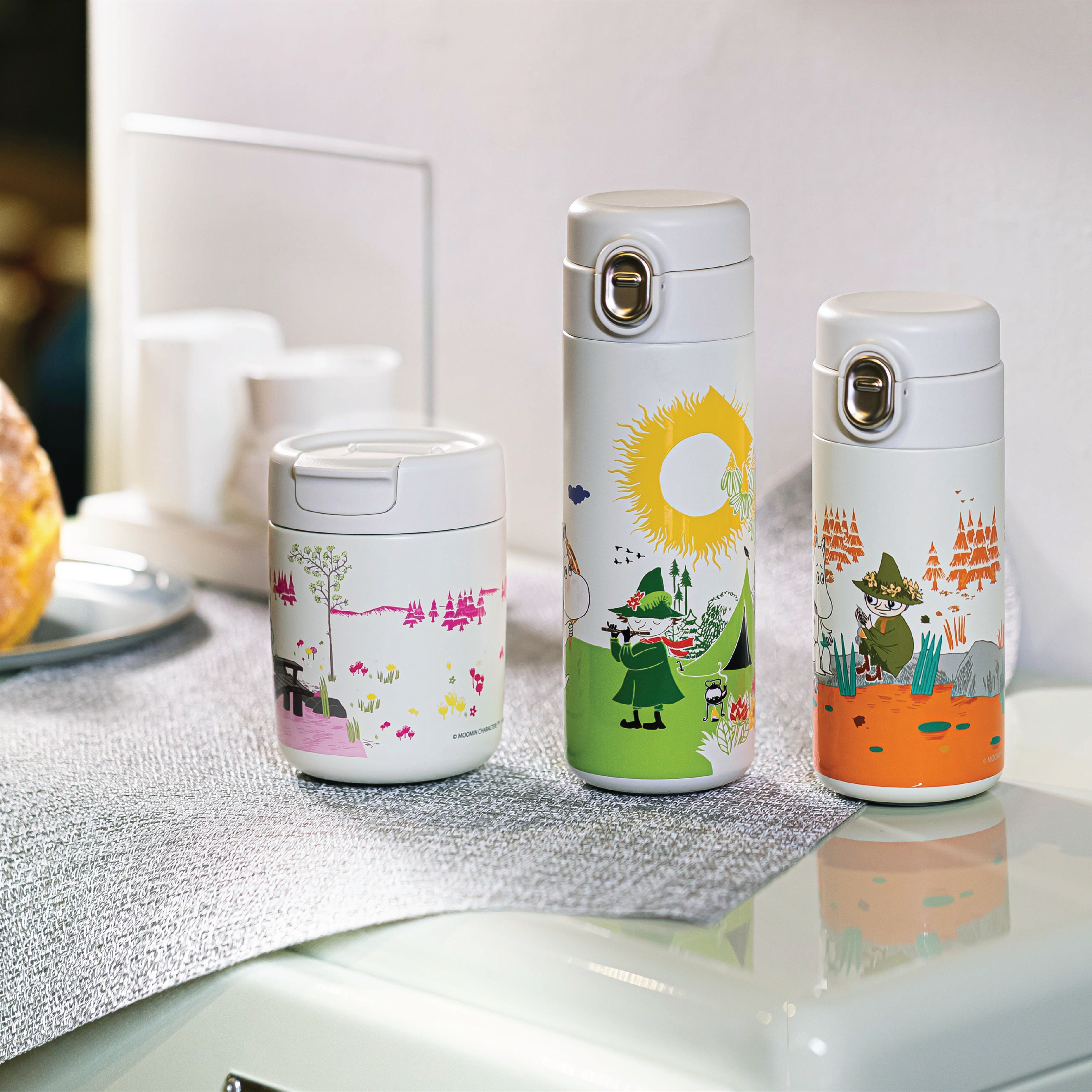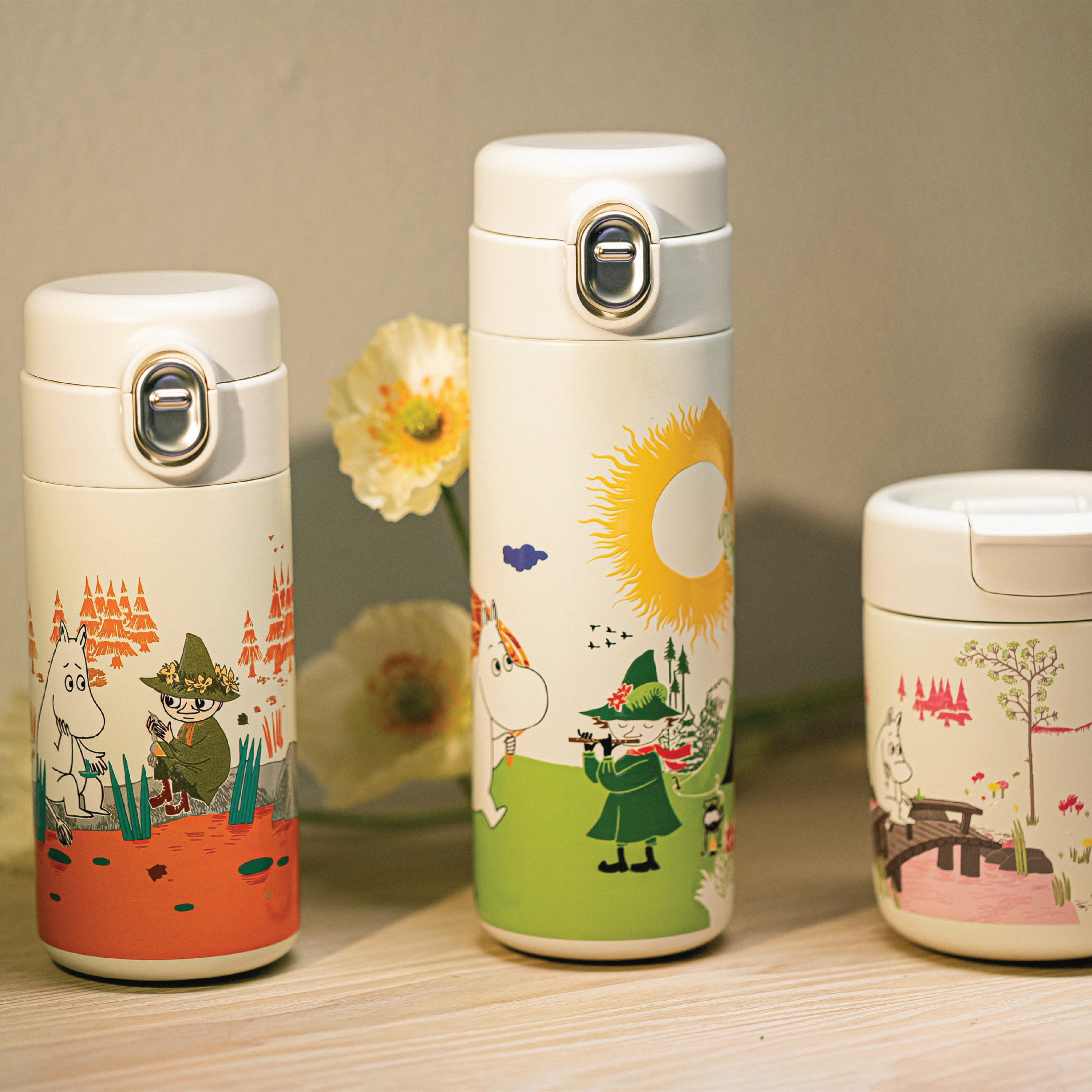 Mummi Termokopp - Rosa er laget av rustfritt stål og har et koselig motiv av Mummitrollet ute i naturen. Termokoppen har et smart lokk med drikkeåpning som enkelt kan åpnes og lukkes. Koppen egner seg godt til daglig bruk hjemme, på tur eller på jobb. Termokoppen er hvit i fargen og har design av Mummitrollet som sitter på en bro.