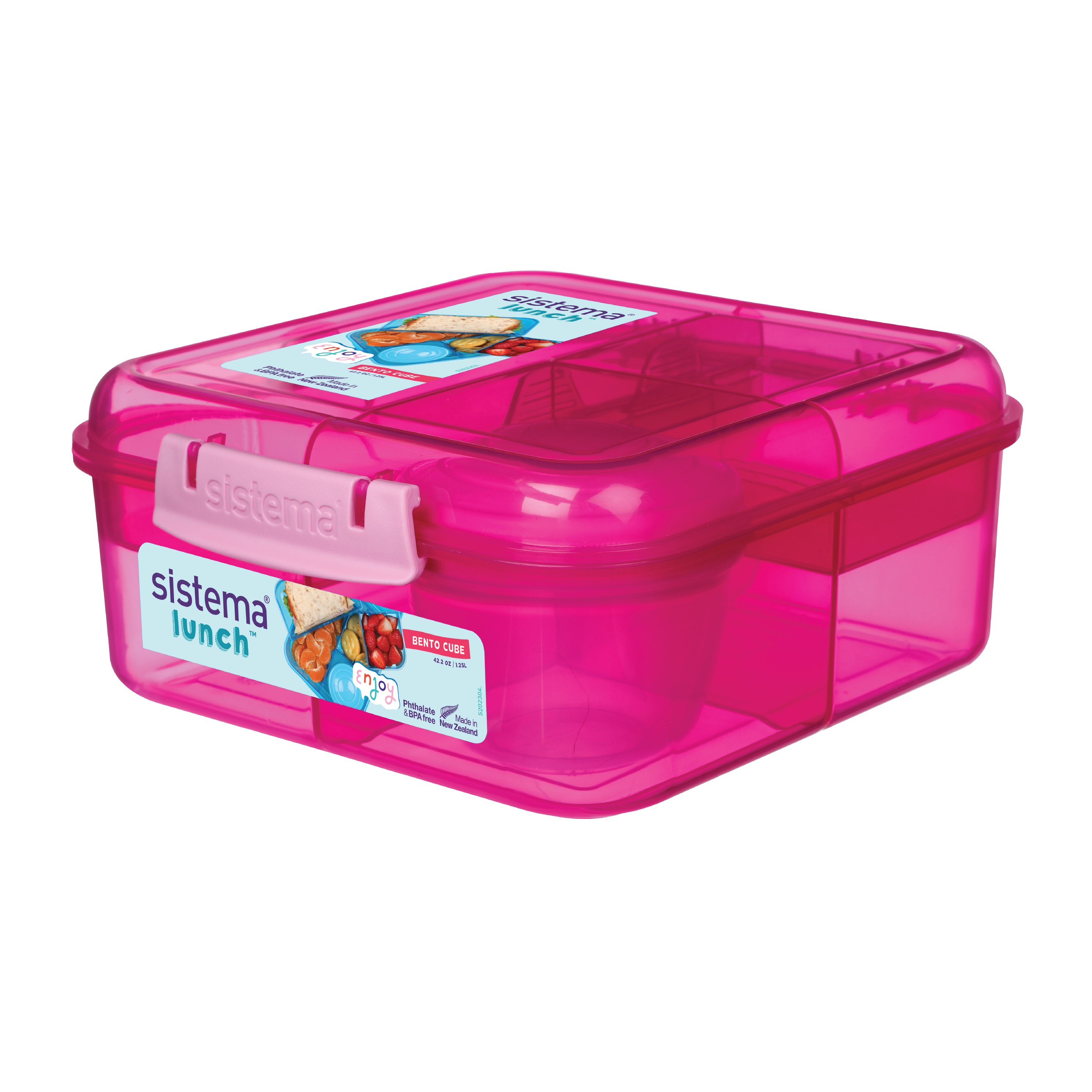 Sistema Bento Cube Matboks har en kapasitet på 1,25 liter og er delt inn i flere rom med ulike funksjoner. Rommene er avtagbare, som gjør det enkelt å tilpasse inndelingen etter behov, slik at maten holdes adskilt gjennom dagen. Matboksen inneholder også en Yogurt To Go-kopp (150 ml) som passer til oppbevaring av for eksempel nøtter, dip, oppkuttet frukt eller en liten pastasalat. Lokket er hengslet bak og lukkes med den karakteristiske Sistema-klipsen foran. Størrelsen passer godt i en skolesekk eller barnehagesekk. Matboksen tåler oppvaskmaskin på øverste hylle, kan brukes i fryser og i mikrobølgeovn uten lokk.