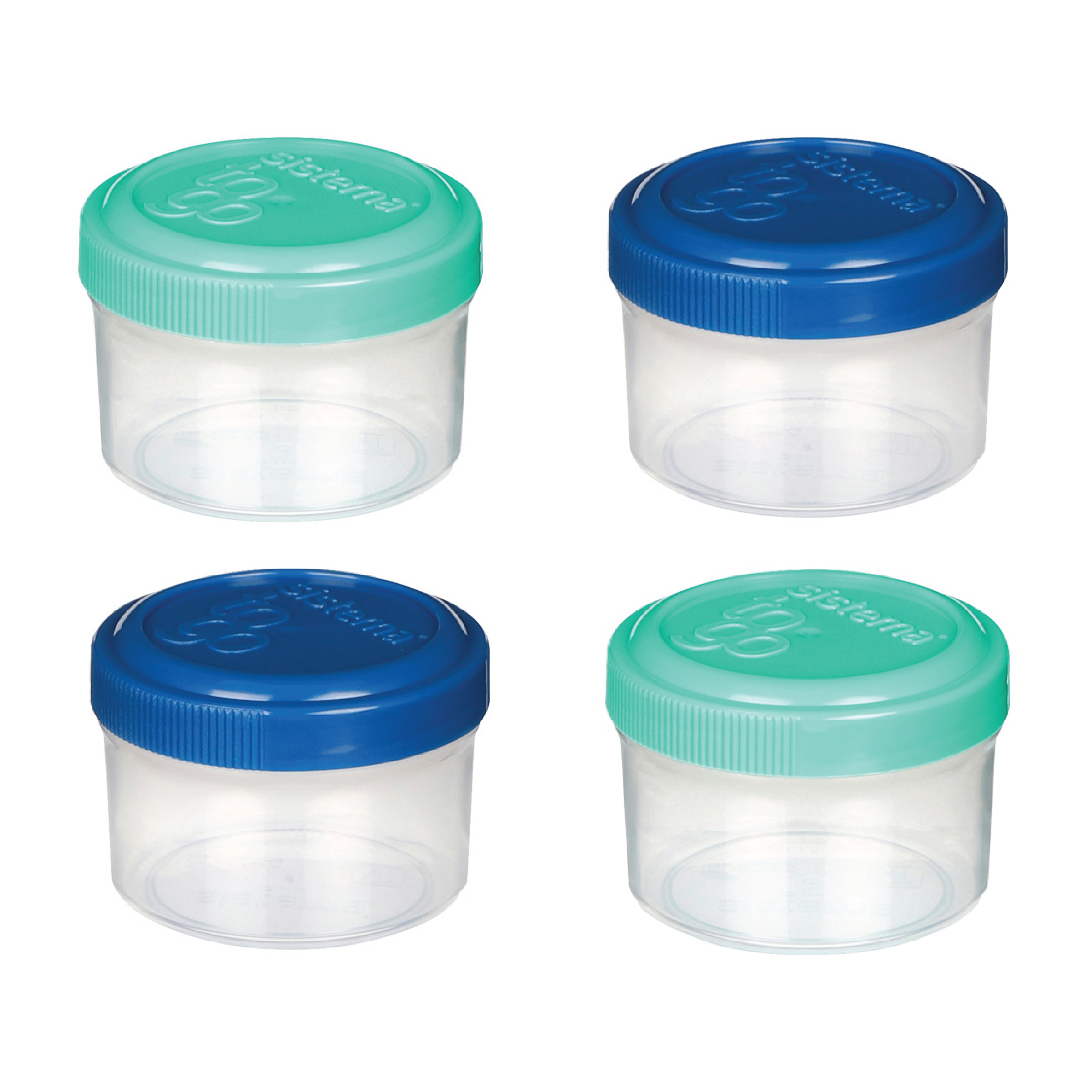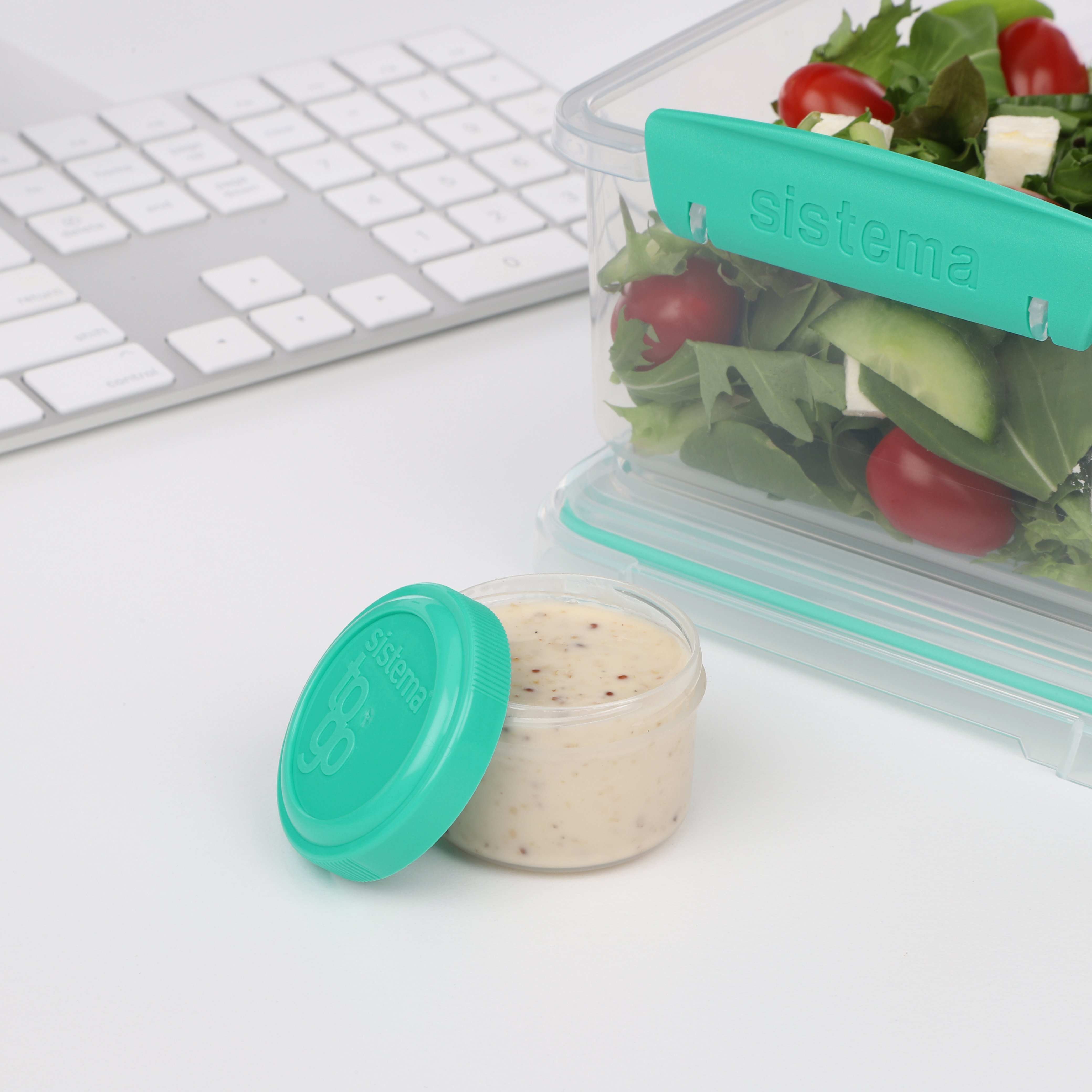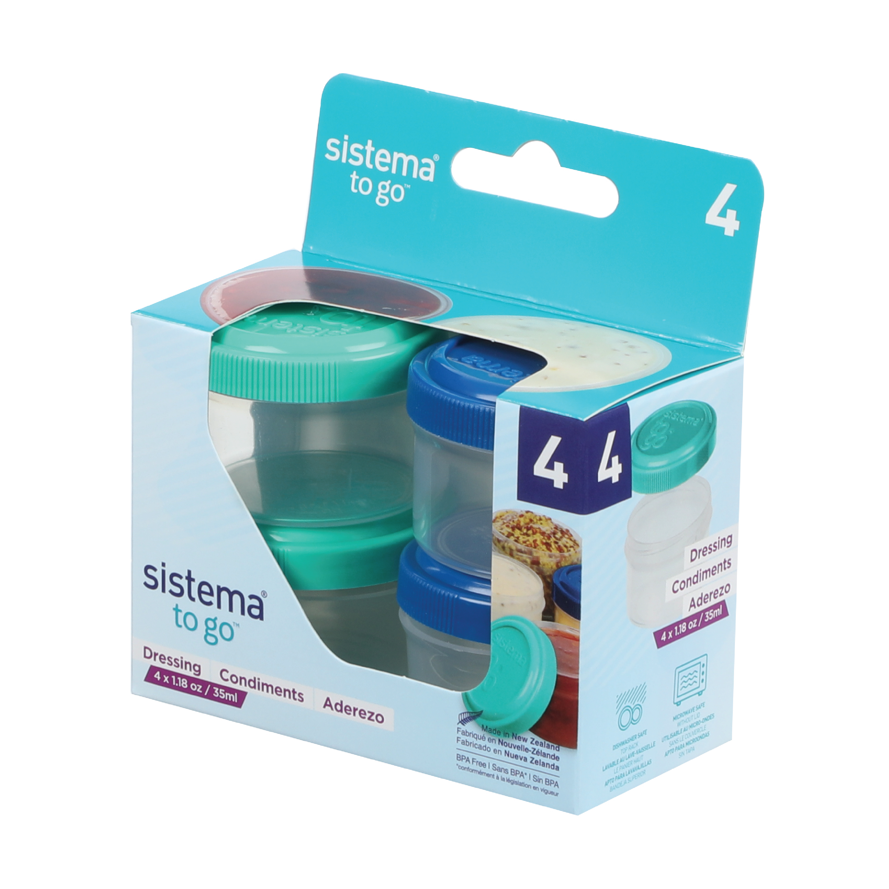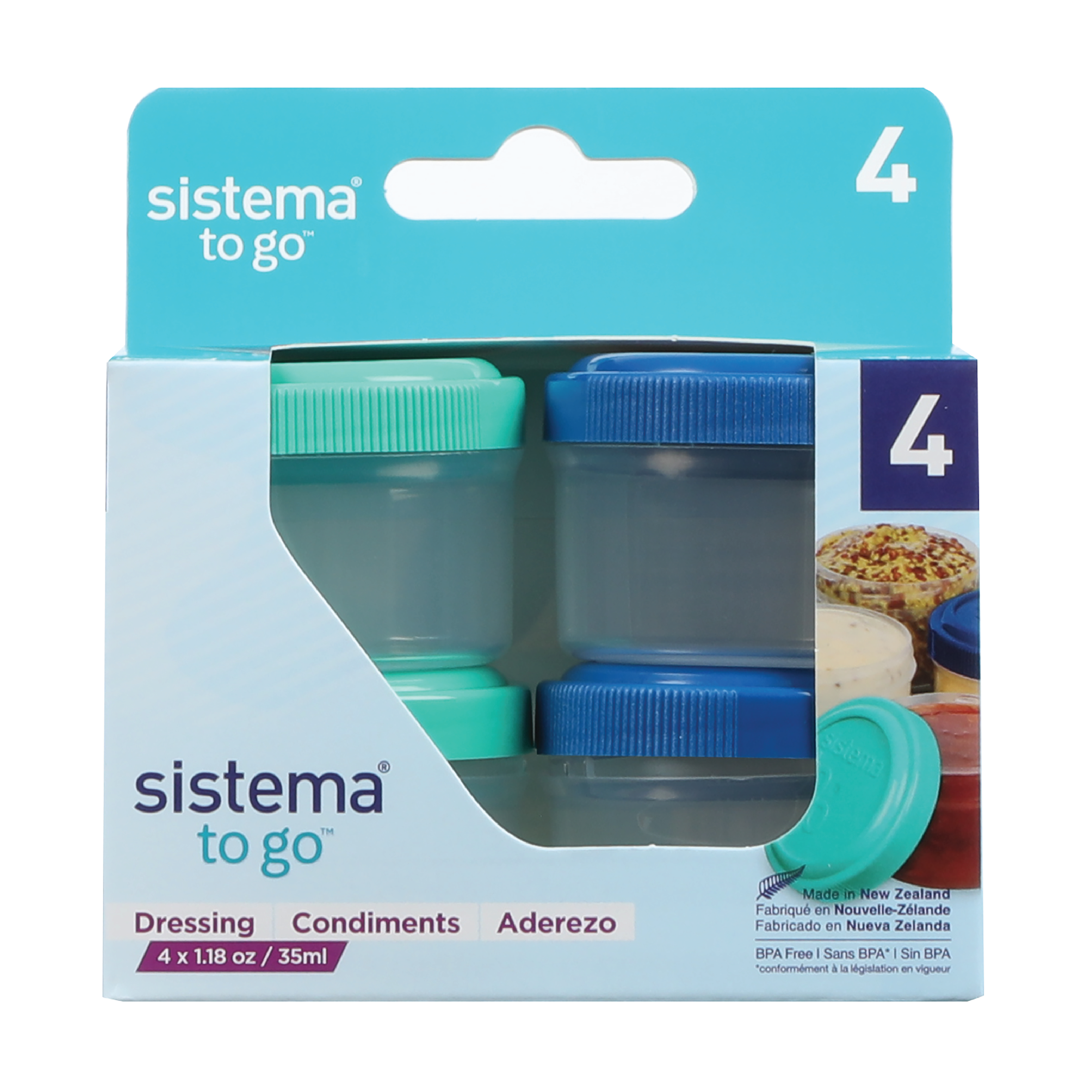 Sistema Dressing To Go inneholder fire praktiske beholdere med skrukork i smarte farger. De passer godt som tilbehør i matpakken til for eksempel dressing, rosiner, nøtter eller oppkuttet frukt. Skrukorken sørger for at boksene er tette og enkle å åpne, også for små hender. De små boksene kan også brukes til oppbevaring av småting i hjemmet, som perler og smykker. Beholderne tåler oppvaskmaskin på øverste hylle og kan brukes i fryser. Lokkene er i fargene Ocean Blue og Minty Teal.