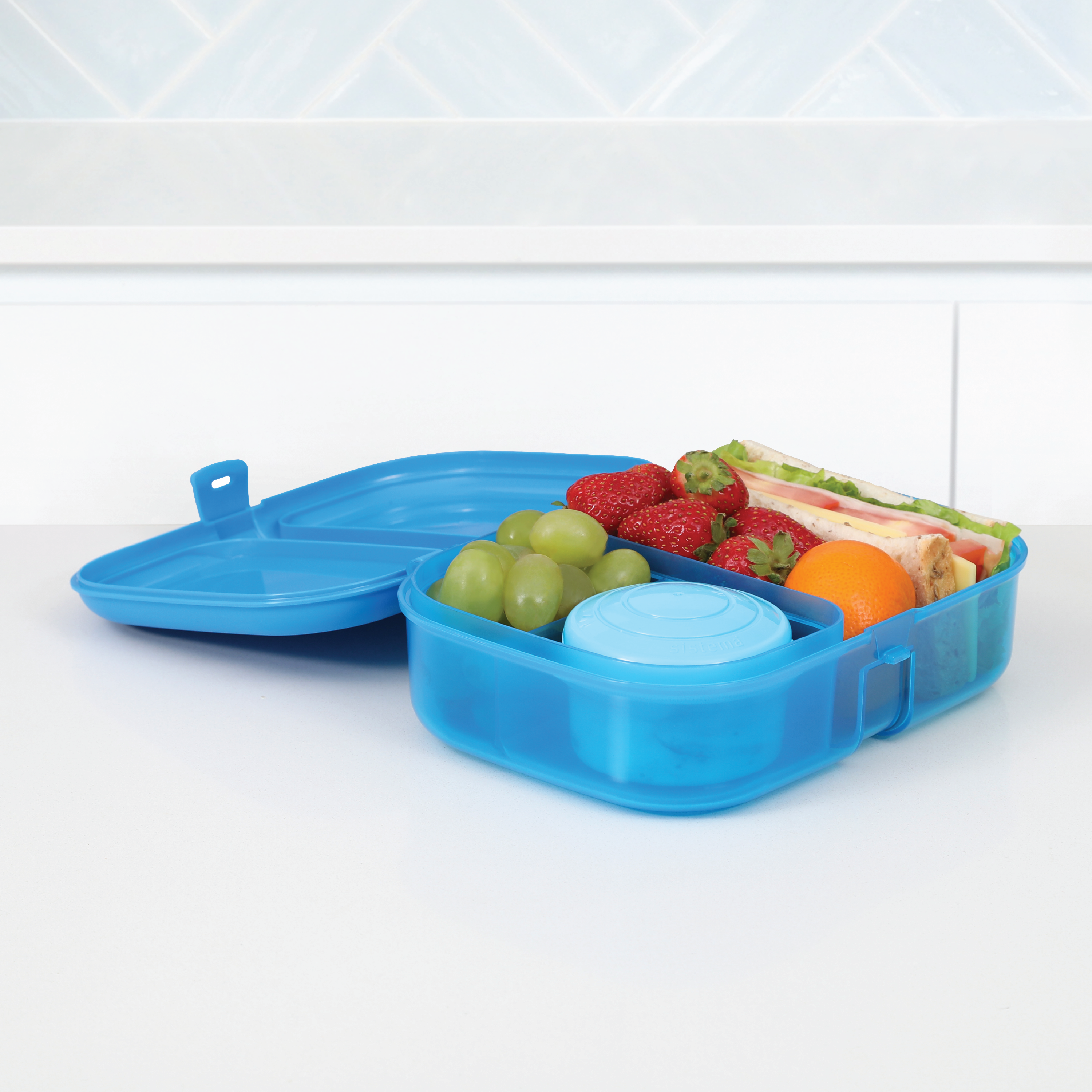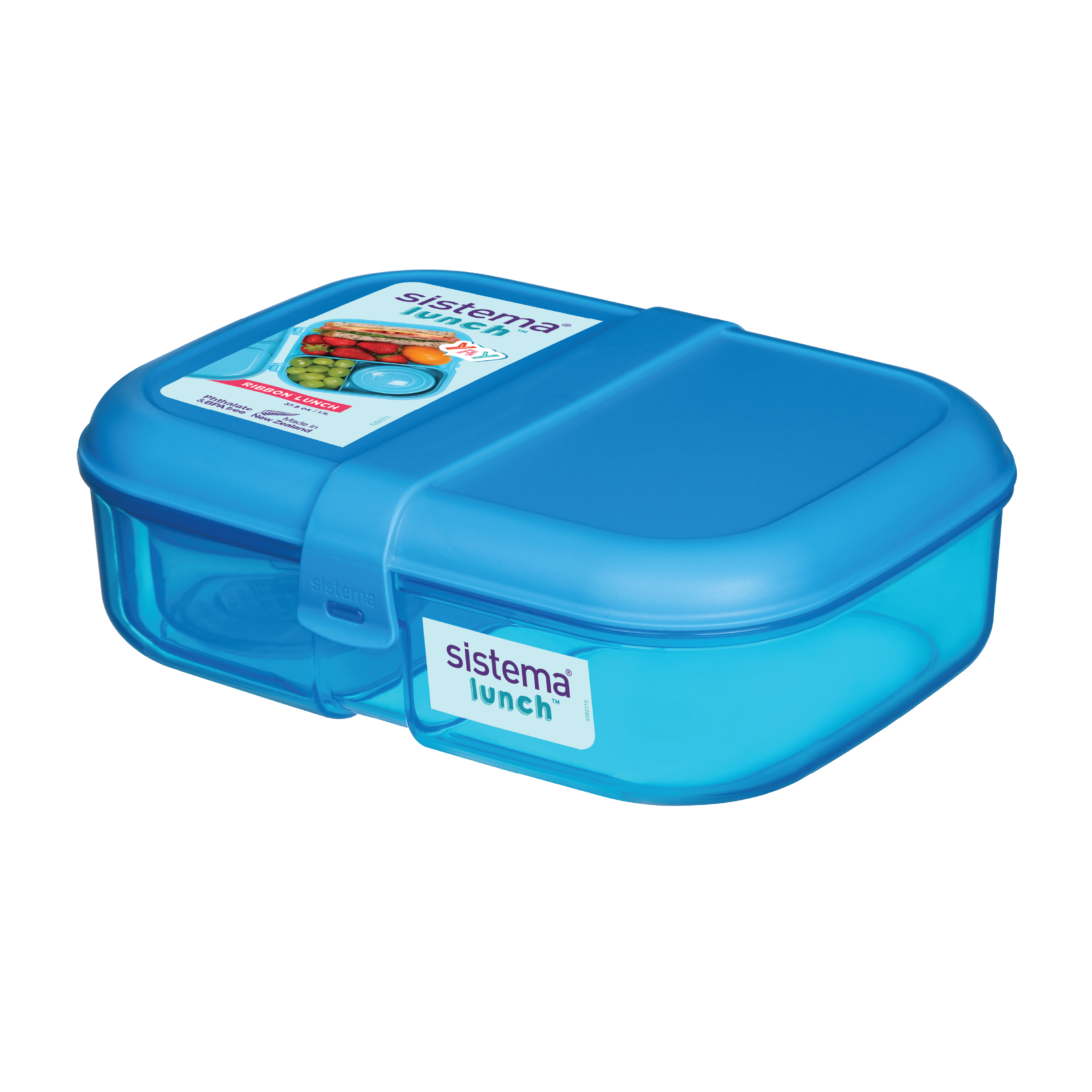Sistema Ribbon Lunch Matboks er delt inn i flere seksjoner som gjør det enkelt å skille ulike typer mat, slik at de holder seg friske hver for seg. Innsatsene kan fjernes helt for å gi mer plass i matboksen ved behov. Matboksen leveres med en rund Mini Bite To Go boks (130 ml), som passer til nøtter, dip, oppkuttet frukt eller en liten pastasalat. Den har et brukervennlig lukkesystem som også er enkelt for små barn å håndtere. Matboksen tåler oppvaskmaskin på øverste hylle, kan brukes i fryser og i mikrobølgeovn uten lokk.