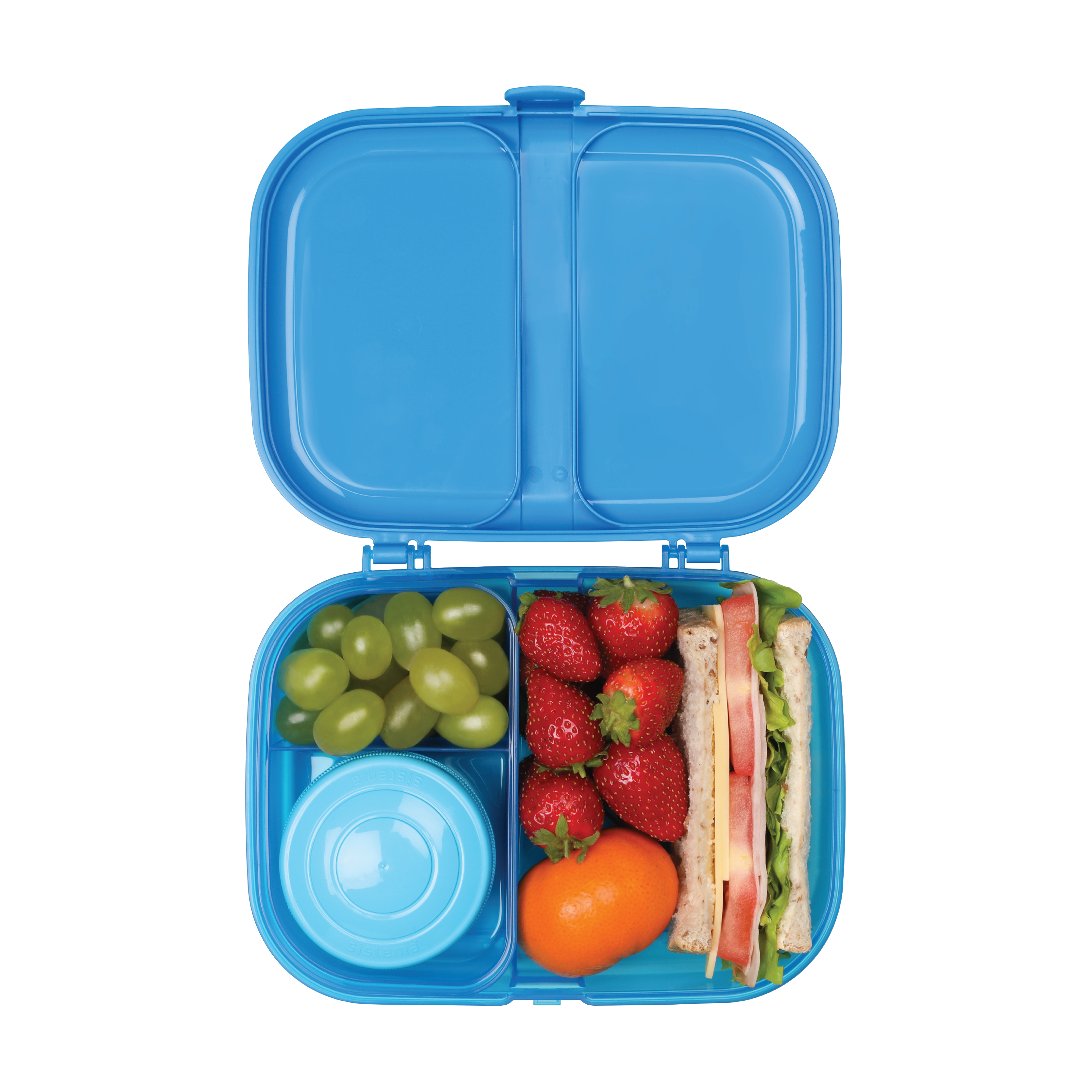 Sistema Ribbon Lunch Matboks er en romslig matboks med flere seksjoner som holder mat og tilbehør adskilt gjennom dagen, i fargen blå.