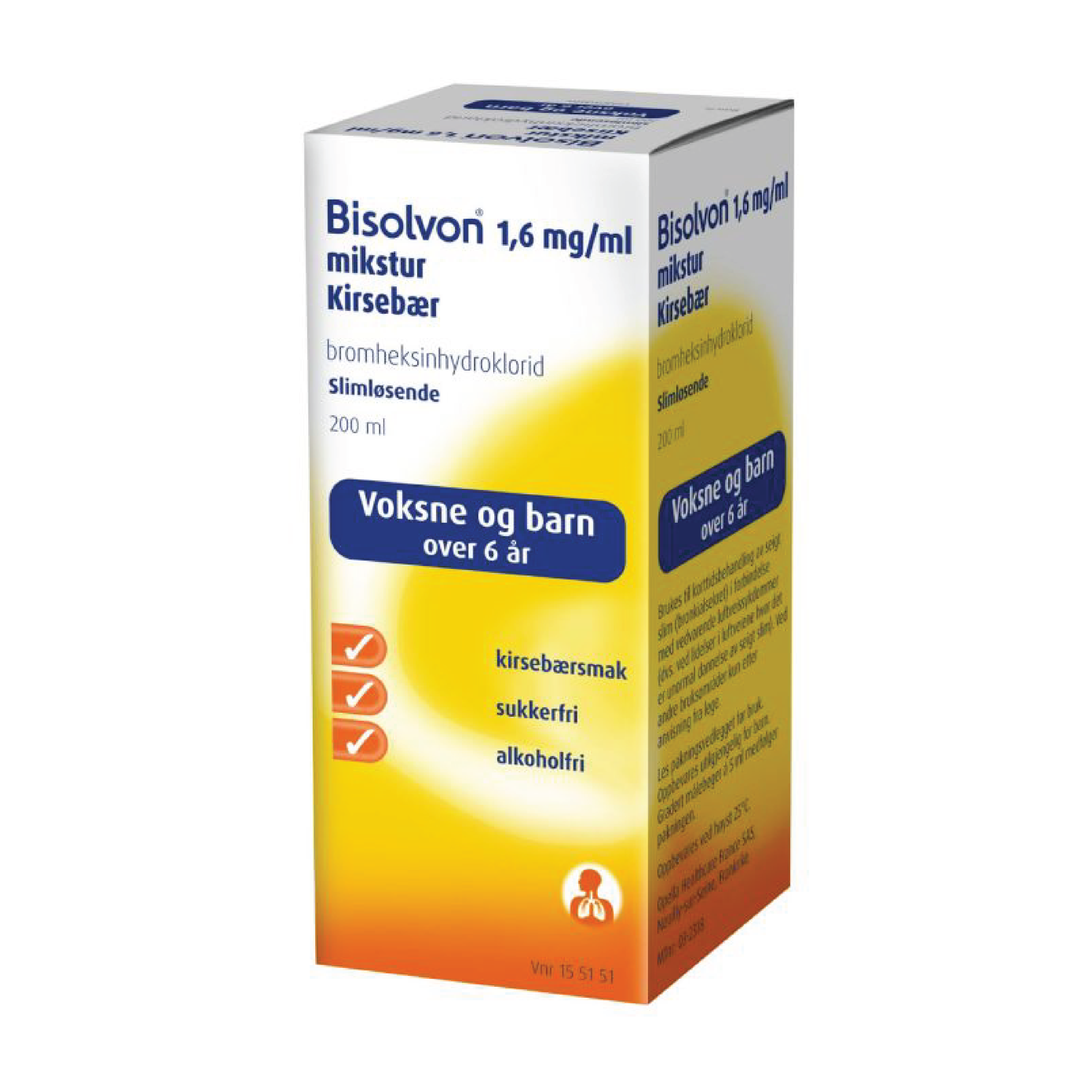Bisolvon Mikstur 1,6 mg/ml kirsebær er et reseptfritt legemiddel som brukes til korttidsbehandling av seigt slim (bronkialsekret) i forbindelse med vedvarende luftveissykdommer, til voksne og barn over 6 år.