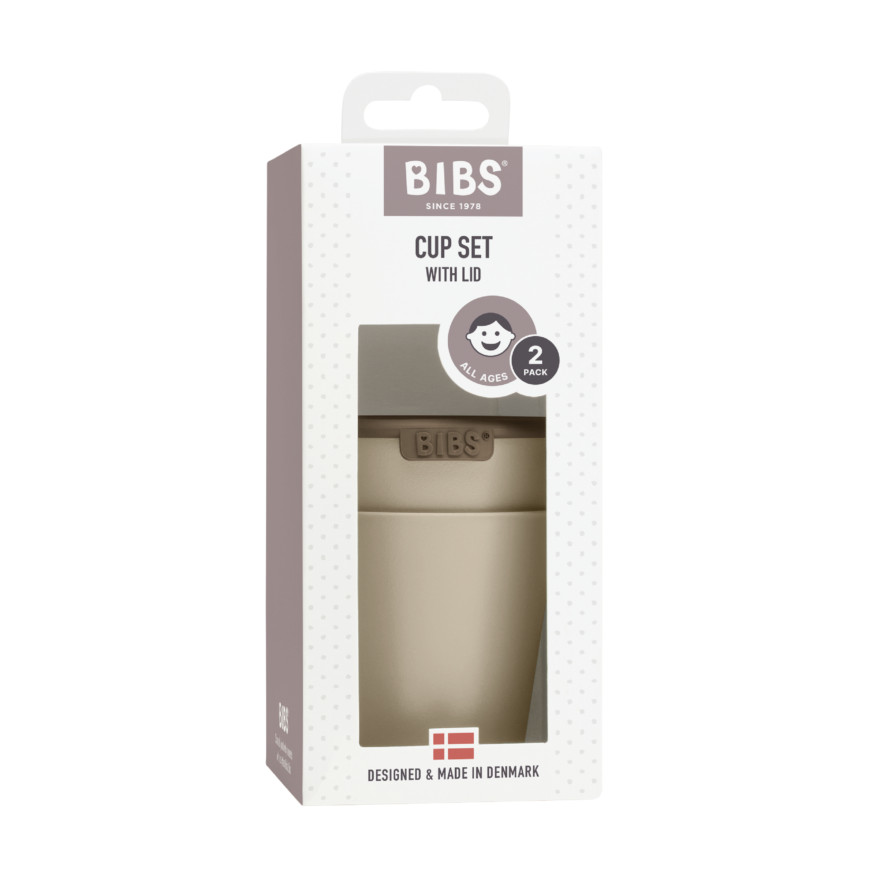BIBS Cup Set er et koppesett med to åpne kopper og lokk, utviklet for å støtte barnets utvikling av drikkeferdigheter.