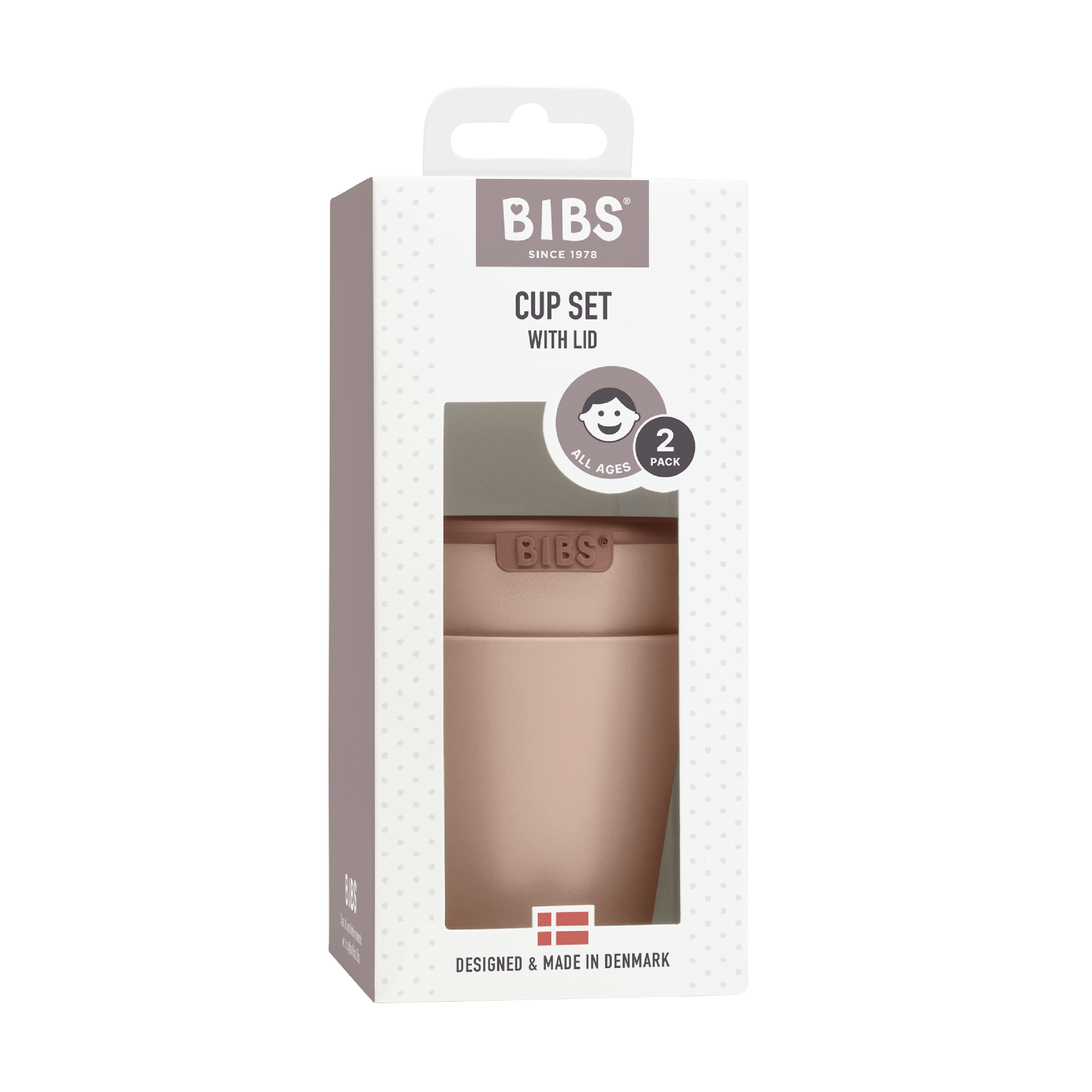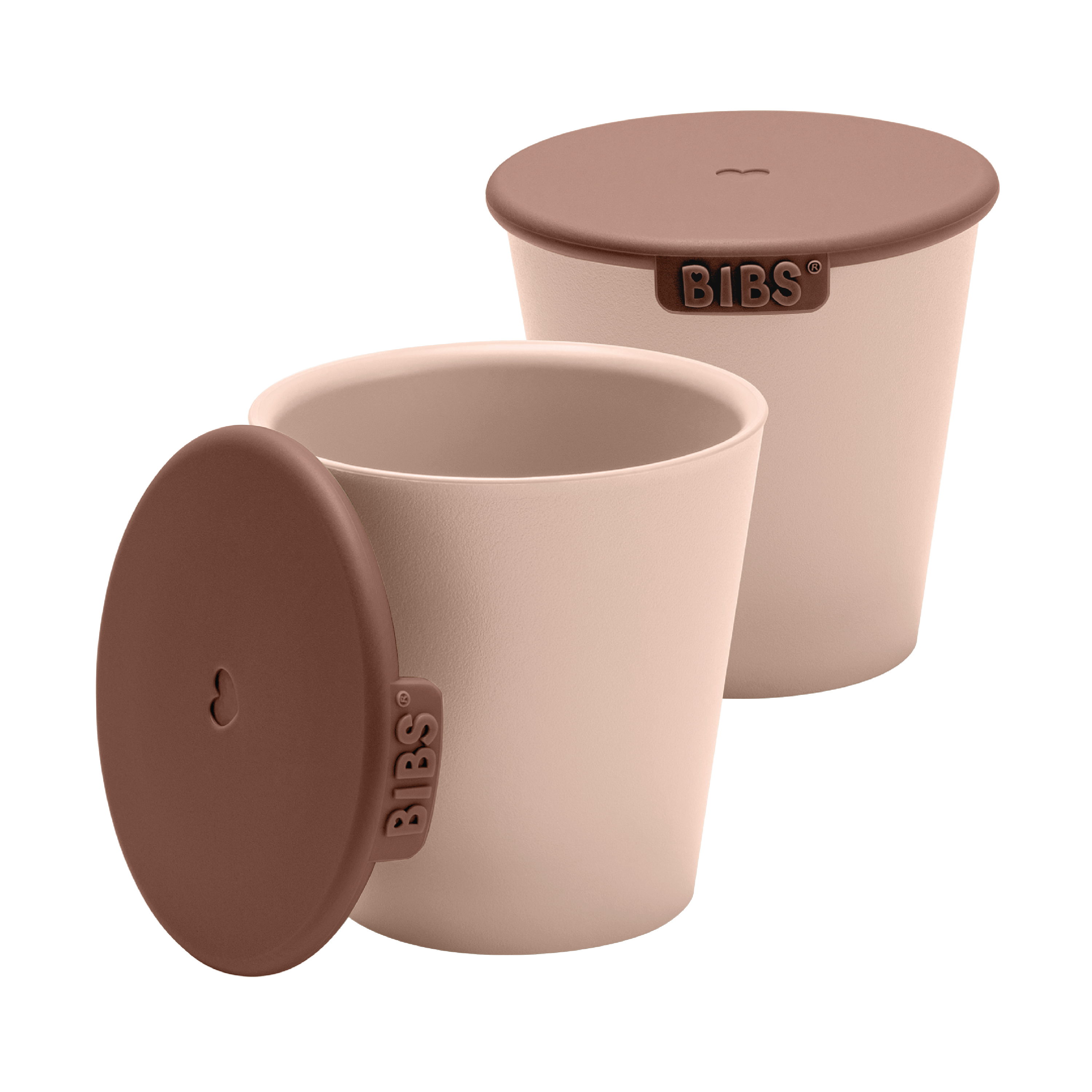 BIBS Cup Set er et koppesett med to åpne kopper og lokk, utviklet for å støtte barnets utvikling av drikkeferdigheter.