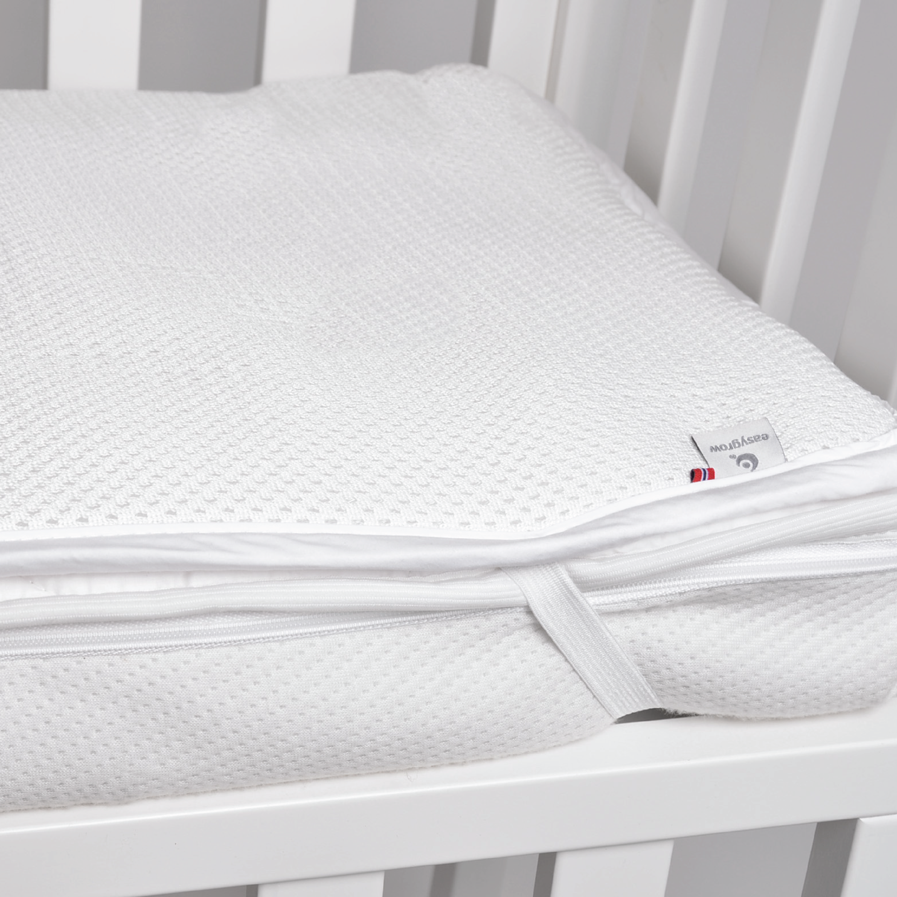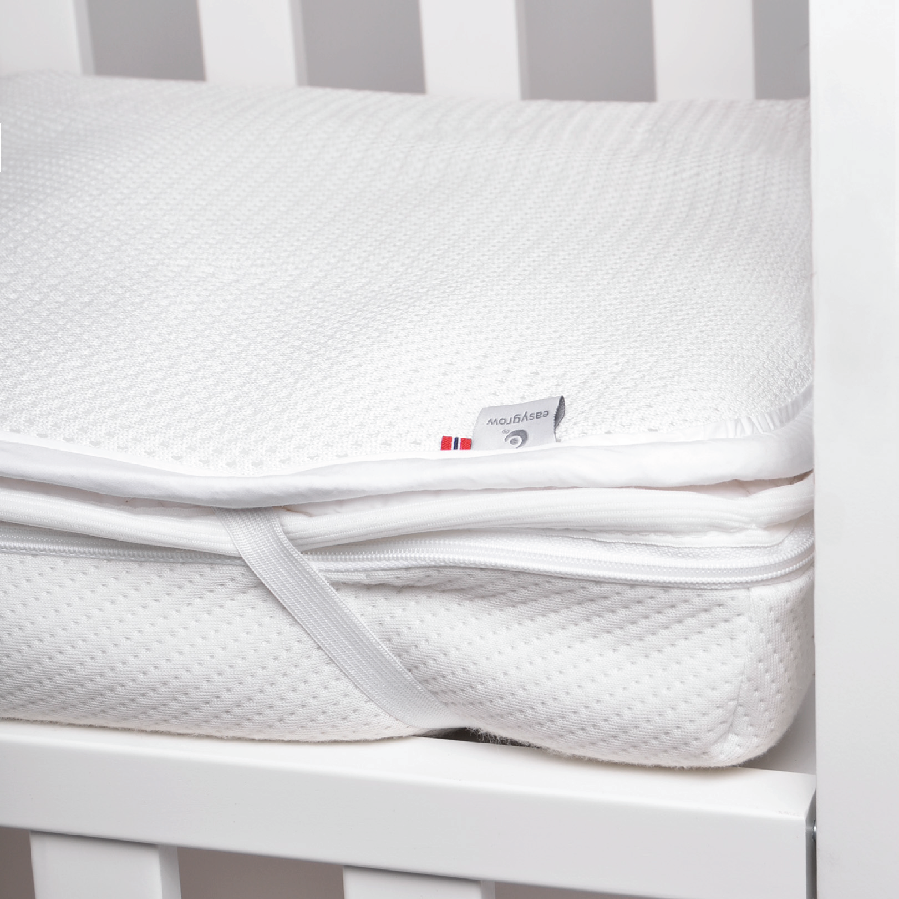 Easygrow Luftig overmadrass er en pustende overmadrass som fungerer som en madrassbeskytter, og bidrar til et tørt og komfortabelt sovemiljø for babyen.
