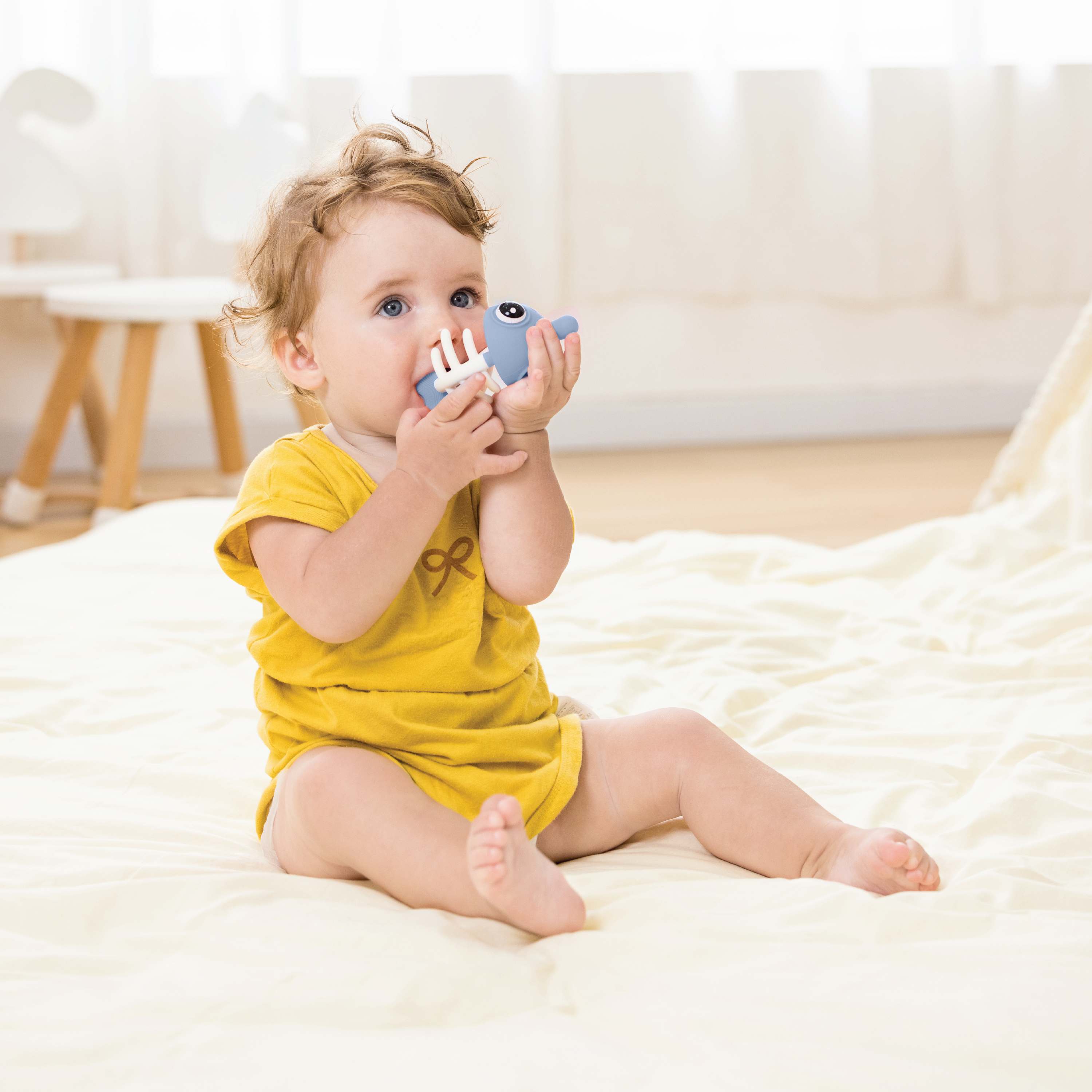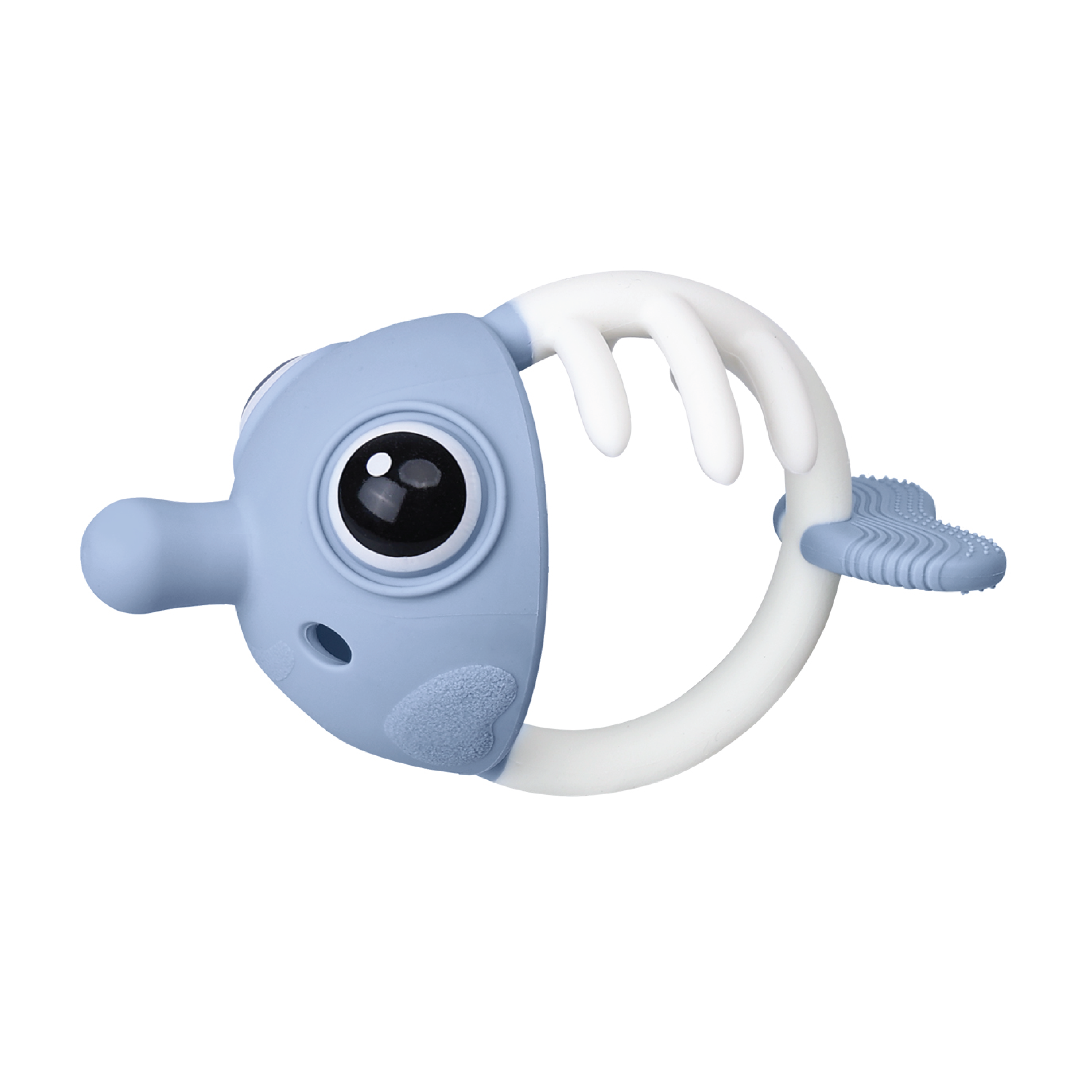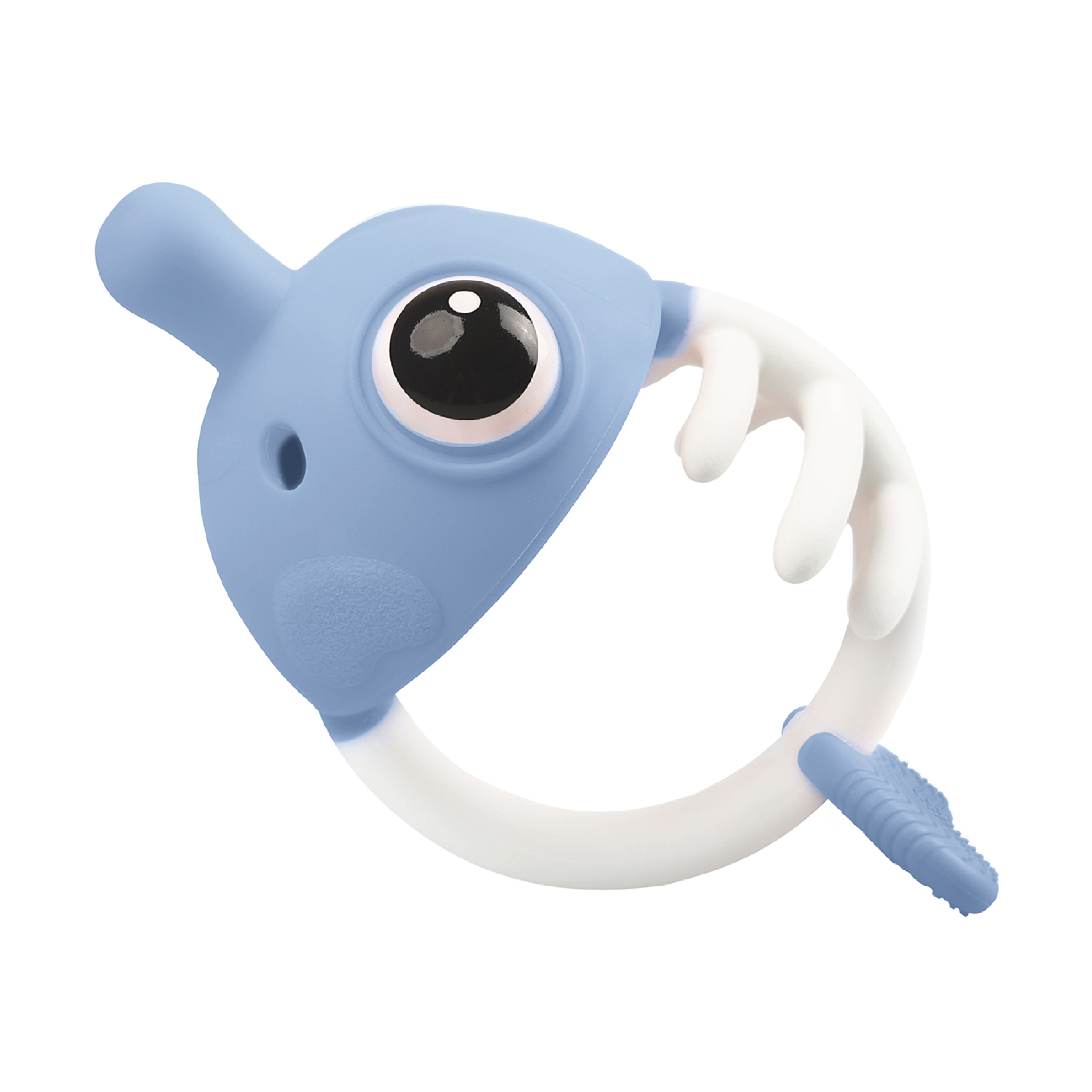 Mombella Clownfish Biteleke er laget av 100 % matsikker silikon og er utviklet som en 3-i-1 biteleke som kombinerer trøst, lek og utvikling. Den smokkformede nesen gjør den godt egnet for babyer som ikke tar vanlig smokk, mens myke teksturer og pop-up øyne stimulerer både munn, hender og sanser. Biteleken kan bidra til å gi lindring ved tannfrembrudd og støtter samtidig babyens motoriske og kognitive utvikling gjennom utforskning og lek.