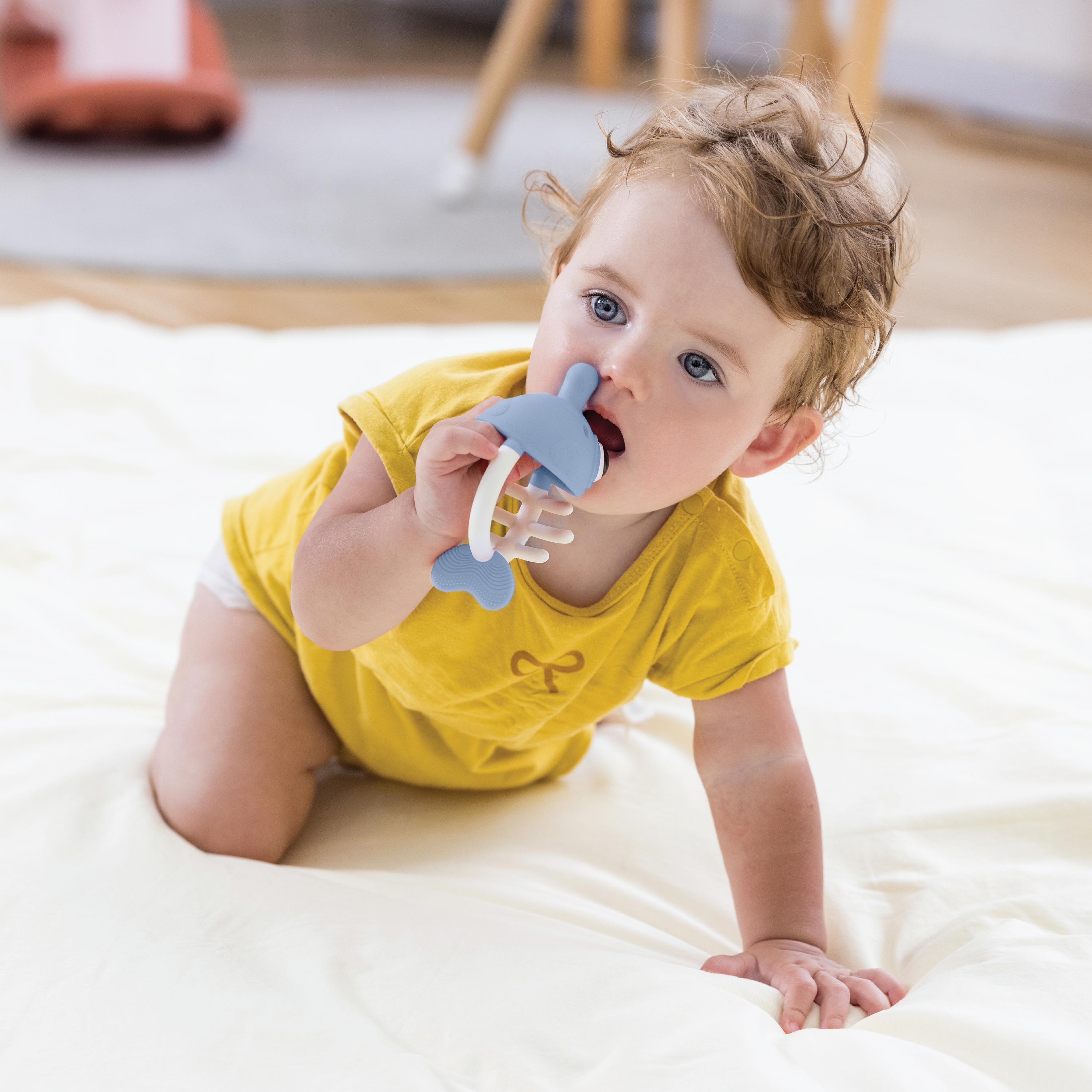- Biteleke med smokkfunksjon som bidrar til lindring ved tannfrembrudd.
