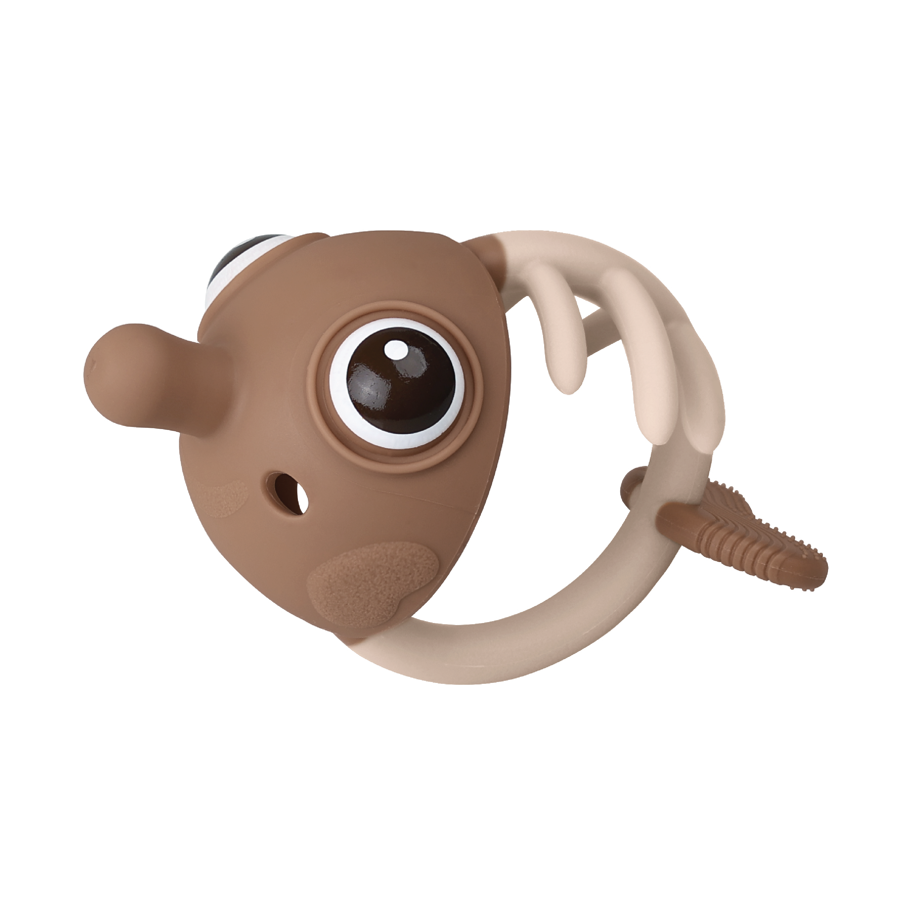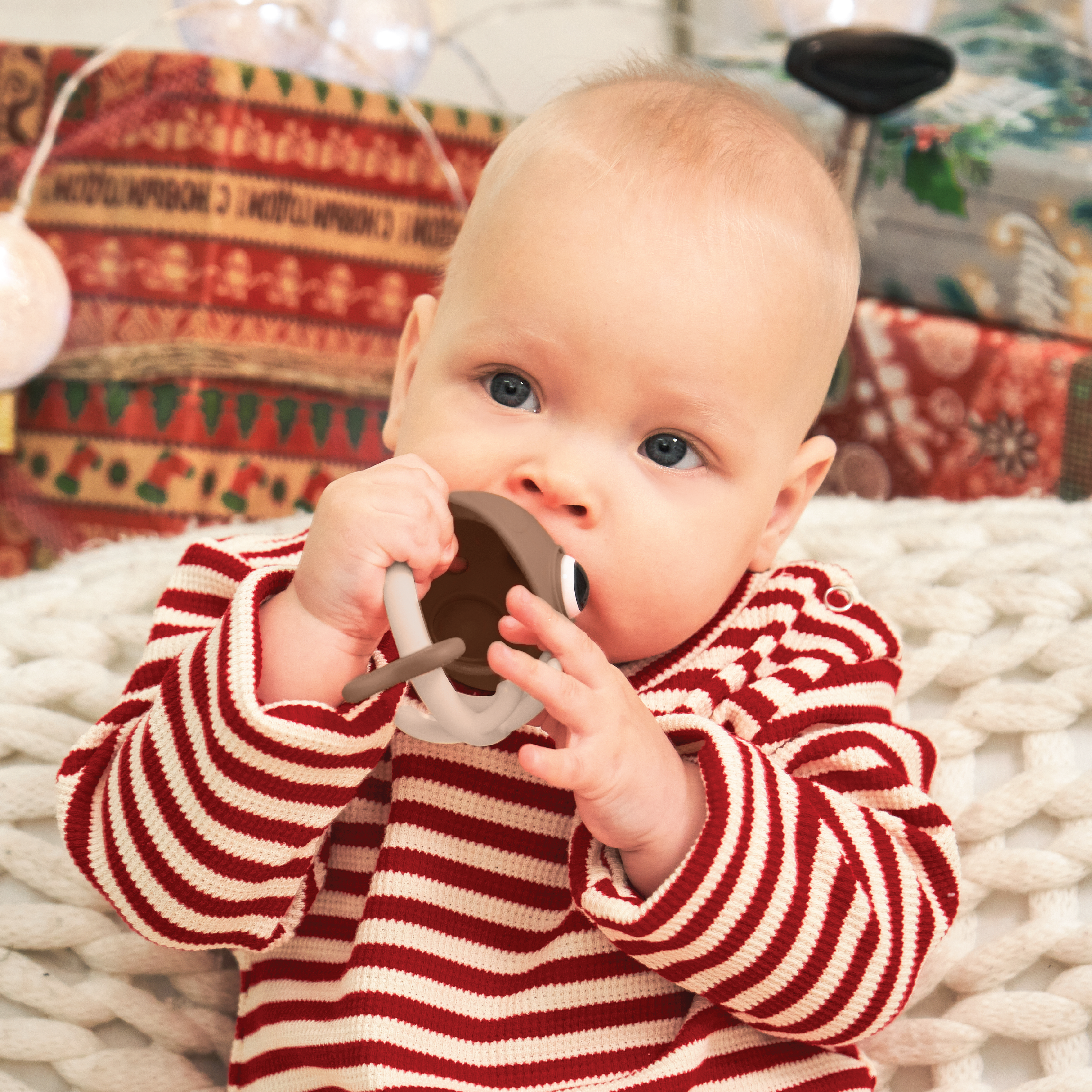 - Biteleke med smokkfunksjon som bidrar til lindring ved tannfrembrudd.