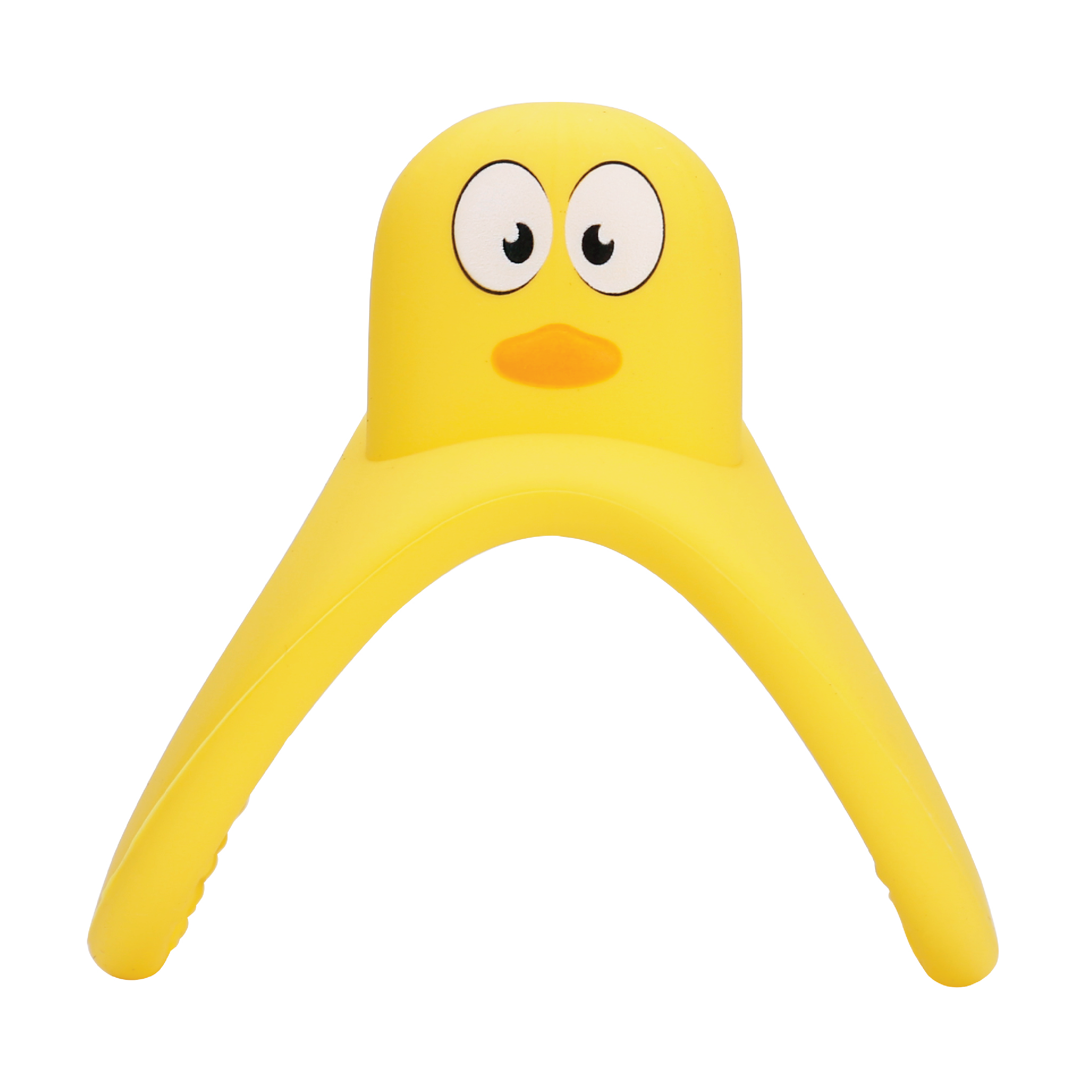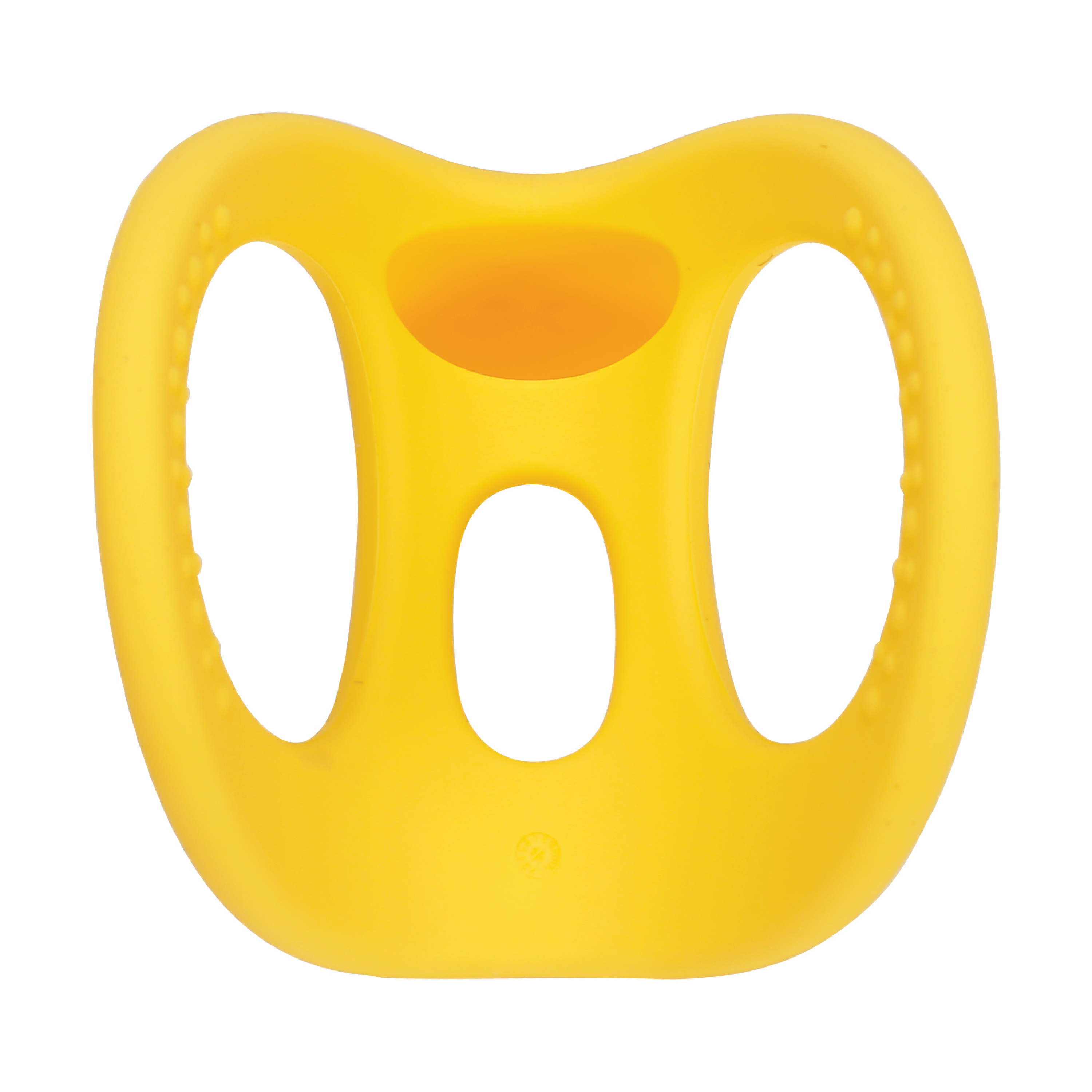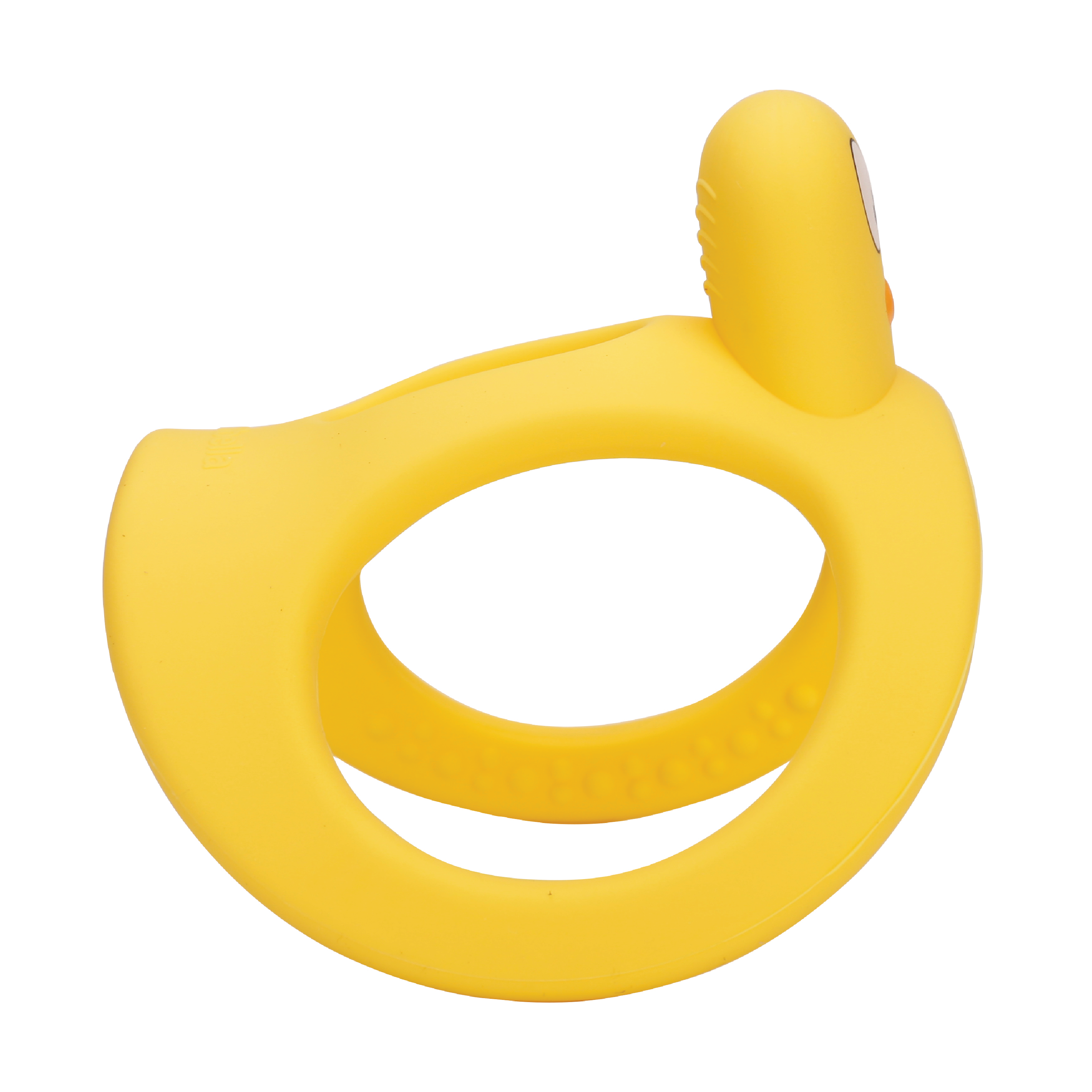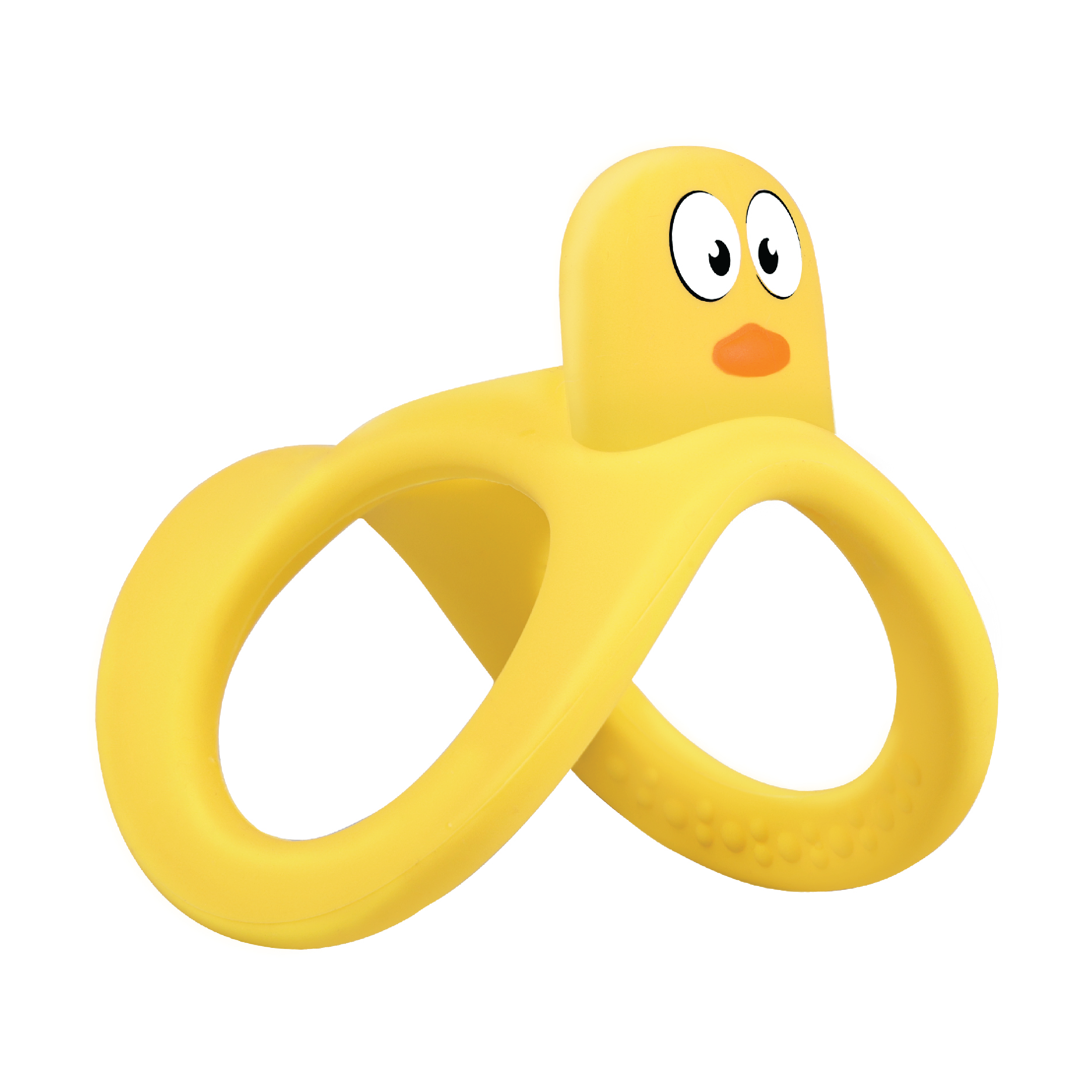 Mombella Yellow Duck Biteleke er en myk og tøyelig biteleke med to-håndsgrep som er enkel for babyen å holde og som bidrar til variert stimulering av gummene.