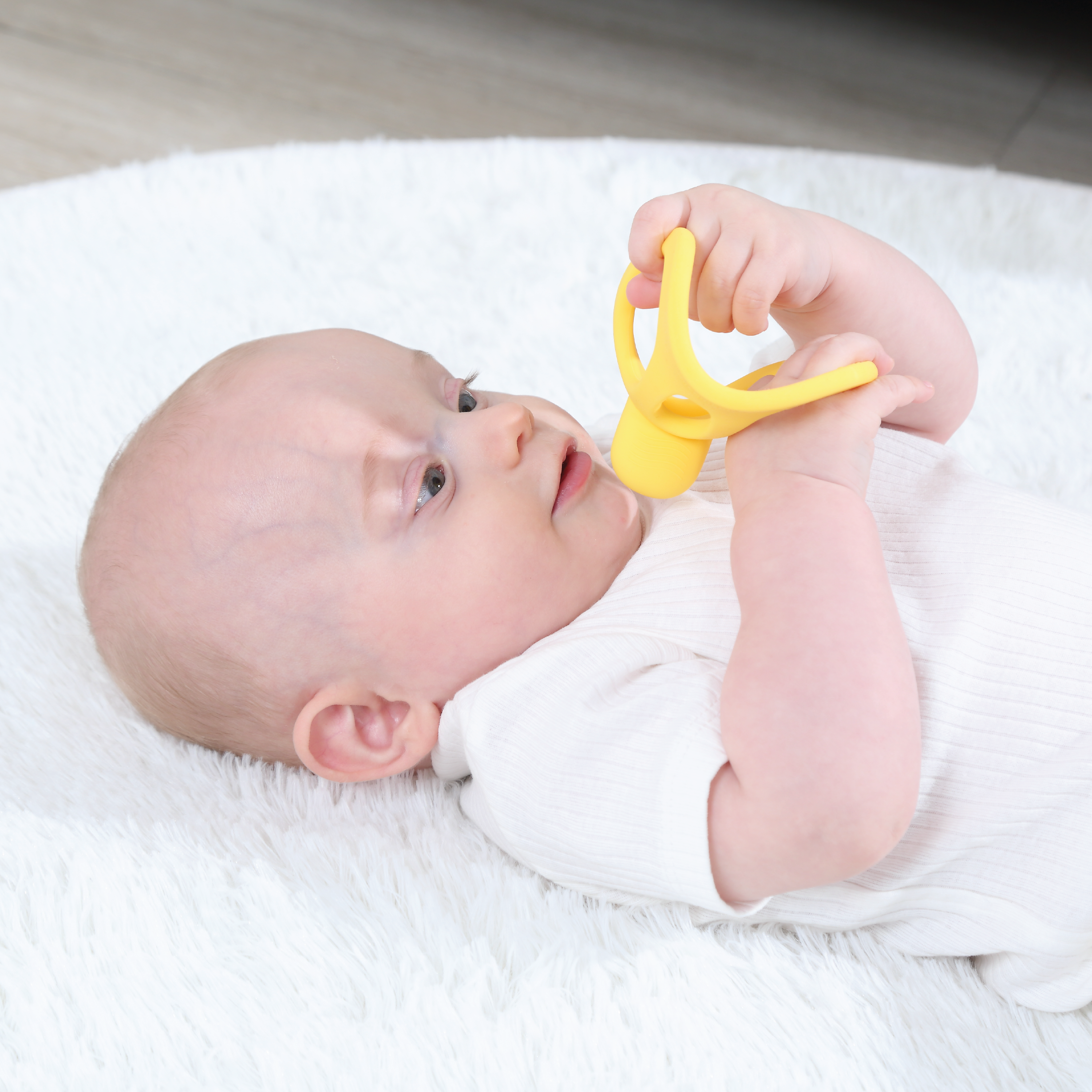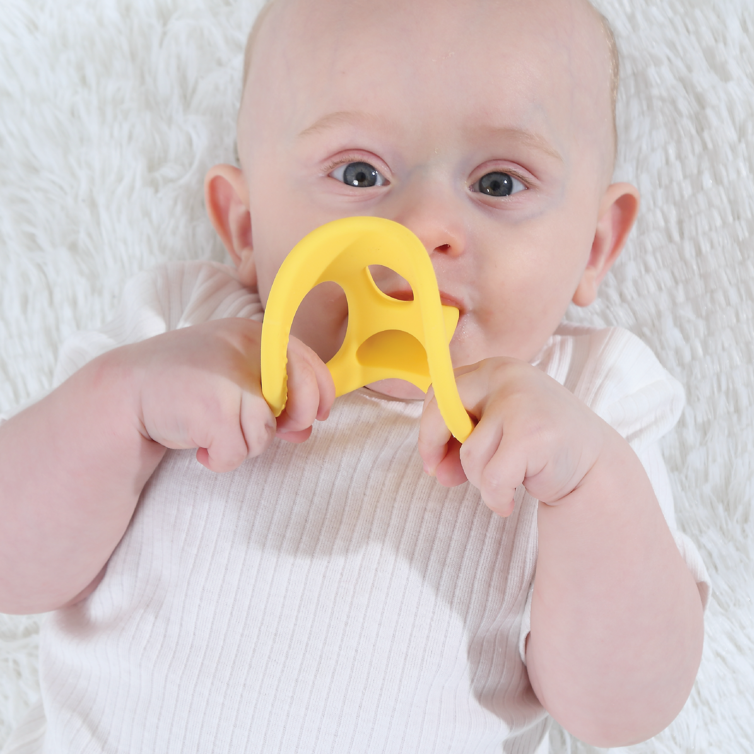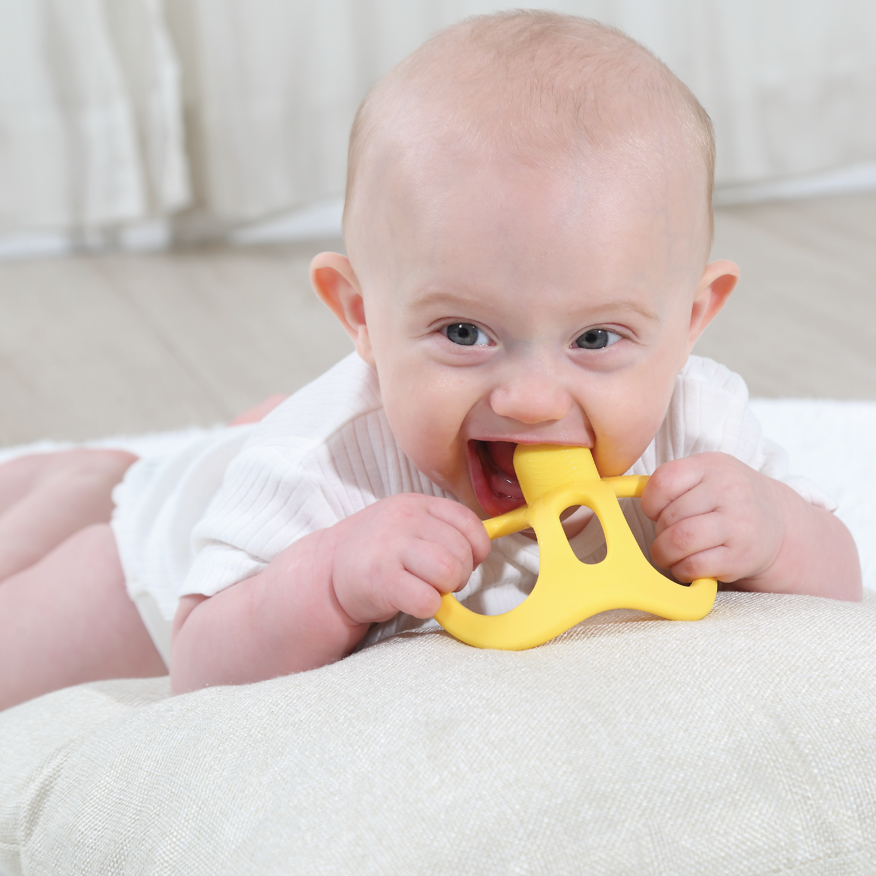 Mombella Yellow Duck Biteleke er laget av FDA-godkjent silikon av matkvalitet og har ulike teksturer på overflaten som bidrar til å roe og stimulere babyens gummer. Biteleken er utviklet av en tannspesialist, og alle sider har en funksjon som er designet for trygg lek og variert stimulering. Den tåler oppvaskmaskin, mikrobølgeovn og fryser, og er enkel å holde ren og hygienisk.