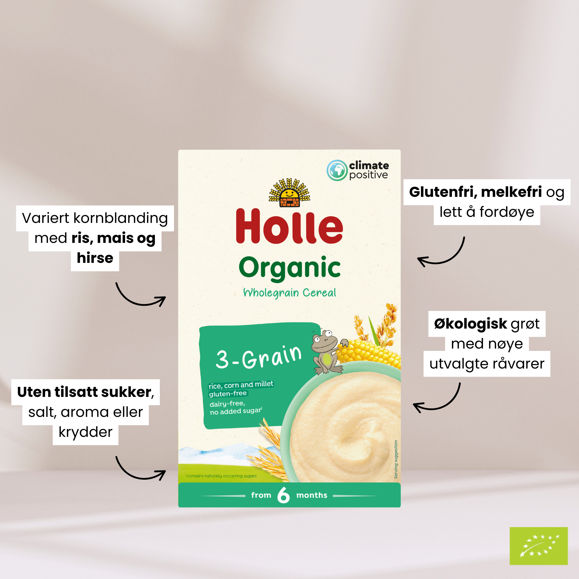 Holle 3-Kornsgrøt er en glutenfri og melkefri babygrøt av økologisk hirse, til barn fra 6 måneder.