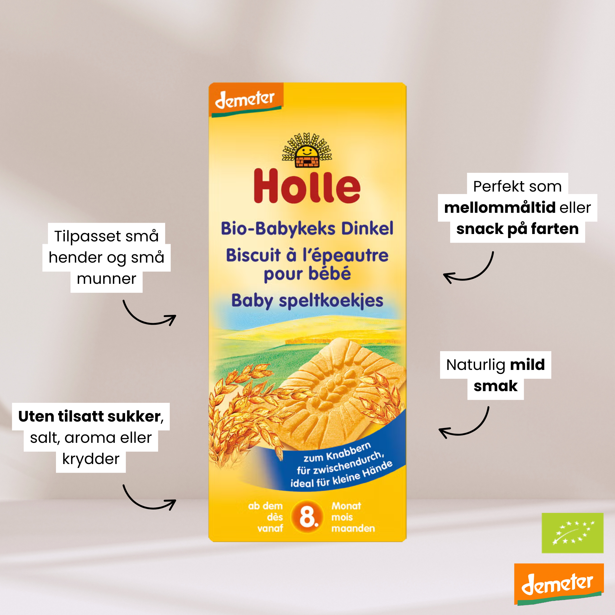Holle Speltkjeks Baby er et lite mellommåltid til baby og barn fra 8 måneder.