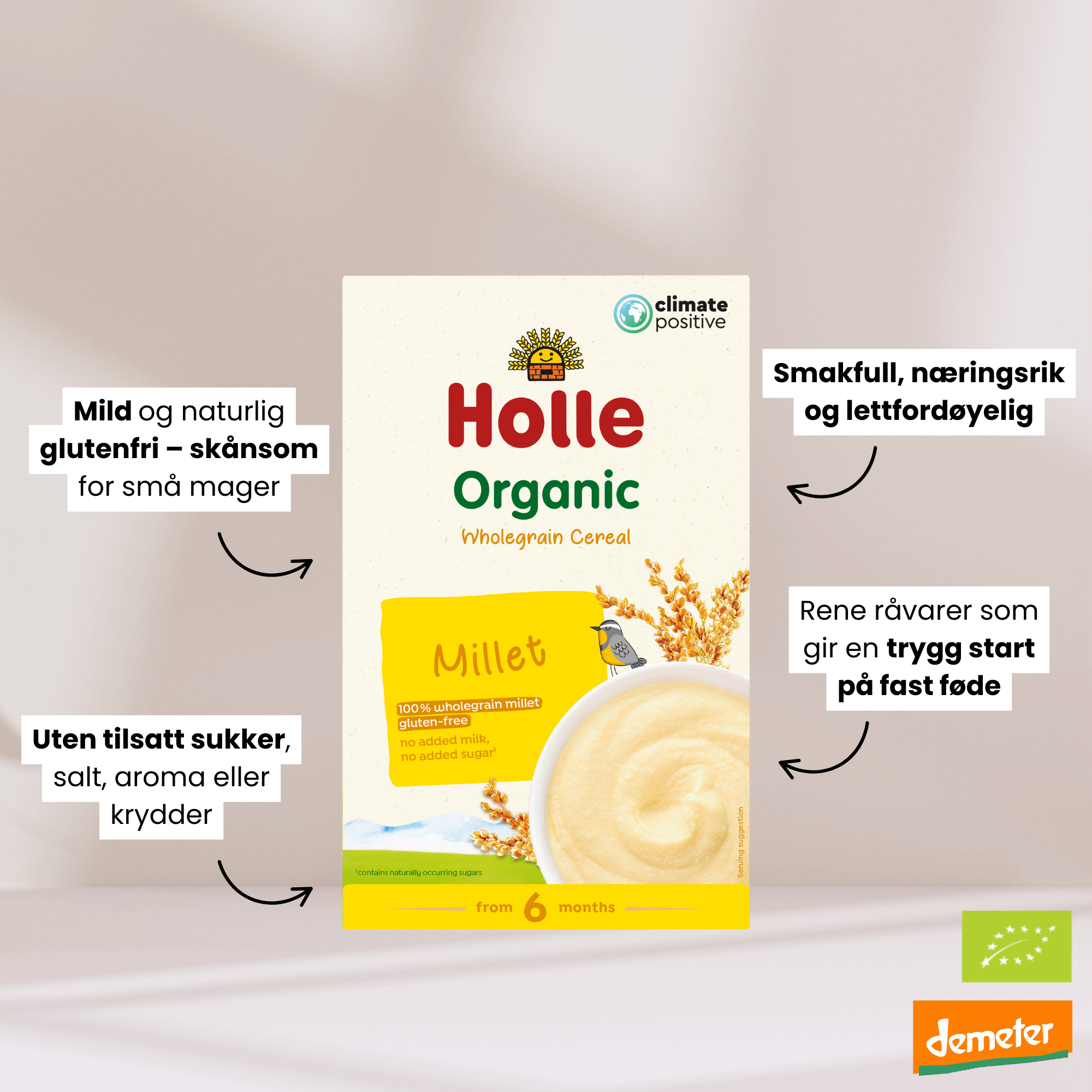 Holle Hirsegrøt er en glutenfri og melkefri babygrøt av økologisk hirse og ris, til barn fra 6 måneder.