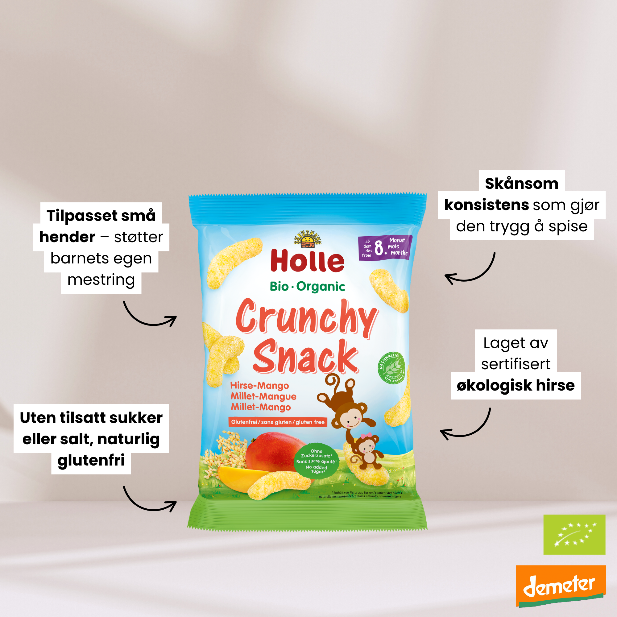 Holle Puffet Hirse Snack med mango er et perfekt mellommåltid til barn fra 8 måneder.