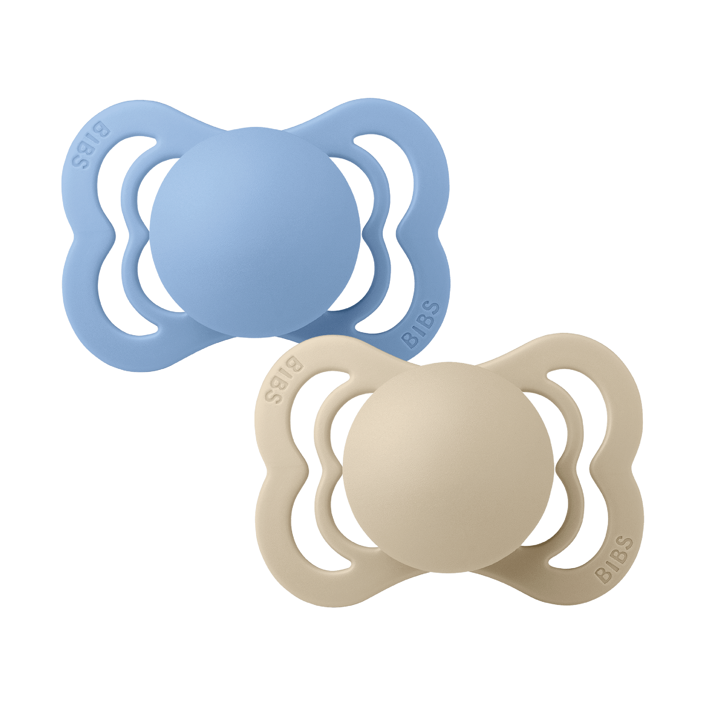 BIBS Supreme Silicone Smokk Str. 1 er smokker med et bredt skjold og ventilasjonshull, med en flat, dråpeformet og symmetrisk sugedel laget av silikon.